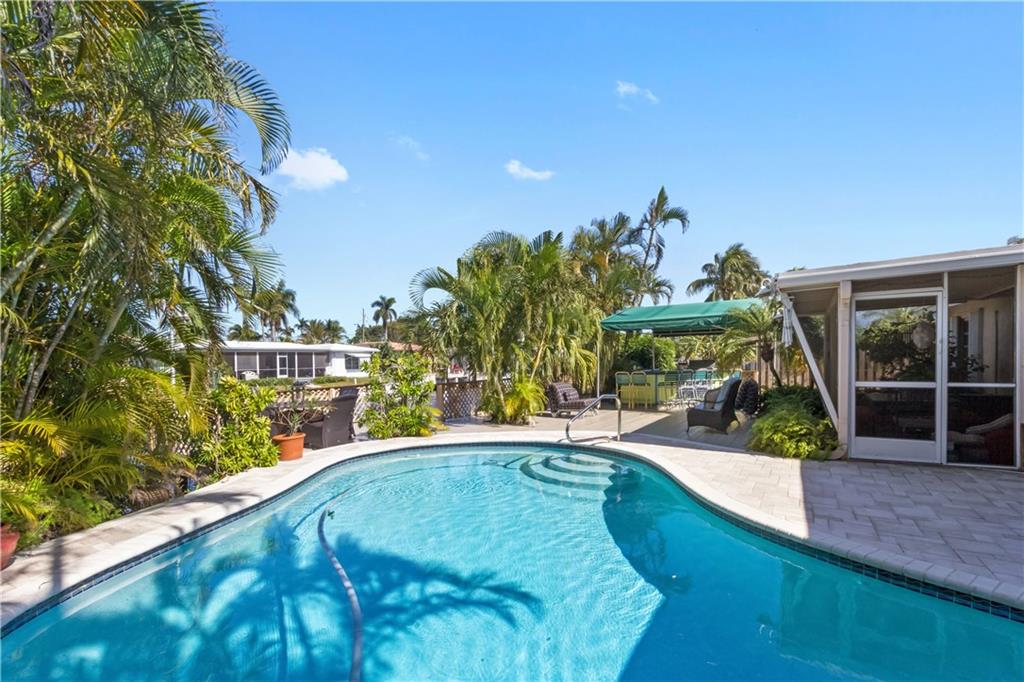 Situated on a wider canal and minutes to the Intracoastal from this waterfront pool home. Recent new A/C and blown attic insulation, remodeled kitchen with stainless steel appliances, custom cabinetry and granite countertops ++ extra bonus room for guests or hobby room. French doors from living & dining rooms to screened patio, pool deck and summer kitchen. Tropical landscaping providing privacy. Security system, hurricane shutters, pavered driveway, bi-level dock with 70 ft. on the water for your boat and waterfront dining opportunities. Close to beaches, shopping and I-95. Best bang for the buck at $519,500, come see it today.