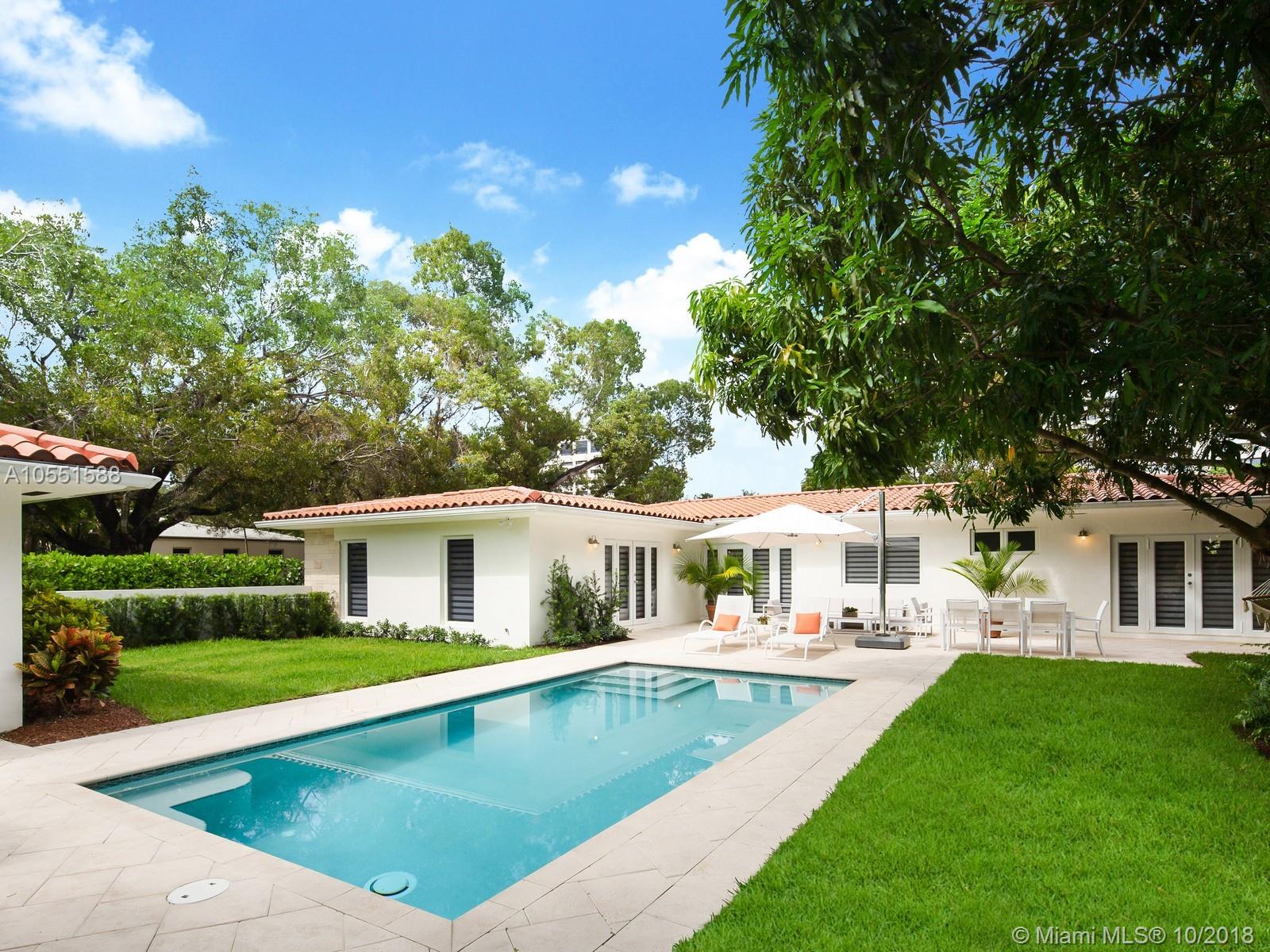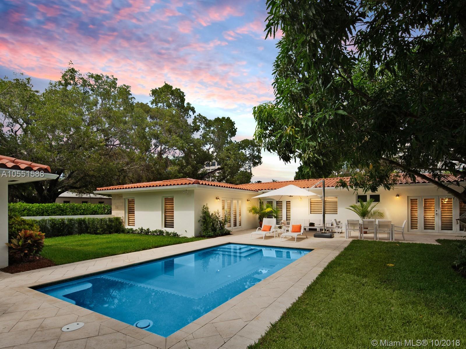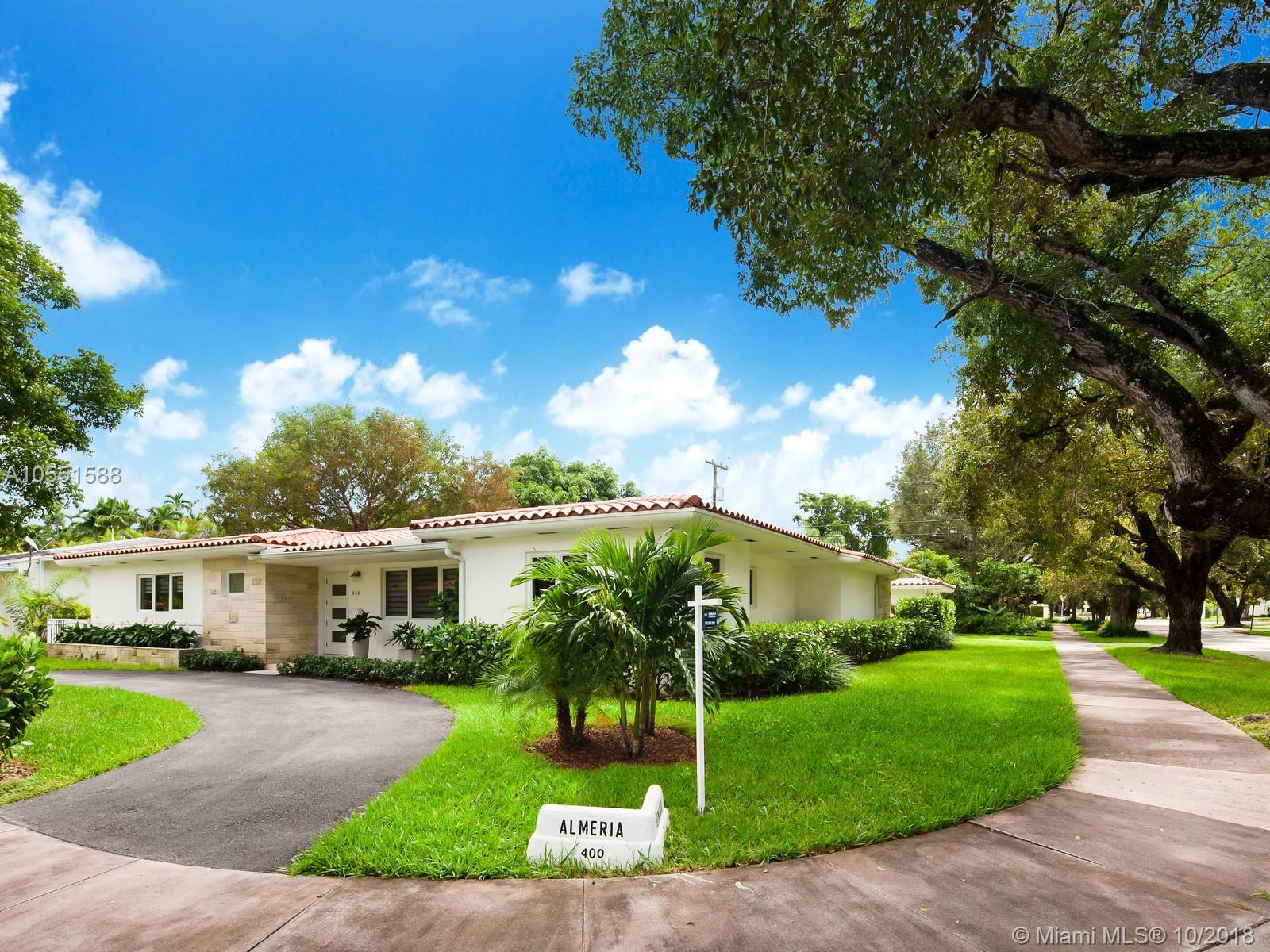 Amazing Oasis walking distance to Miracle Mile: L shaped & sitting on an oversized corner lot of 11,254sf, this elegant home is located in the very quiet and beautiful tree lined Almeria.Completely renovated in 2014 natural light floods thru all rooms embracing the exotic and lavish views of a tropical garden featuring a generous mango tree.High ceilings, neutral Terrazo/marble floors,elegant plain wood doors throughout,energy efficient solar shades & impact windows/doors have been thoughtfully added to this complete makeover.Large open kitchen w/endless quartz countertops for seasoned cooks & a bar to entertain.Large paved patio giving way to a brand new pristine salt water pool in a laidback island atmosphere.Ample room for expansion. Brand new one car garage. Priced to sell. Won't last.