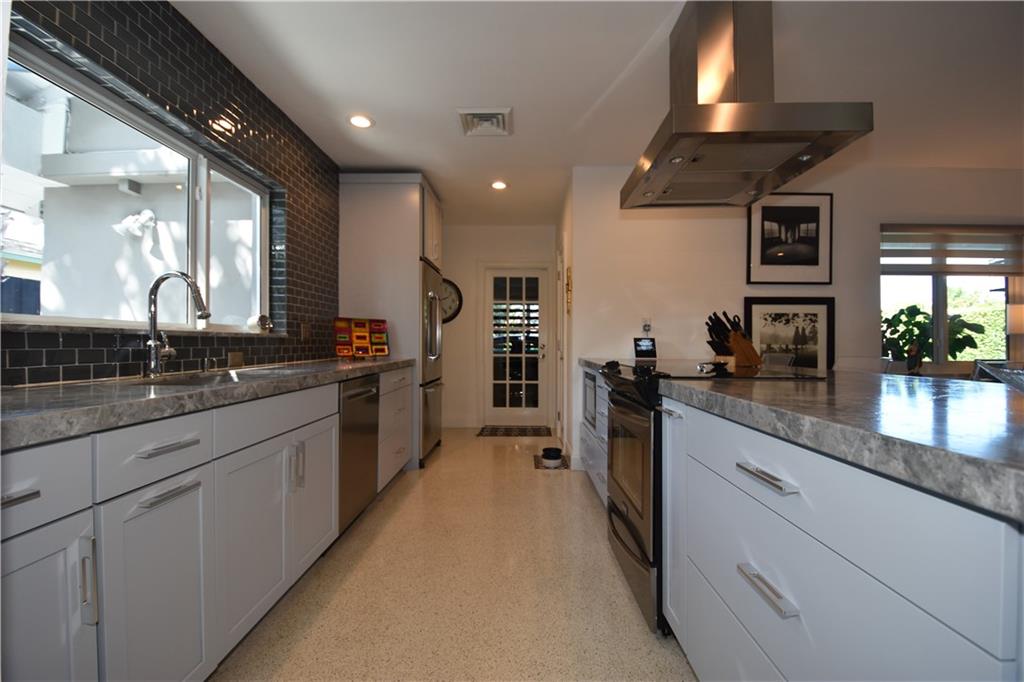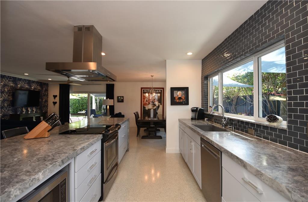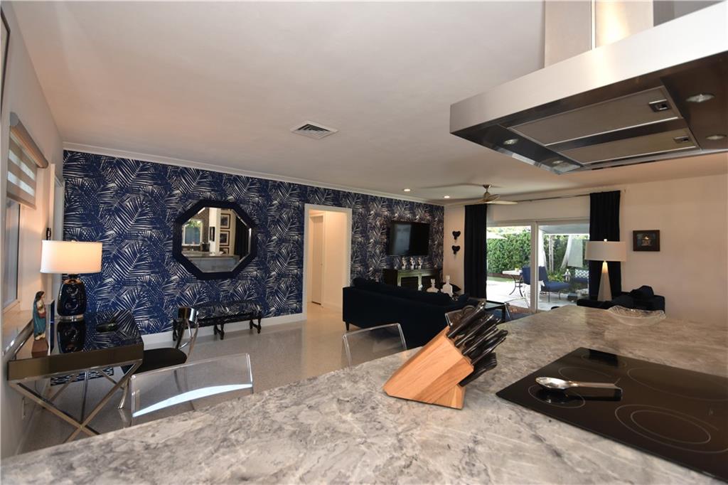 Designed by renowned South Florida Mid-Century Architect Lester Avery completely renovated pool home features a open floor plan and professionally restored gleaming terrazzo floors throughout. Freshly painted and exquisitely landscaped offers superb curb appeal. Kitchen with walk-in pantry, quartz counters, stainless steel appliances, and large center peninsula. Dinning room opens to separate outdoor dinning space with living room overlooking covered lanai and tropical garden. Master suite boast of inviting pool & garden view, walk in closet and bath with pool access. Spacious and beautifully landscaped outdoor area pool deck with water-fall wall feature makes for perfect entertaining. Salt water pool has auto-fill. Separate laundry room and storage including a walk-in attic. A Must See!