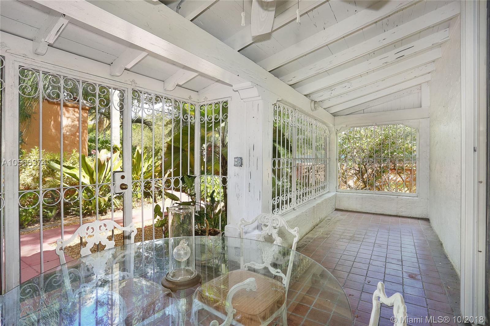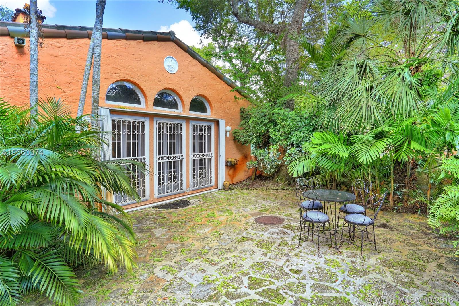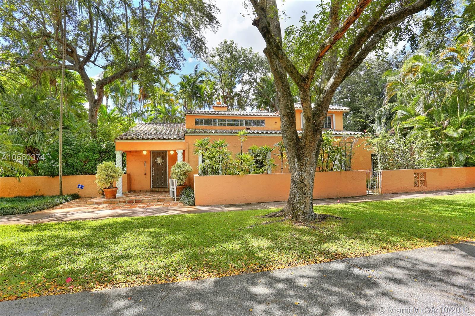This 3br/3ba home is situated on one of the prettiest Gables streets & just steps from the Granada golf course! It is truly special with Moorish details & arches, 2 story ceiling in the living room, Pecky Cypress front door & ceiling details, working fireplace, open floor plan & split bedroom layout. The newly renovated kitchen opens to a dining area that accesses the screened patio, perfect for grilling or outside dining. The front of the house also enjoys a wonderful vantage from the beautiful patio with cut coral floors & lush landscaping. The home has been lovingly maintained & features a master suite downstairs with one more bedroom or den down, an office & private bedroom upstairs that can be accessed from a side door. Detached garage, laundry room, 2012 roof, & gorgeous details.