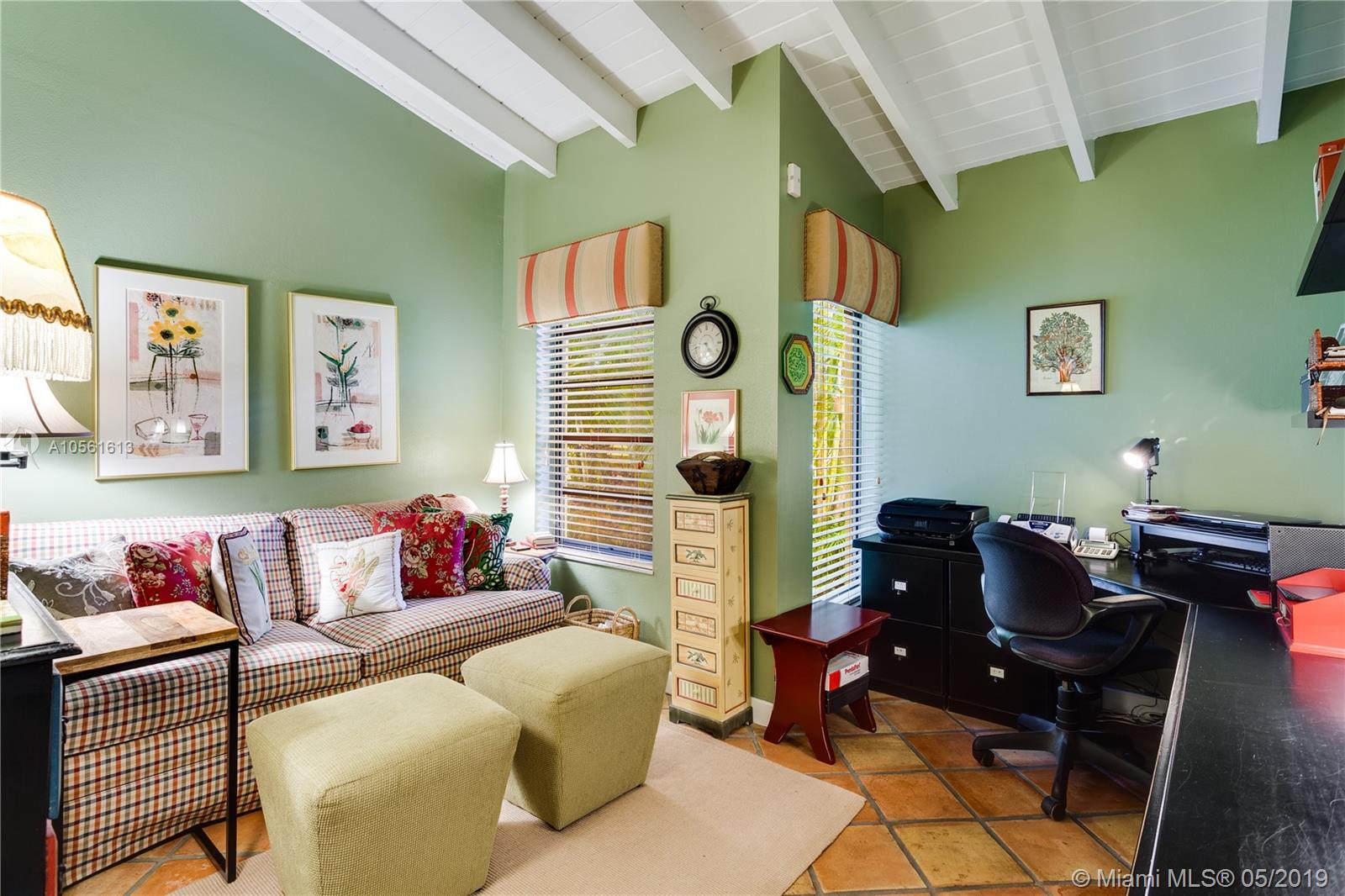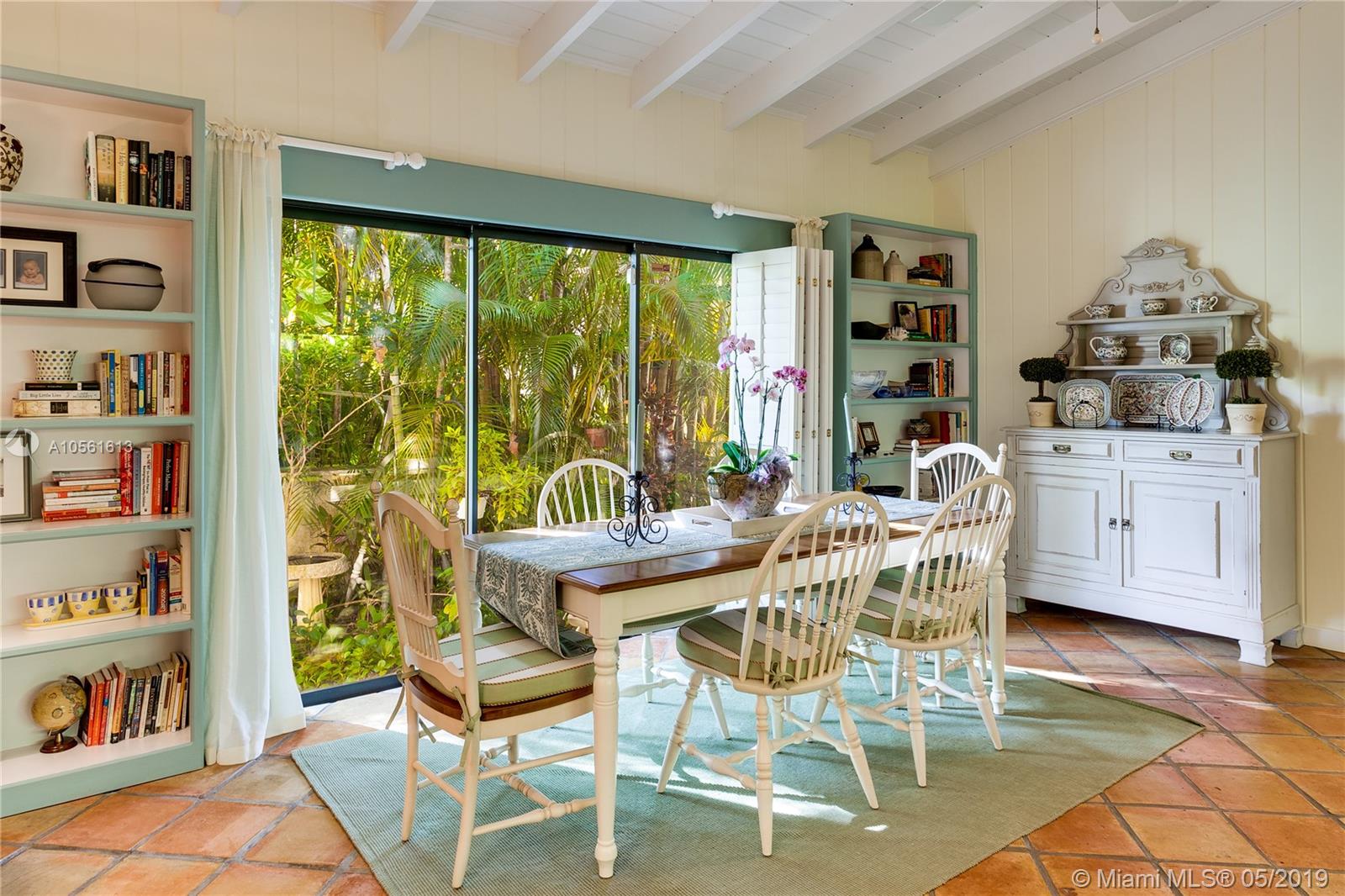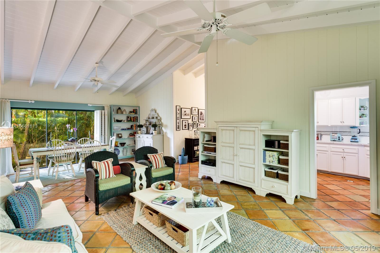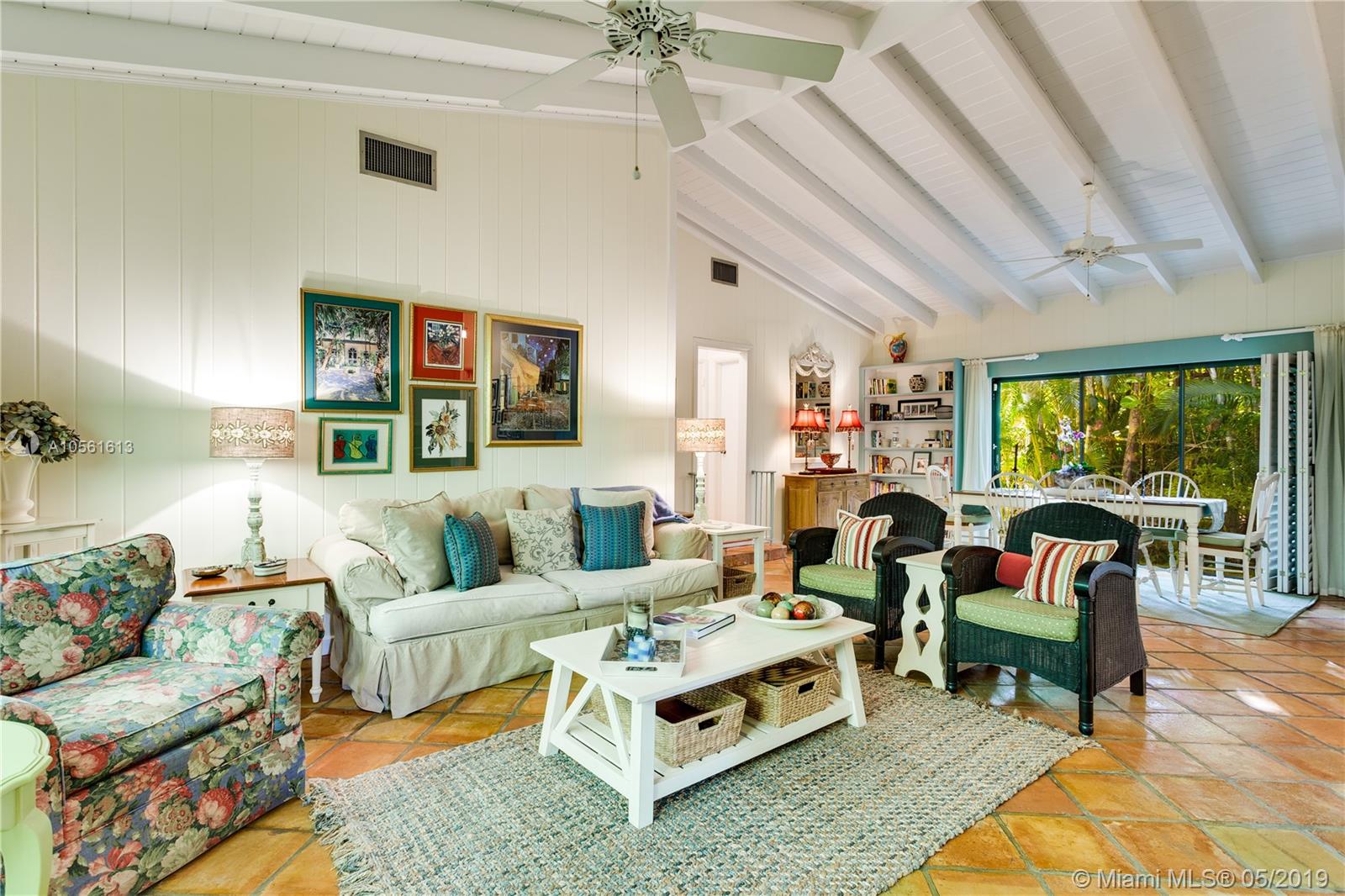 Top location within walking distance to the Coral Gables Library & Youth Center for this charming 1950's 2 bedroom 2 and 1/2 bath home which has a den which could easily be a third bedroom. Dramatic high open beamed ceilings in large foyer and in living and dining areas - great room effect with large expanse of sliding glass doors on both sides of the room for terrific cross ventilation effect. 2068 actual square footage. 5,250 sq ft lot with charming courtyard style garden at the front entry. House sits at back of its lot and so there is no room for a backyard pool. Updated, white kitchen, oak floors in master bedroom and second bedroom. Garage. Close to Riviera Country Club, Merrick Park and University of Miami. Full set of recent inspections available. Needs new septic tank/Drainfield