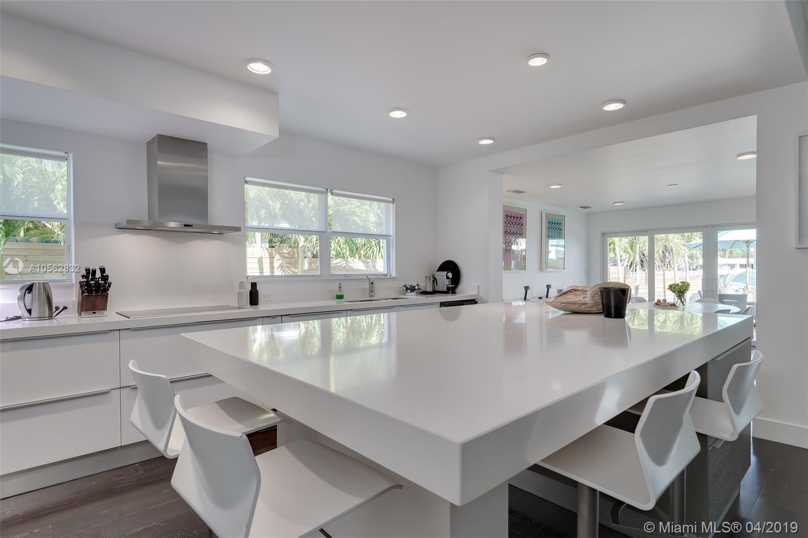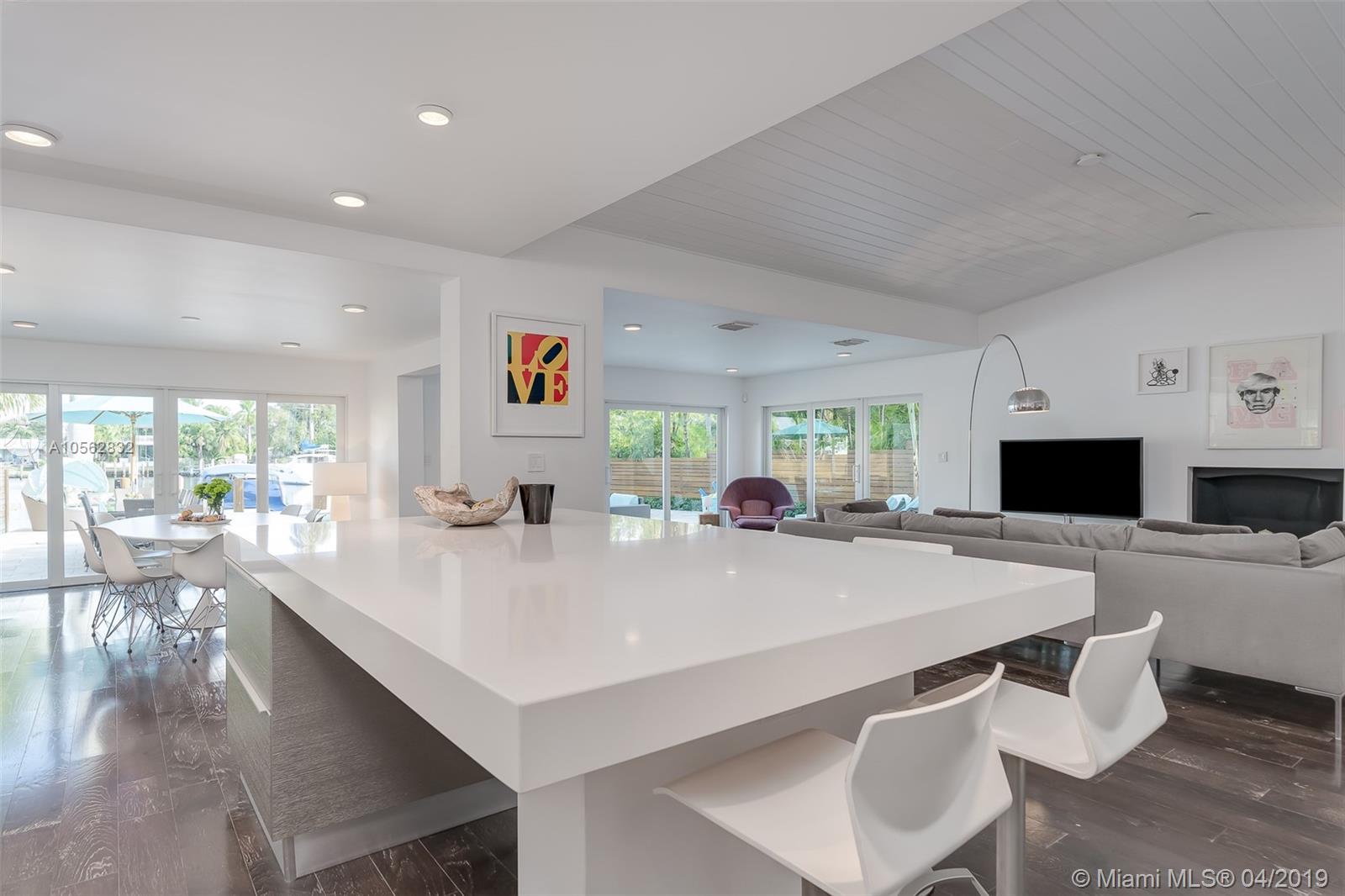 Amazing and unique "MIMO" waterfront home on prestigious Bayview Drive in Fort Lauderdale. Walk or bike to Coral Ridge Yacht Club, Galleria Mall, Dining/Shopping, or the Beach! As you enter through the artfully chosen stainless steel double front doors, the oversized windows and glass doors facing the east reveal a stunning back patio/pool area with an extra wide view of the canal 'lake' from the backyard. Private dock for up to 65' vessel; ocean access with no fixed bridges. Light and bright modern interior design: clean lines, warm natural wood floors, vaulted ceiling in living area, Duravit and Hans Grohe in all bathrooms, Bosche/Siemens kitchen appliances, original "Midcentury" wood spiral stairs to master bedroom. Hurricane impact windows, fenced yard, and seawall recently renovated.
