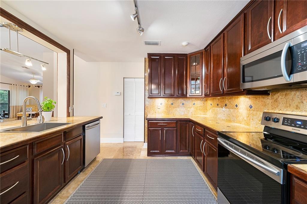 Finely remodeled 3/2 townhouse located in the great neighborhood in the center of Plantation. It's the largest model in the community. Travertine floor through out the living room and dining room. Two walk in closet in the master bedroom as well as vaulted ceilings and crowd molding. Fully upgraded kitchen with granite counter top, ss appliances barely new, private screened balcony overlooking the pool. Fresh paint throughout, new carpet in the bedrooms, garage has storage cabinets and suspended shelving for extra storage. So much to offer in this home. Won't last! Move fast!