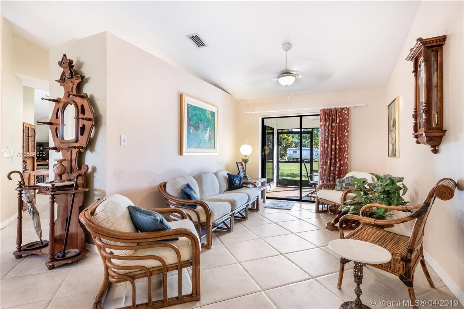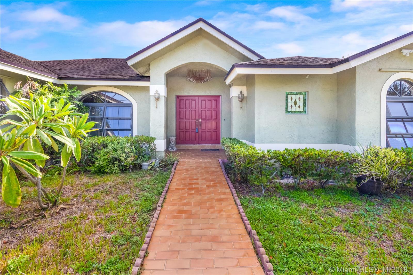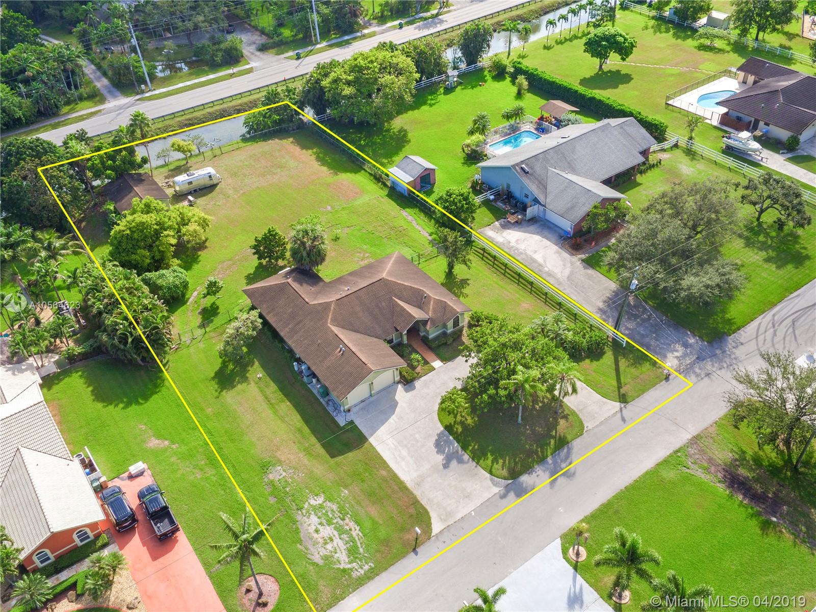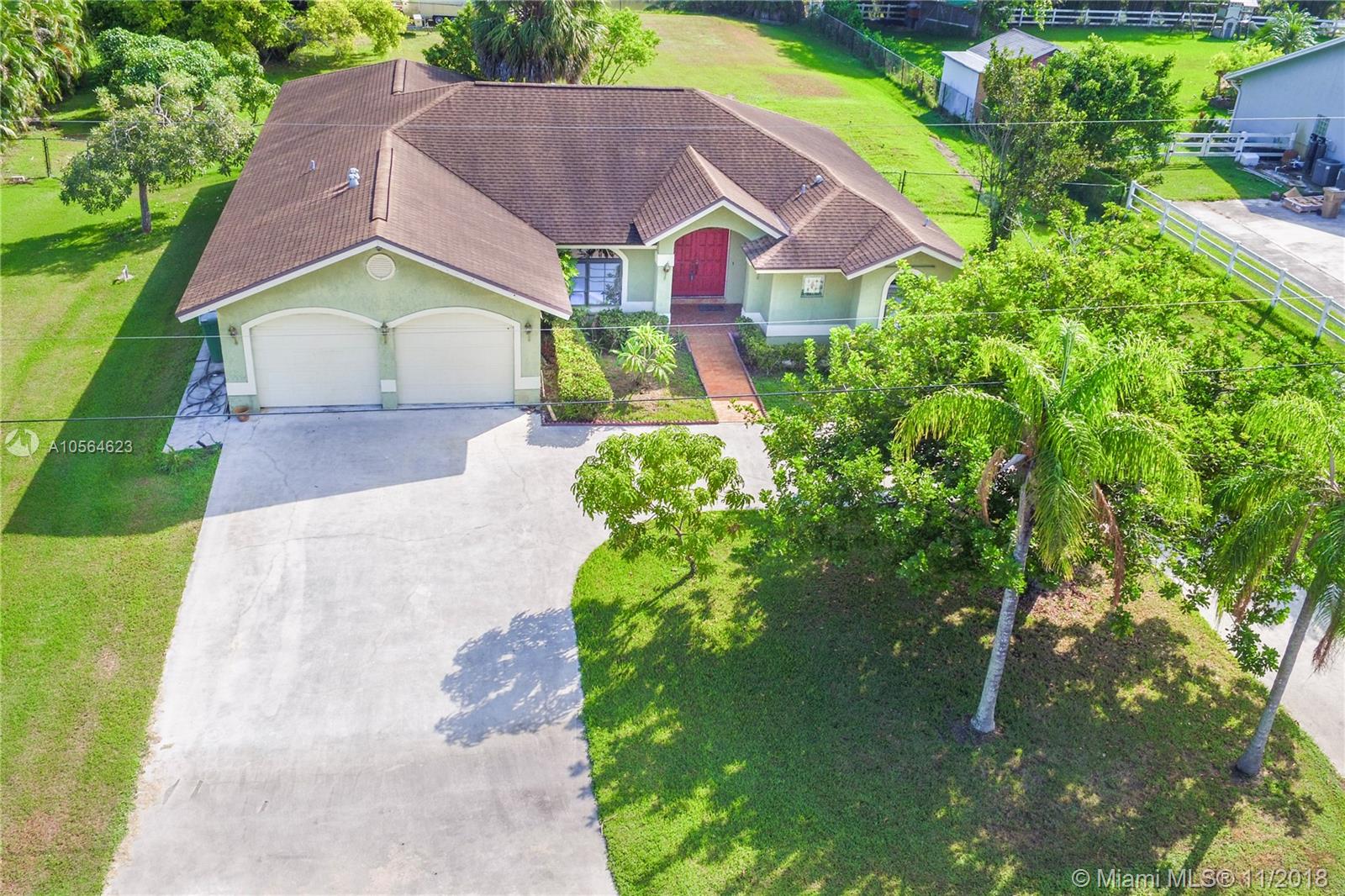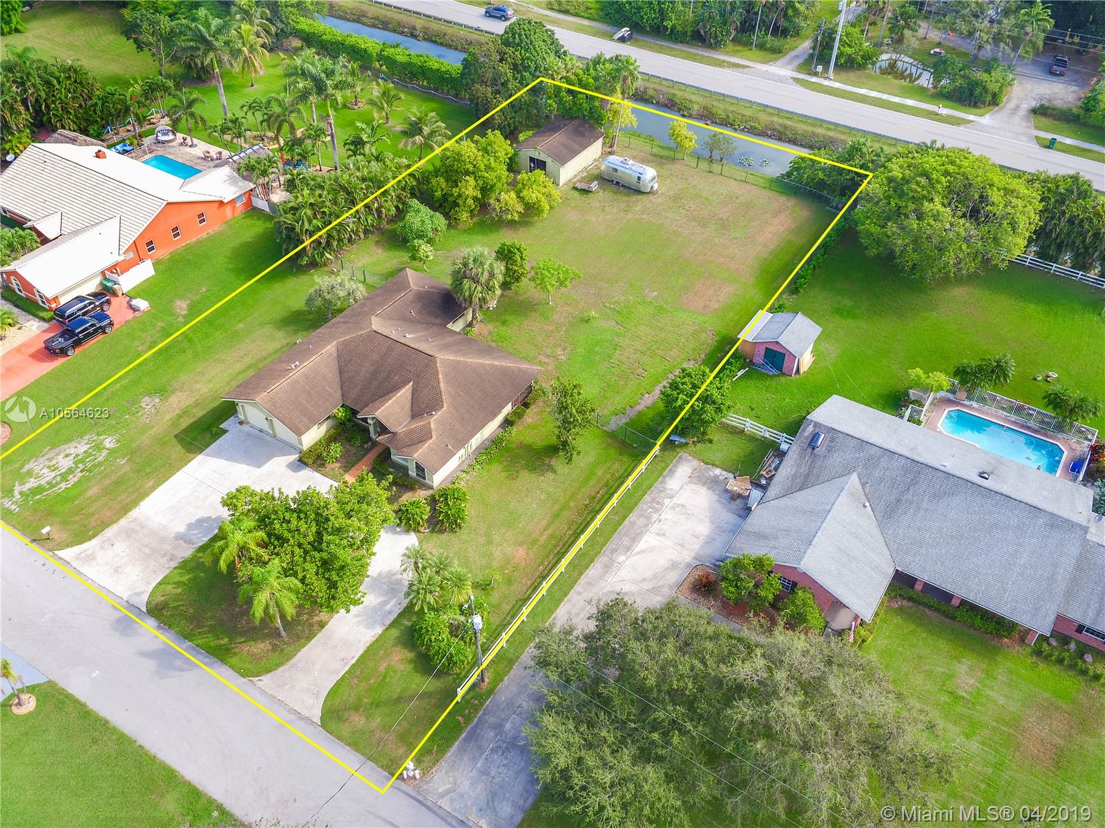 Fantastic home in picturesque horse country! RVs/boats/trailers are welcome to this cul-de-sac neighborhood in an A rated school district. 4/2/1 with open eat-in kitchen & spacious split floor plan that includes office, living, dining, family, and breakfast rooms. Master bedroom attached to his-&-her walk-in closets and master bath with whirlpool tub. Tons of space with oversized attached 2-car garage, rooms, closets, vaulted ceilings. Outside features canal frontage, mature fruit trees (avocado, lemon, macadamia nut, & 3 mango), large circular driveway, patio, screened porch, security lights, a detached 660sf garage with electric and water on a builder's acre of land. Single owner since built in 1990, original blueprints included. Tons of potential, great investment! No HOA