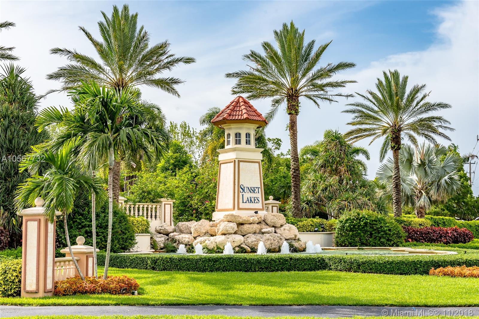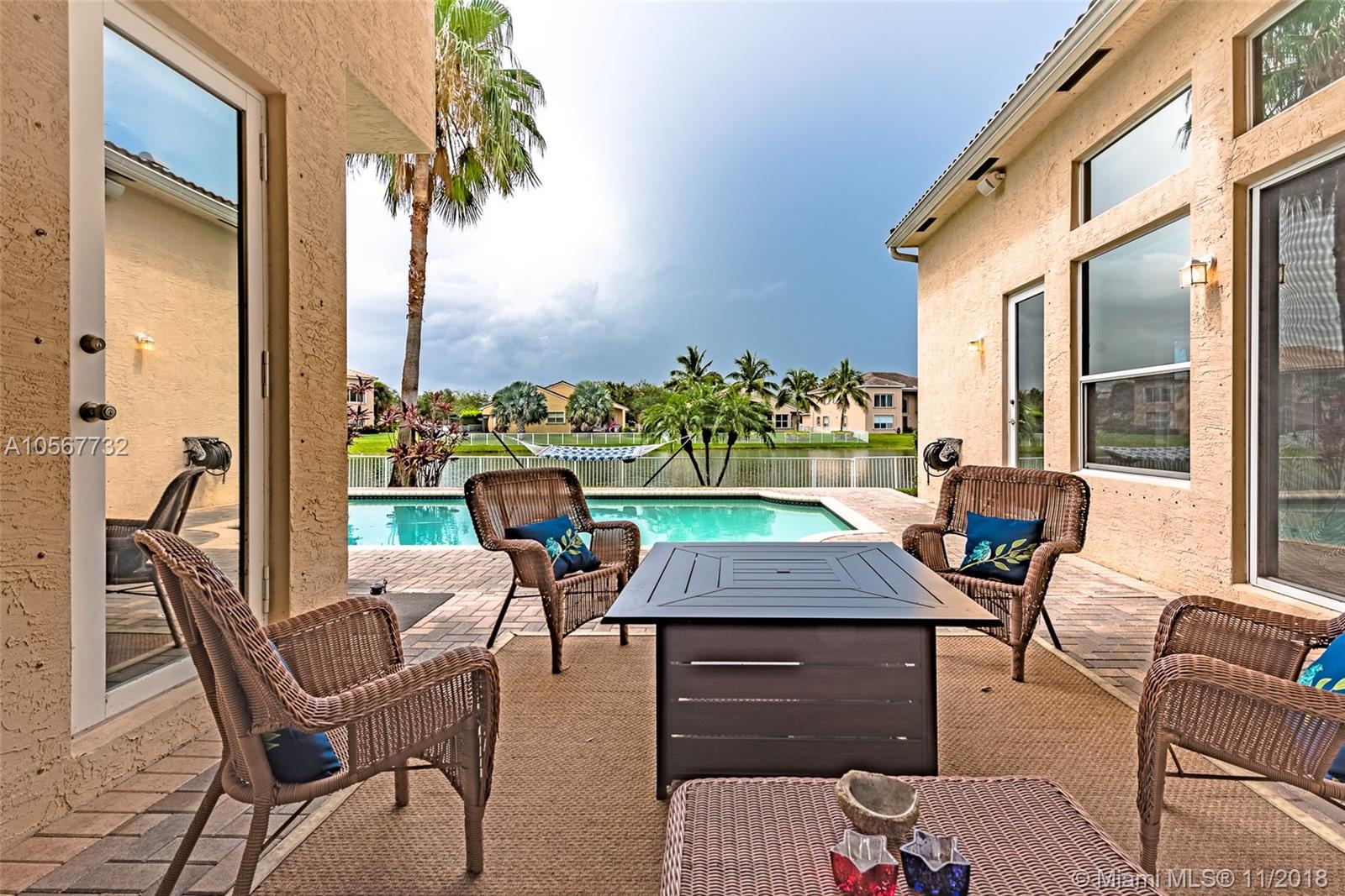 Spectacular Sofia Model home with stunning pool and great Lake view in Sunset Lakes. Home features 5 bedrooms, 3 full bathrooms, laundry room, and 2 car garage. Completely upgraded with high ceilings, tile throughout living area, wood flooring in the bedrooms, quartz countertops, and cherrywood cabinetry in the kitchen , and baths. Home is equipped with surround sound, intercom, and exterior speakers. Brand new appliances were recently installed in 2015, including 2 a/c units, double ovens, dishwasher, refrigerator, washer & dryer. Enjoy beautiful living in this lovely community at Sunset Lakes which includes, guarded gate, clubhouse, pool & spa, 8 tennis courts, exercise room, along with ADT security system, and Xfinity cable included with the HOA.
