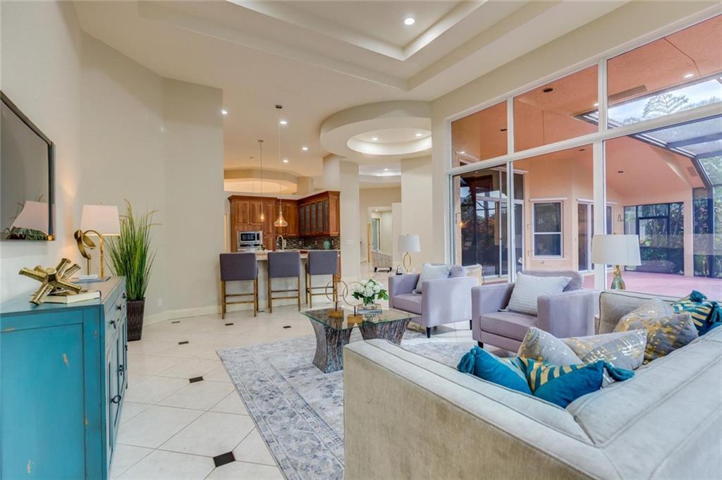 Cherish the tropical life in this luxurious home. Whether you're admiring waterfront views or relaxing to the soothing sound of the fountain in your private lanai, this home is sure to exceed your standards. Upon entry, you'll be captivated by the attention to detail, including soaring tray ceilings and elegant tile to escort you throughout. Oversized windows in every room provide optimal scenic views. Offering a living, dining, and family room, this spacious layout is fantastic for entertaining! The chef’s kitchen is a true vision, with quartz countertops, Whirlpool SS appliances, custom backsplash, center island, breakfast bar, and ample cabinet space! Escape to the grand master bedroom where you'll delight in a gorgeous en-suite and direct lanai access!