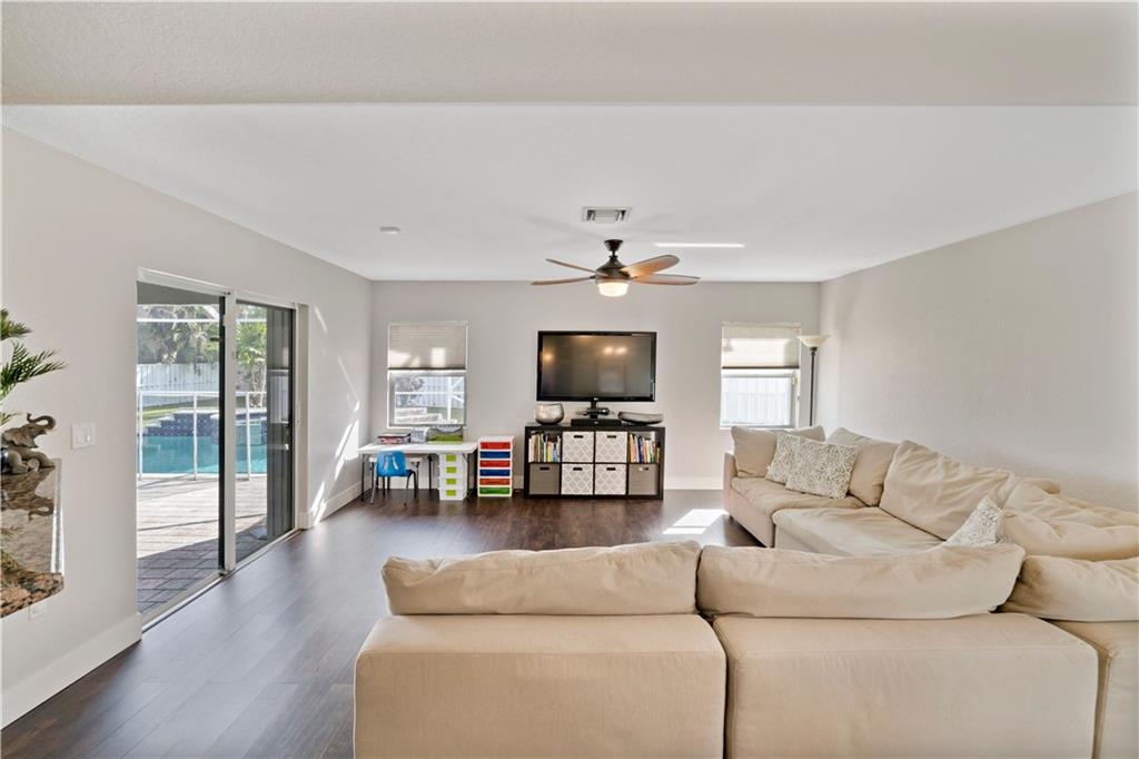 One of the newest homes (built in '96) in the established tree lined neighborhood of Ramblewood. 4 large bedrooms, split bedroom plan, gorgeous kitchen with granite counters, stainless steel appliances, under counter lighting, raised snack counter plus large eat in area. Family room, living room and master bedroom have sliders leading to covered paver patio, screened pool, spa and big backyard with white PVC fence. New wood flooring, brand new roof, fresh paint inside and outside, accordian hurricane shutters, large paver circular driveway and 2 car garage. No HOA. Make this very special home yours!