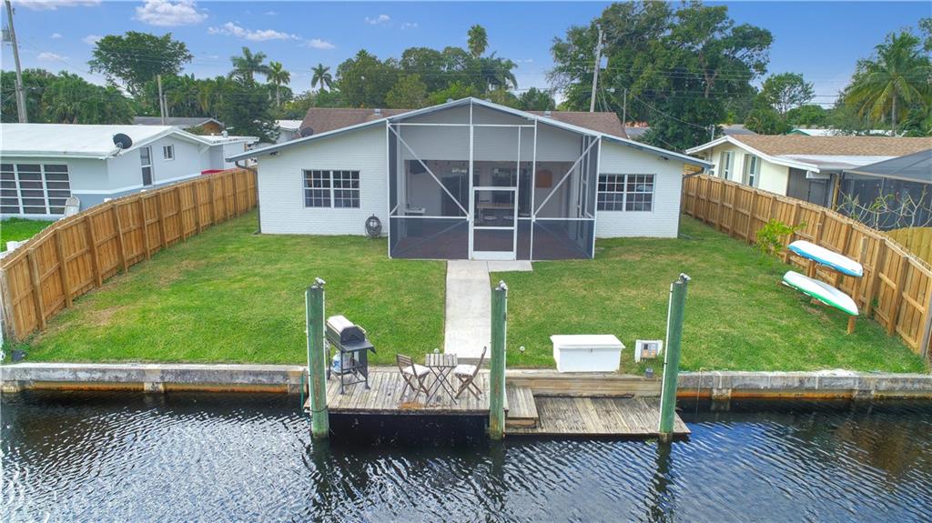 Stunning Lauderdale Isles home with timeless renovations. Beautifully updated 3BR/2BA with 60ft on deepwater/ocean access canal. Spacious floorplan with approx 2300 sq ft, vaulted ceilings, and new porcelain plank floors continuous throughout living areas and bedrooms. Dreamy, white open concept chef's kitchen with cooking island and counter seating, breakfast area, top stainless appliances, quartz counters, farmhouse sink, and recessed lighting. Sliding doors seamlessly blend interior with outdoor living. Generous master bedroom with walk-in closet, dual sinks and frameless shower. Screened east-facing patio for year-round entertaining and west facing patio to catch the sunset. Newly permitted garage door for 1CG with 4 driveway parking.