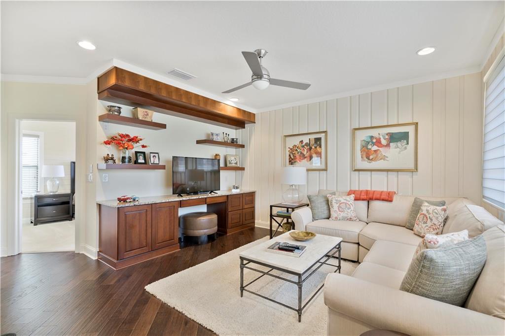 Amazing Builder's former model home with over $200K in upgrades on oversized waterfront lot! 4 bedrooms, 3 baths plus loft with 3 car tandem garage. Custom decorator built ins in family room, 4th bedroom/office and loft. Designer kitchen with upgraded cabinets with pull outs, glass tile backsplash, stainless steel hood and granite counters. Master bedroom upstairs with sitting area and custom closet build ins. Electric blinds in family room, white wood plank ceilings in family room and kitchen. Impact glass and crown molding throughout. Heated pool and summer kitchen. Fenced in yard.
