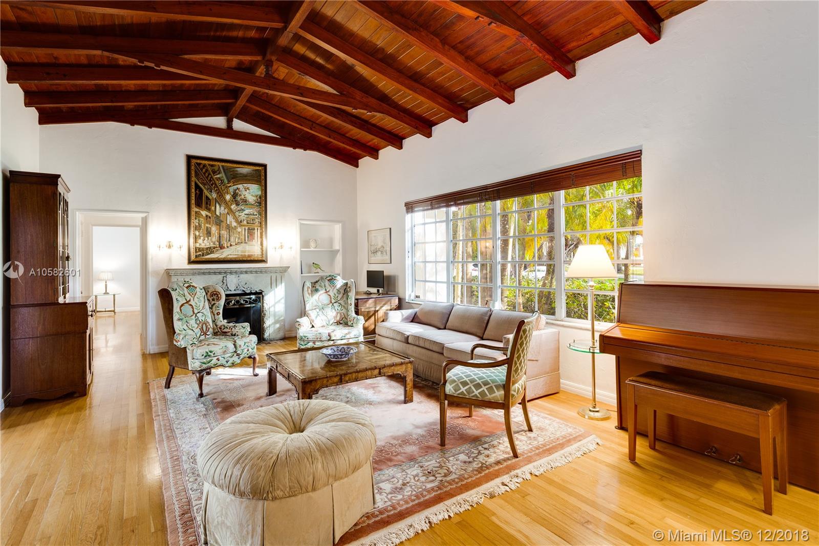 1938 built elegant Spanish-Deco 4/4 loaded with charm and character from the pre-War golden age of architectural homage to the classical ideals of balance, harmony, and beauty. 3097 actual sq. ft. on a lot just under 10,000 sq. ft. in a prime location, just steps to the Coral Gables Country Club and Granada G.C. Very grand main living room with cathedral, open beamed ceiling and elaborately detailed fireplace mantel. There are 3 bedrooms, each with their own bathrooms plus a 4th bedroom and bath off the two car garage that serves as a guest room, maid's room, or an office. There is a formal dining room, a modern kitchen with gas range, and a family room with glass doors overlooking the pool & patio. The master bedroom has a huge walk-in closet & a huge master bath. 2 car garage. Corner lot