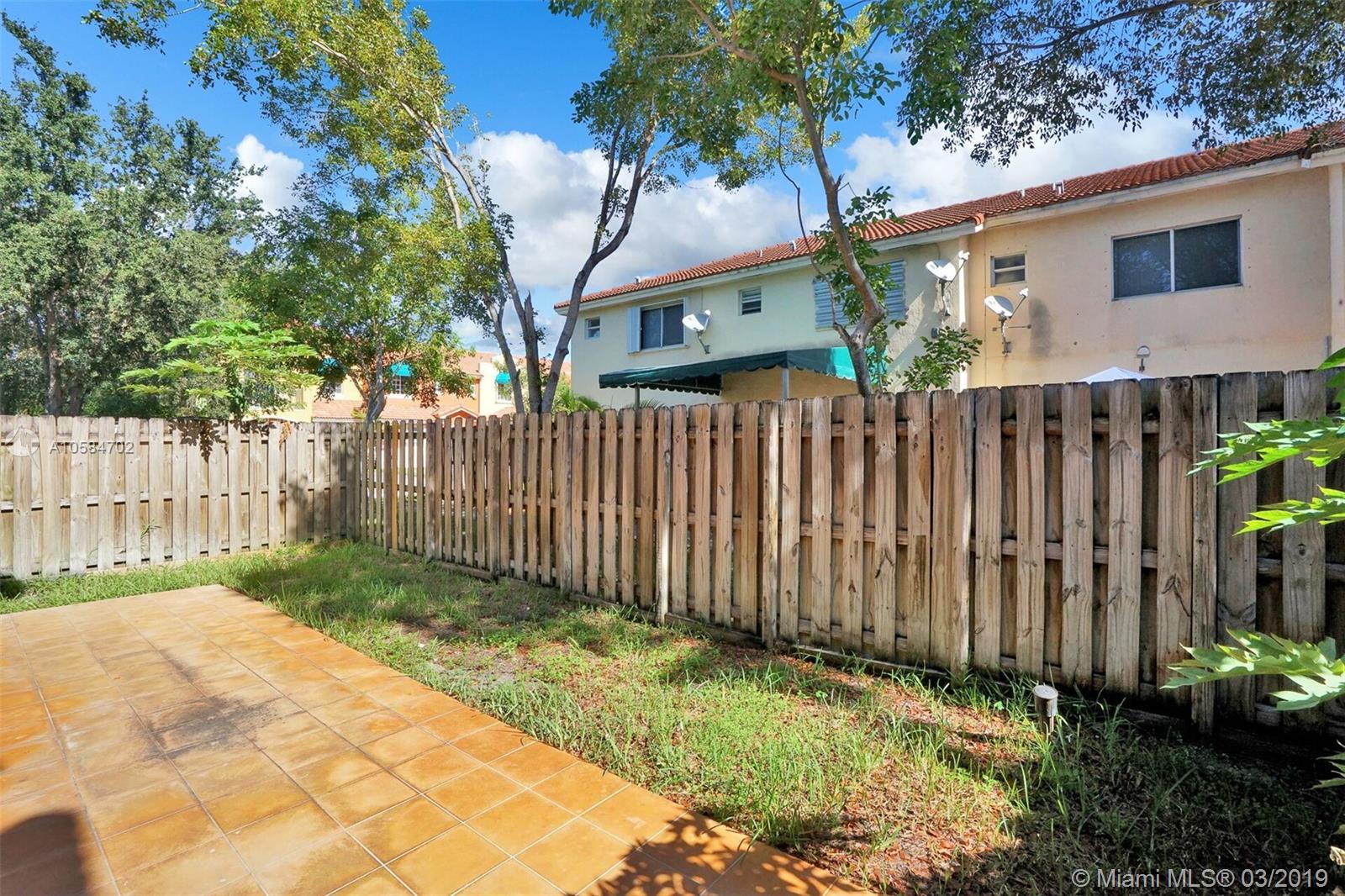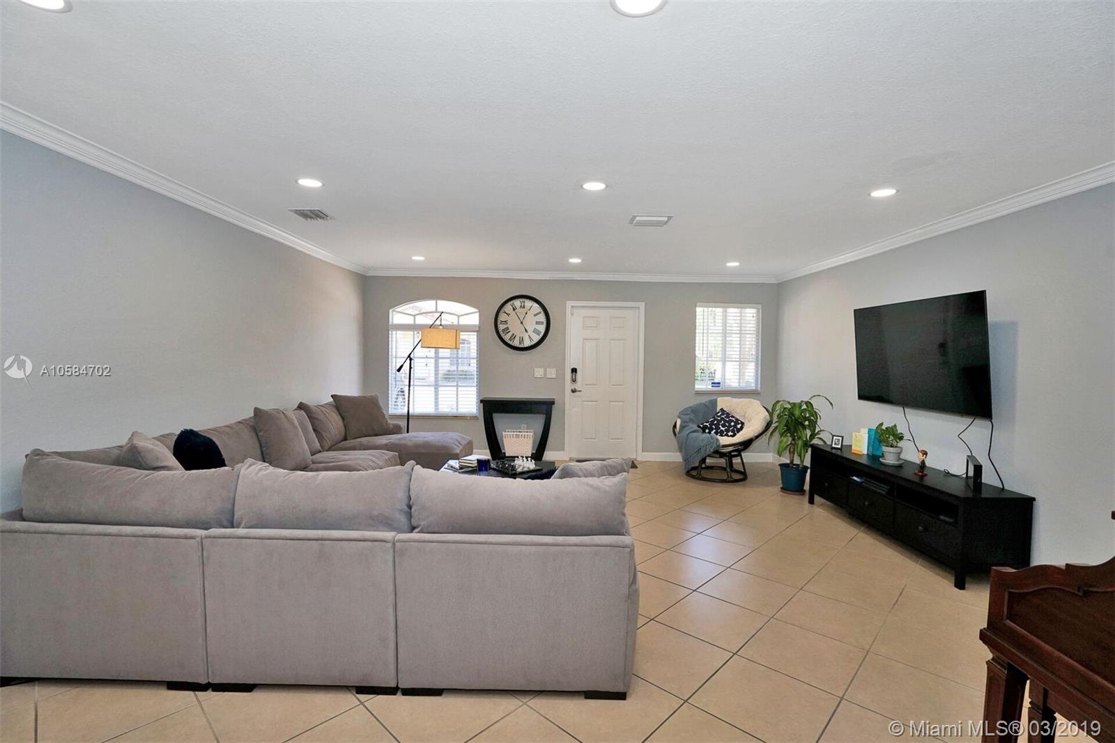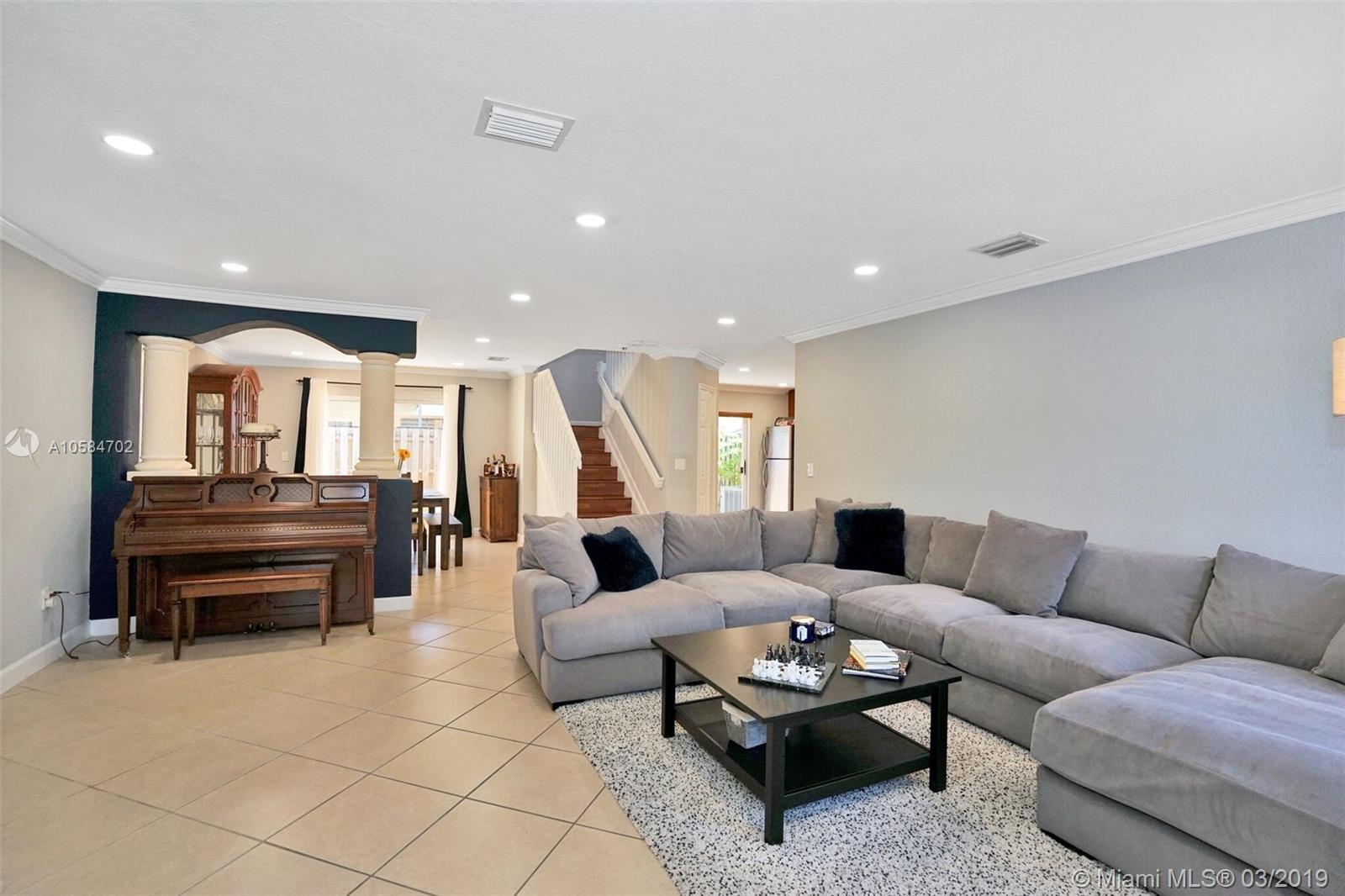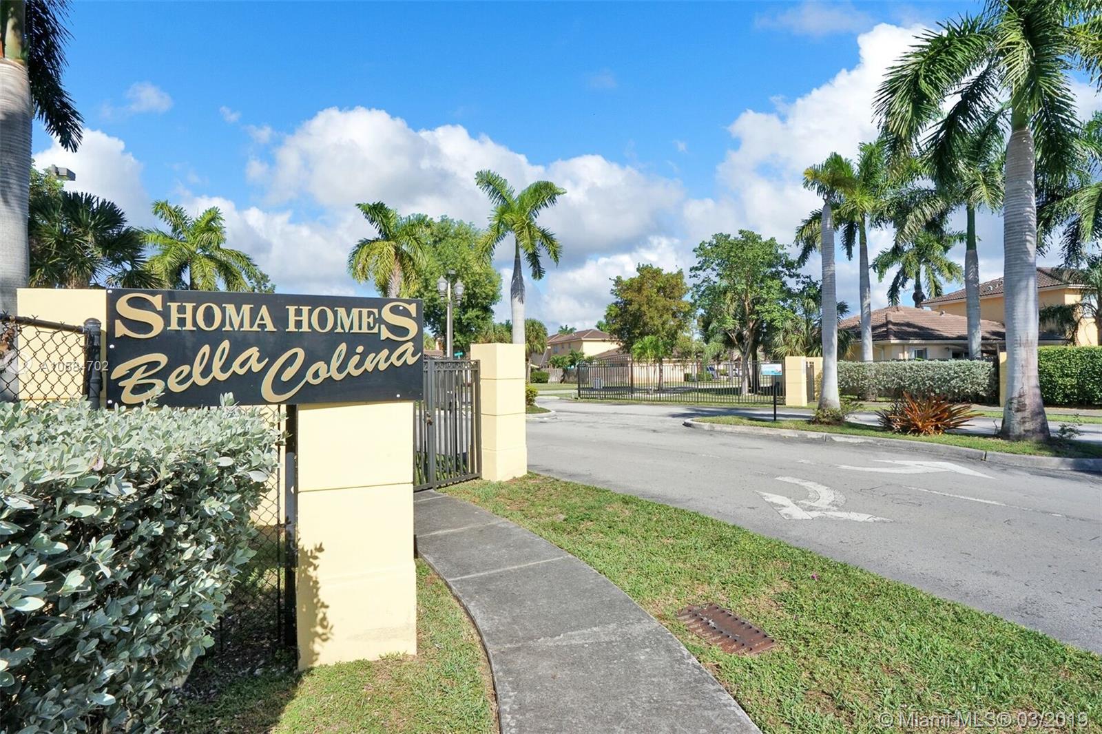 Large 1860 sq. ft., 3 bedrooms, 2 baths, 2 story townhome located at Bella Colina in Miami Lakes. Laminate floors upstairs, tile downstairs. Hide hat lighting. Stainless steel appliances except the range, washer and dryer. Walk-in closet. Tub and shower in the master bathroom. Big patio. Beautiful townhome. This one won’t last.