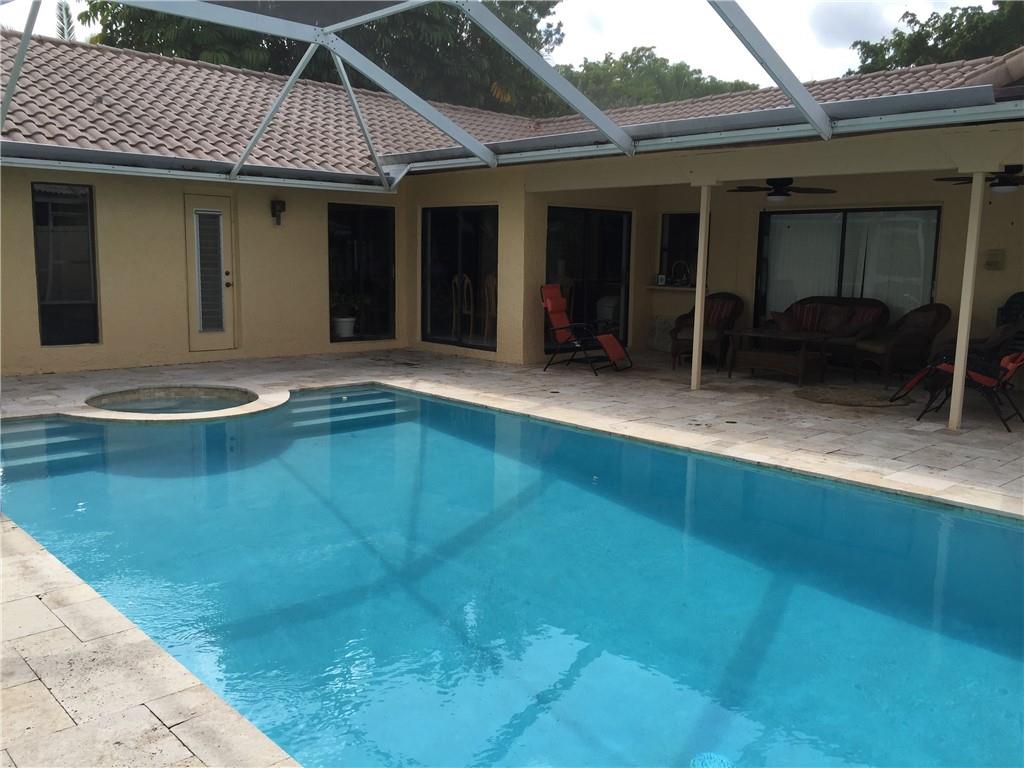 Beautiful Kitchen and Travertine Pool/ Spa Patio! -Also a Brand New Roof! An amazing 4 Bed, 2.5 Bath, updated home on a quiet Cul-de-sac in a beautiful neighborhood! Large rooms! One of the largest homes in this price range in the area! Beautifully remodeled kitchen with Granite Countertops and Cherry Wood Cabinetry. Kitchen and island are open to the breakfast area, dining area and large family room. A separate living room and den allow for private areas also. Two updated cabana baths and 3 sliding glass doors open to a beautiful and spacious Travertine patio overlooking a large pool and Jacuzzi with a newly screened enclosure. Interior is freshly painted and ready for a new owner. Walking distance to highly rated schools, dining and shopping and NO HOA.