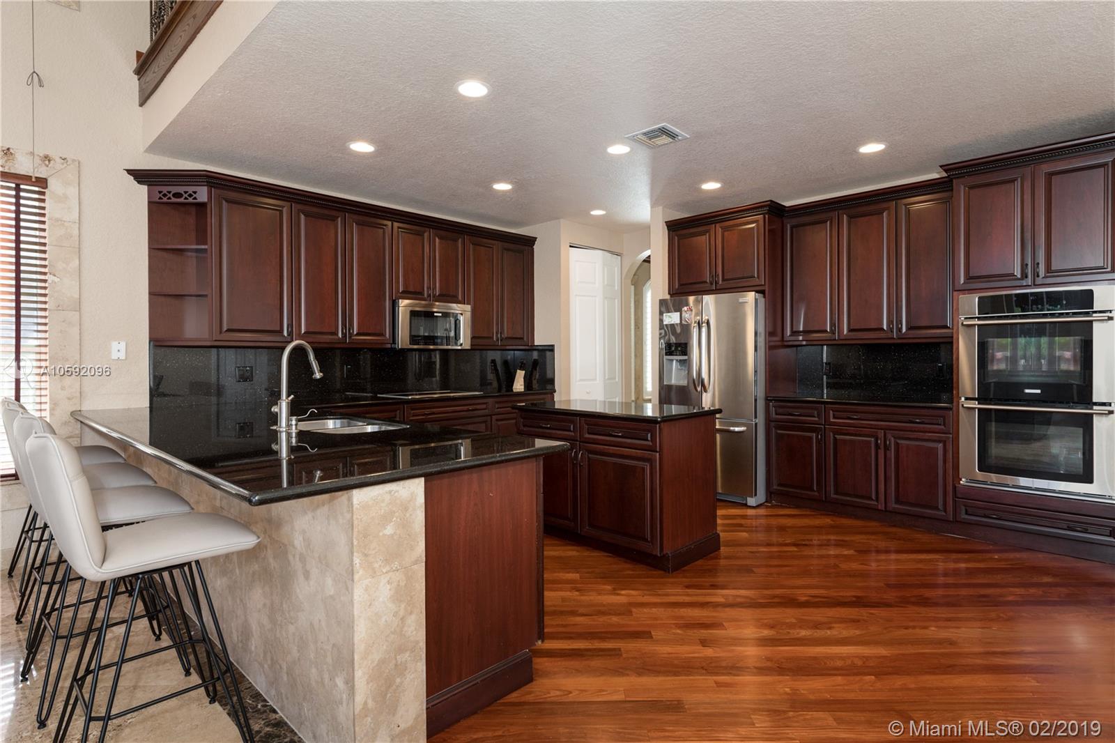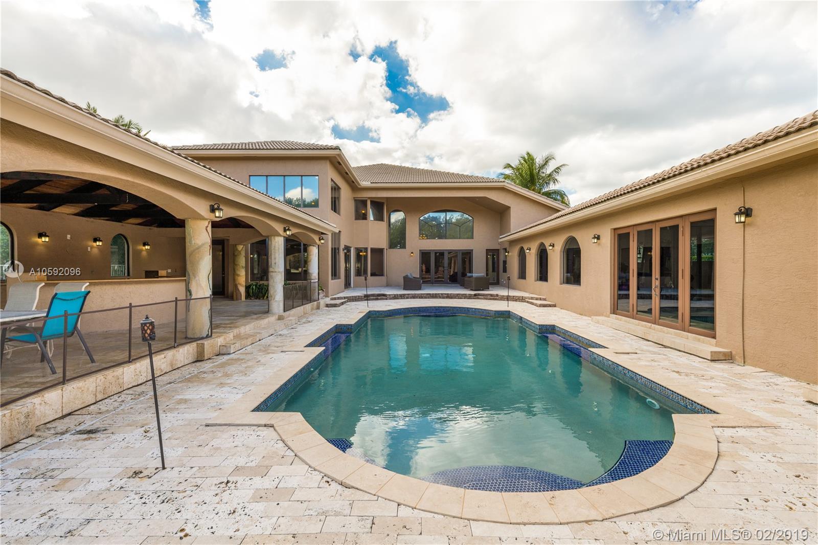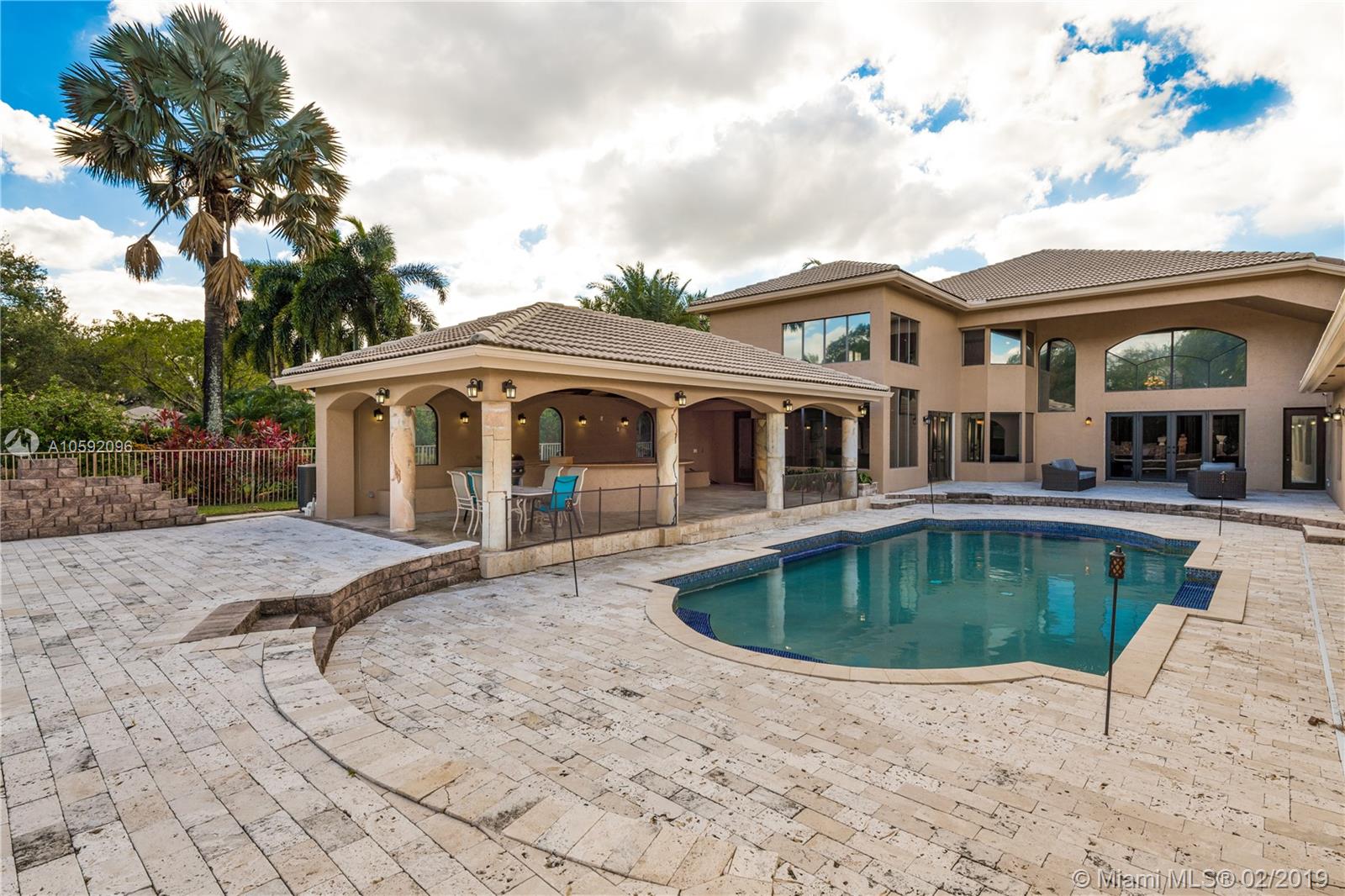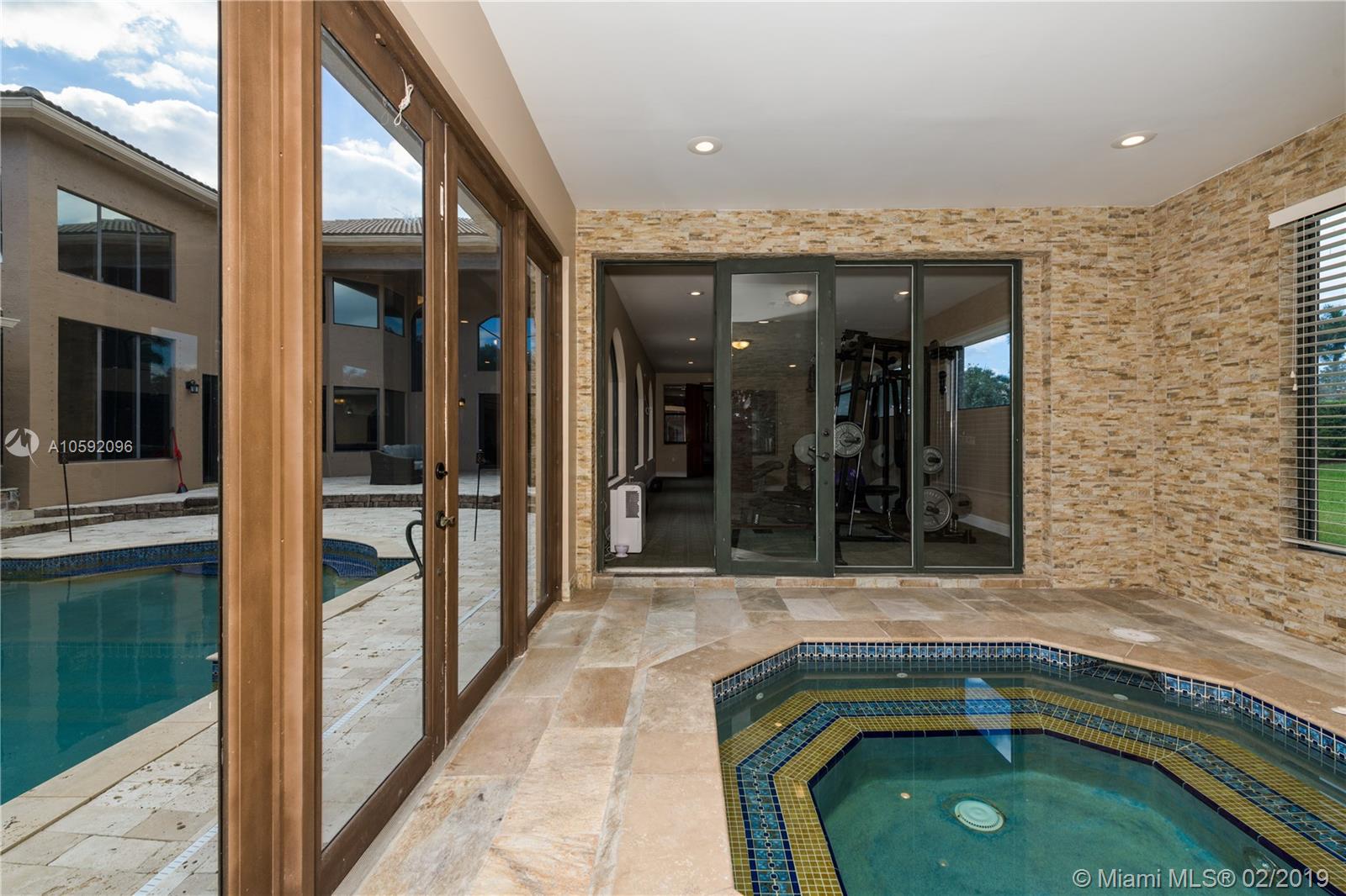 Spectacular Renoir model with 6 beds, 5.5 bath. This home has been customized with an extra wing with an in-law's suite, gym, sauna, hot tub and covered terrace with BBQ/summer kitchen. This home has all the bells and whistles; marble and cherry wood floors, european kitchen with stainless steel appliances and granite counter tops, huge loft upstairs, 3-car garage, community tennis/basketball courts adjacent to home, new airs (2018) and new pool heater. Most east facing windows and doors are hurricane impact glass. A-rated school district, 24 hour security and so much more!!