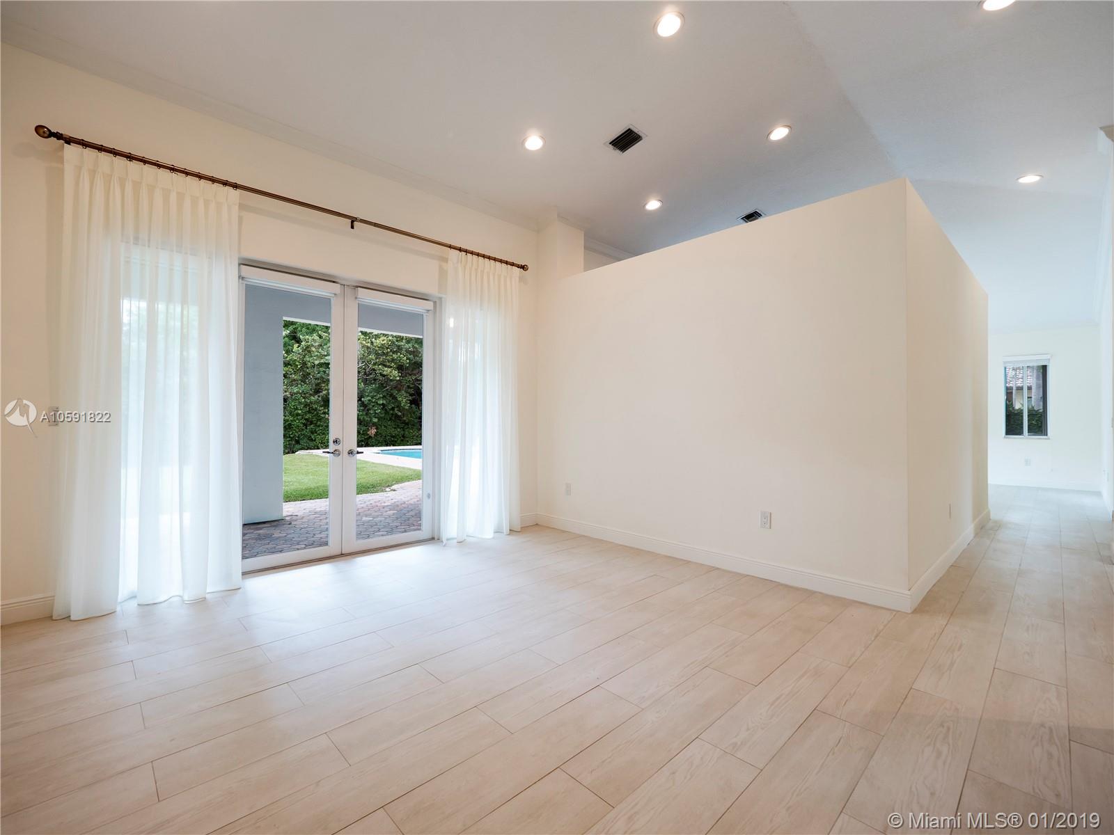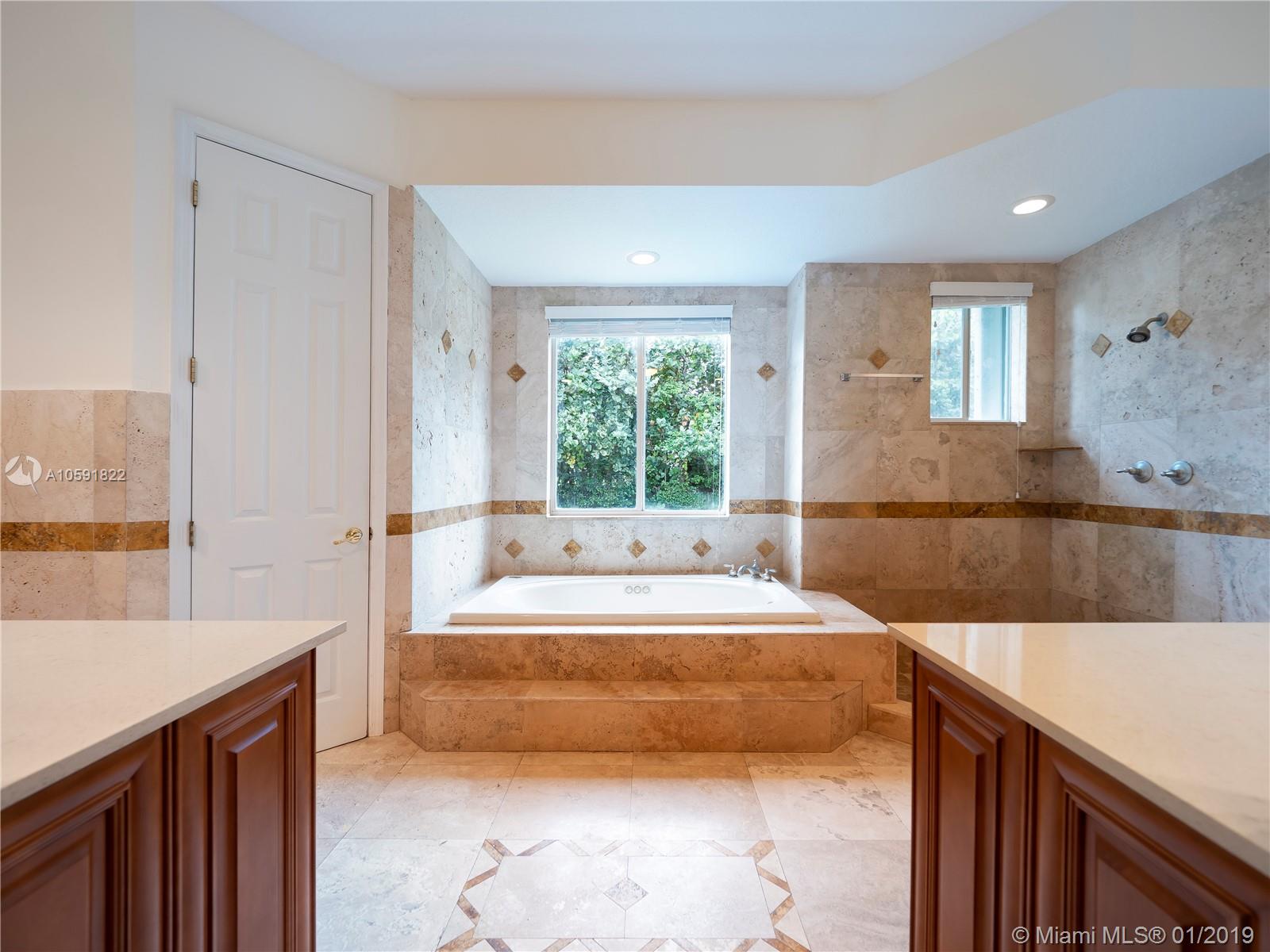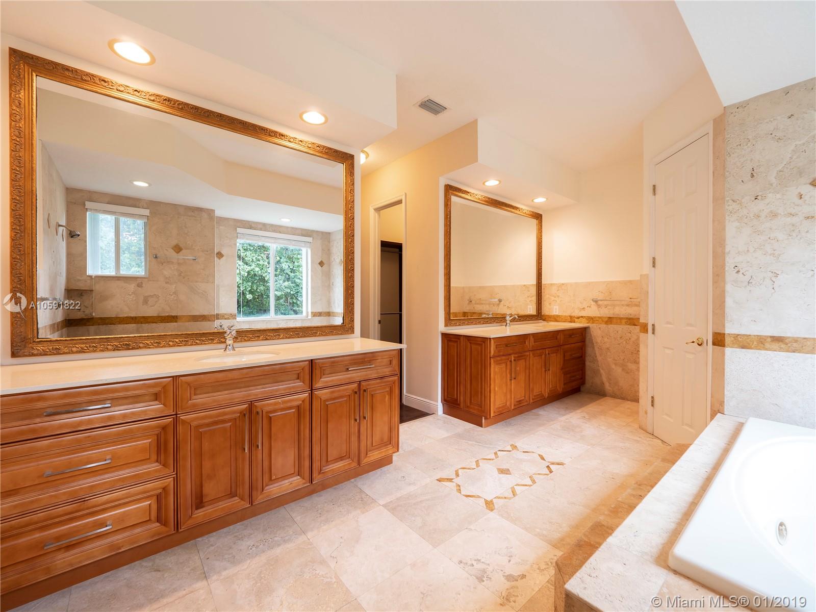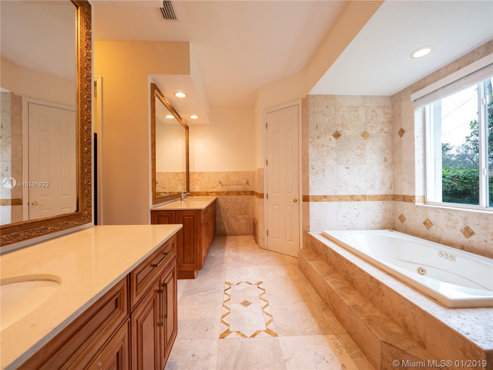 Lovely updated 4 bedroom, 3.5 bath home, offers great and spacious features: Private Entrance with beautiful Coral Rock Wall,luscious landscape, Family room, high ceilings, new tile floors throughout, and 2,840 SF of living area. Beautiful arched windows in the Dining and Family room, French Doors in Living room overlooking the pool/patio. Ample New kitchen with stone counters tops, Stainless Steel appliances integrated with the spacious Family room. Great master suit/bath with double vanities and Jacuzzi tub! Great patio for entertaining.Two car garage circular driveway.