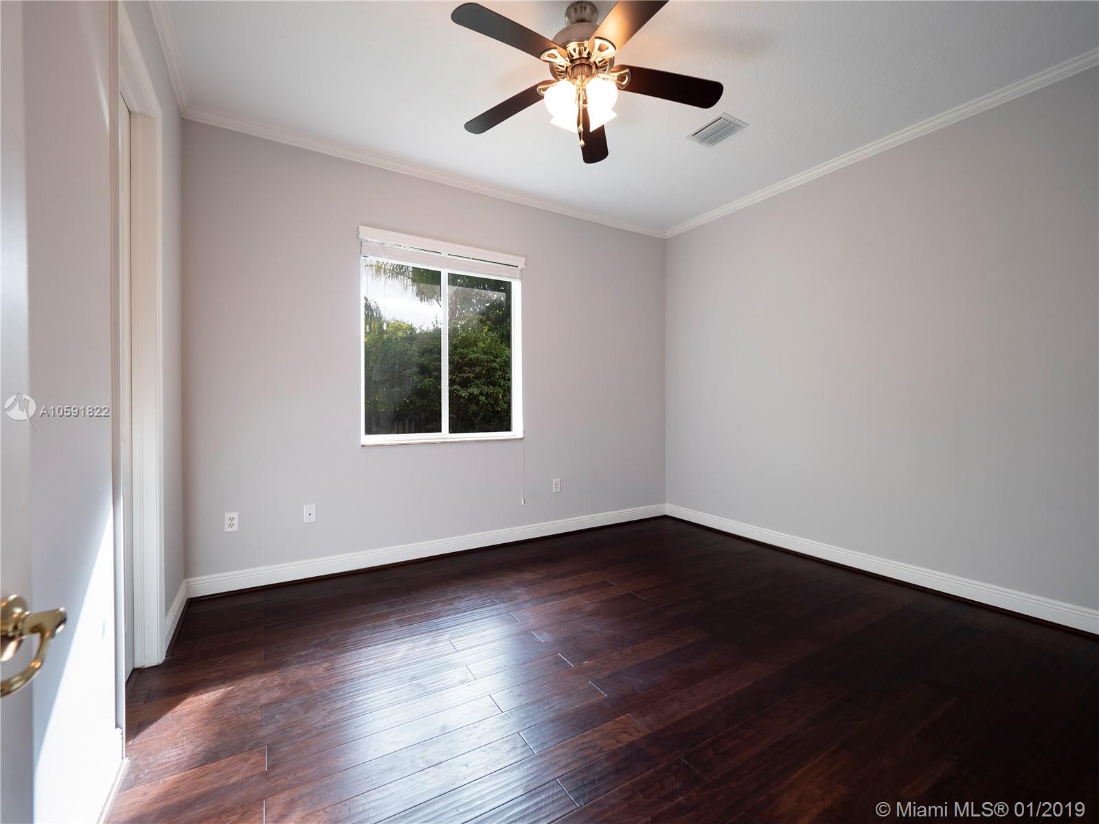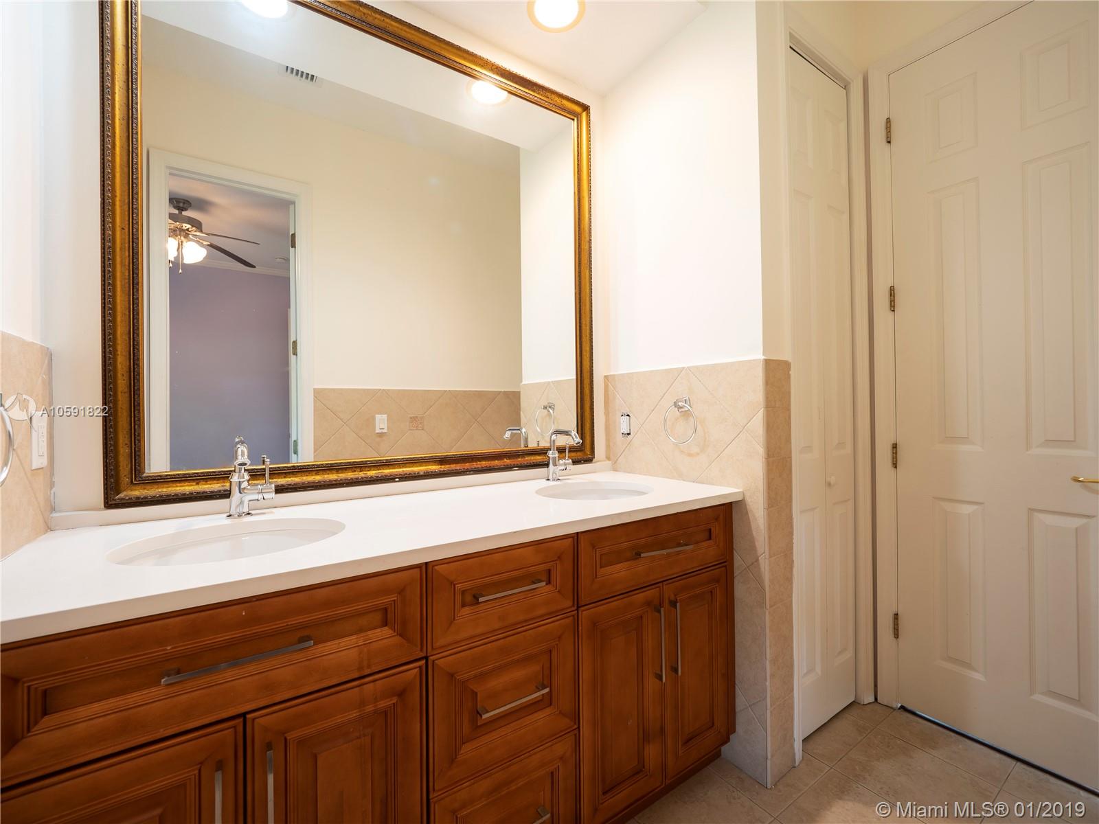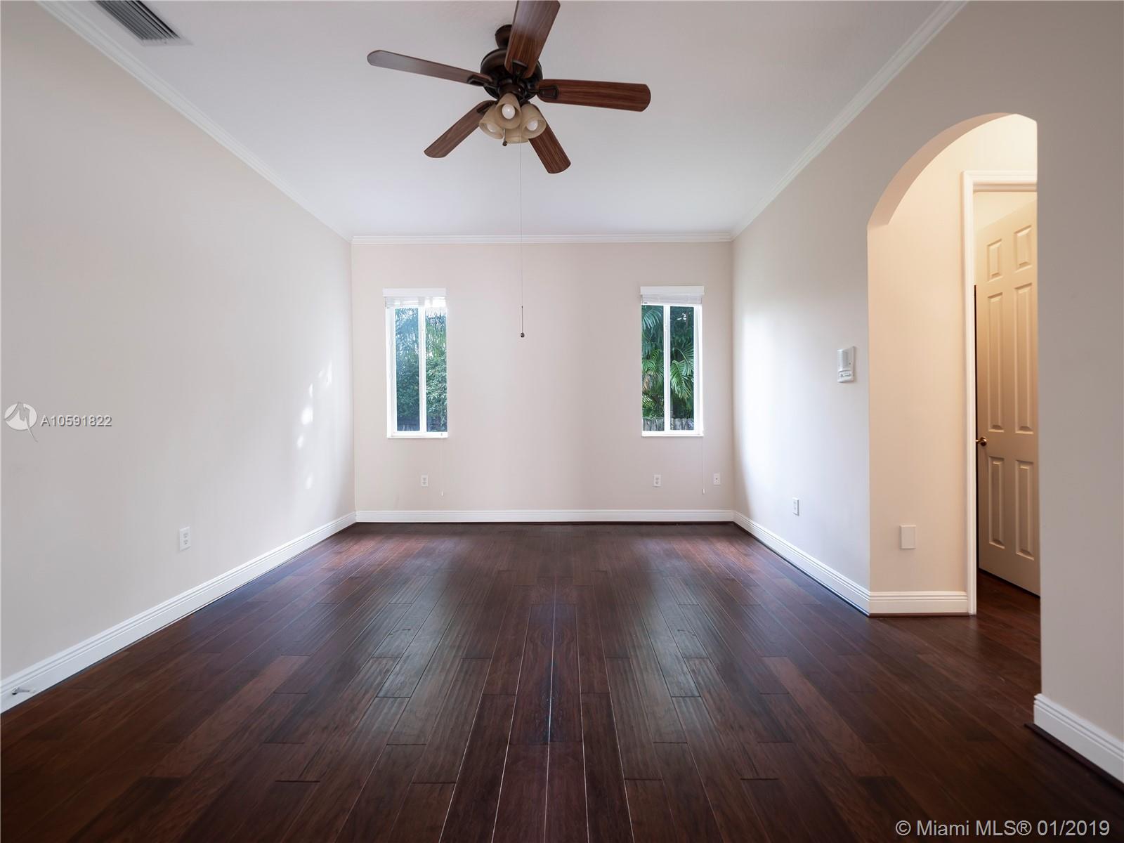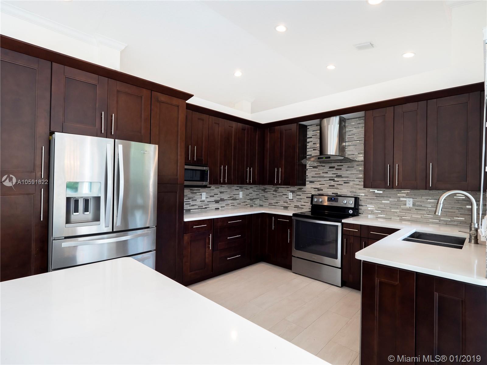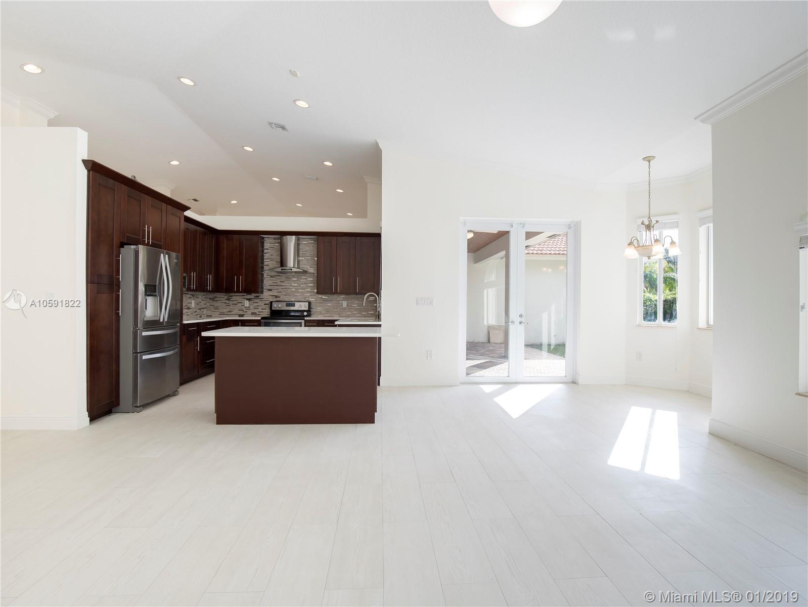 Lovely updated 4 bedroom, 3.5 bath home, offers great and spacious features: Private Entrance with beautiful Coral Rock Wall,luscious landscape, Family room, high ceilings, new tile floors throughout, and 2,840 SF of living area. Beautiful arched windows in the Dining and Family room, French Doors in Living room overlooking the pool/patio. Ample New kitchen with stone counters tops, Stainless Steel appliances integrated with the spacious Family room. Great master suit/bath with double vanities and Jacuzzi tub! Great patio for entertaining.Two car garage circular driveway.