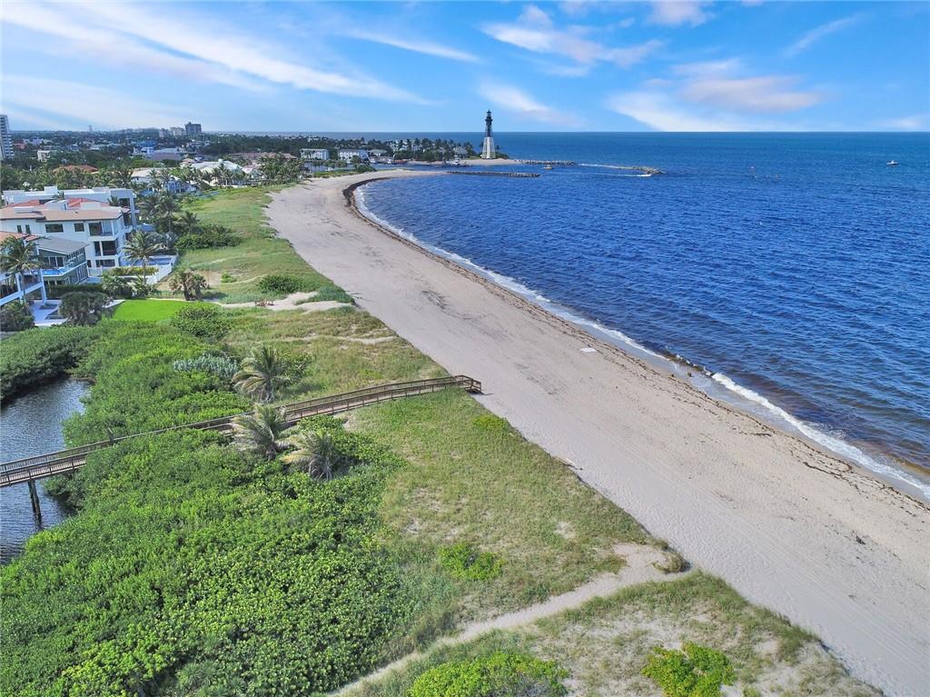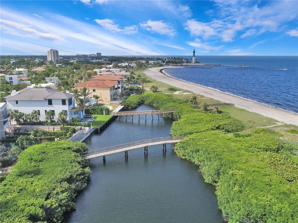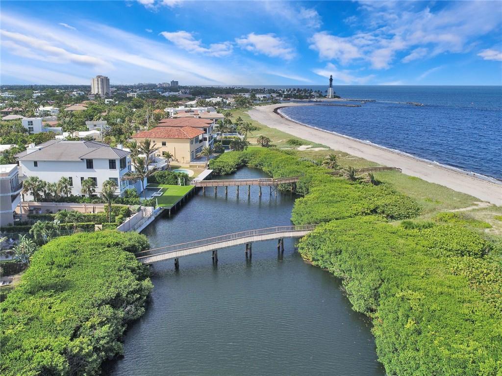 Your dream of a home at the beach is about to come true. Hillsboro Bay By The Sea is a unique upscale oceanfront gated community on one of the most beautiful stretches of beach in South Florida. Your gated beach access is unlike any other with a footbridge over a lagoon through lush tropical mangroves to the sand where you will enjoy the view of the lighthouse and endless boat parade through Hillsboro inlet. This spacious tri-level townhome is architecturally designed with European elegance. Elevator, marble floors, 2 car garage, new A/C, move in ready. 1st floor flex room & bath-4th bedroom/in-law suite or family room opens to private patio with in-ground spa & natural gas BBQ grill. From master suite balcony, you can catch a glimpse of the ocean! This is your opportunity. Call today.