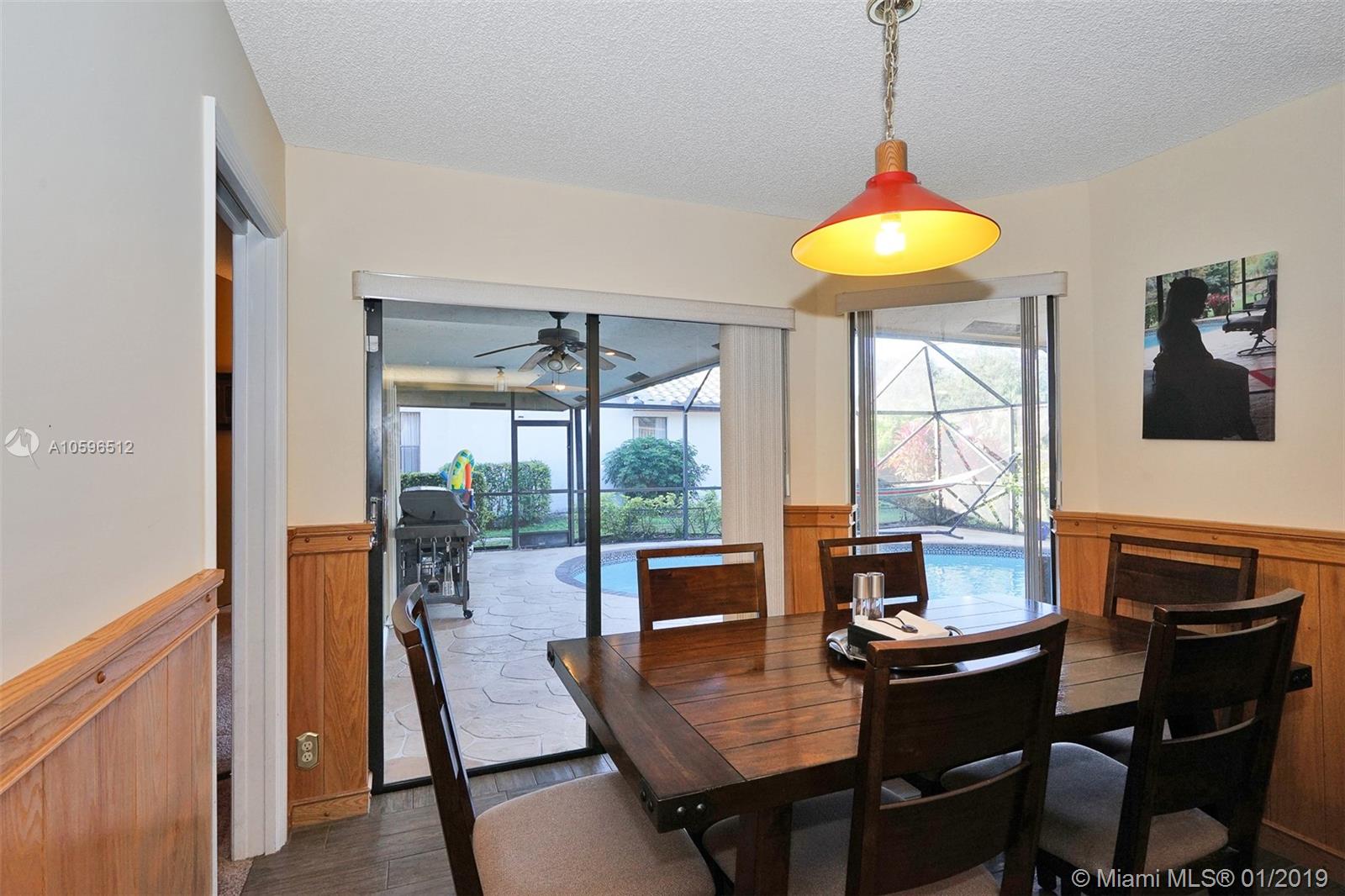 Beautiful spacious 4 bedroom 3 full bath pool home on water lot. Large living room with vaulted ceilings, split floor plan, large bedrooms, large eat-in kitchen with stainless steel appliances, lots of cabinet space and view to family room and large private backyard. Windows in every room, enclosed solar heated pool, side fenced area, relax in your backyard enjoying the private water view, hurricane shutters, great area mins from shopping and restaurants. Large closet space, open floor plan, 4th bedroom can be used as office, and move in ready