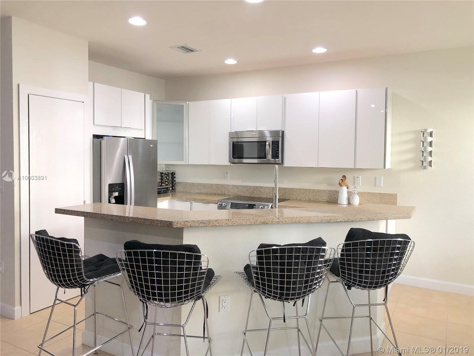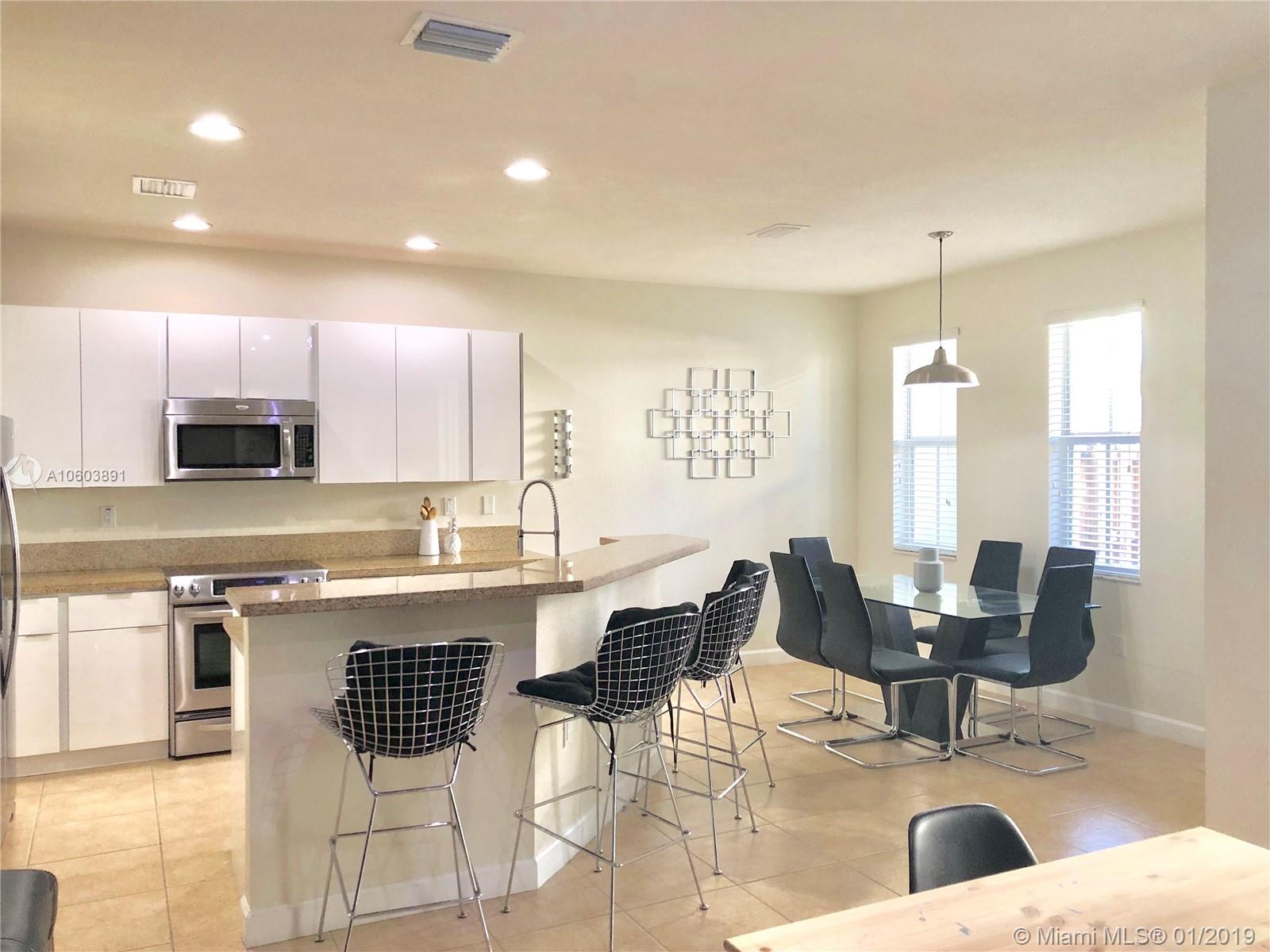 This gorgeous townhouse at Reserve at Doral West features 3 bedrooms, 2.5 bathrooms plus DEN. Beautiful remodeled kitchen with stainless steel appliances and granite countertops. Ceramic flooring on first floor and an updated guest bathroom. This 2-story home features a great layout with open concept living area. Huge master bedroom and bathroom with dual vanities. A/C unit is less than two years old. This exclusive gated community offers security patrol, elegant clubhouse with gym, playground and pool. It’s conveniently located close to fine restaurants, shops and more. Super-fast access to FL’s Turnpike & Palmetto Expressway. A+ schools and much more.