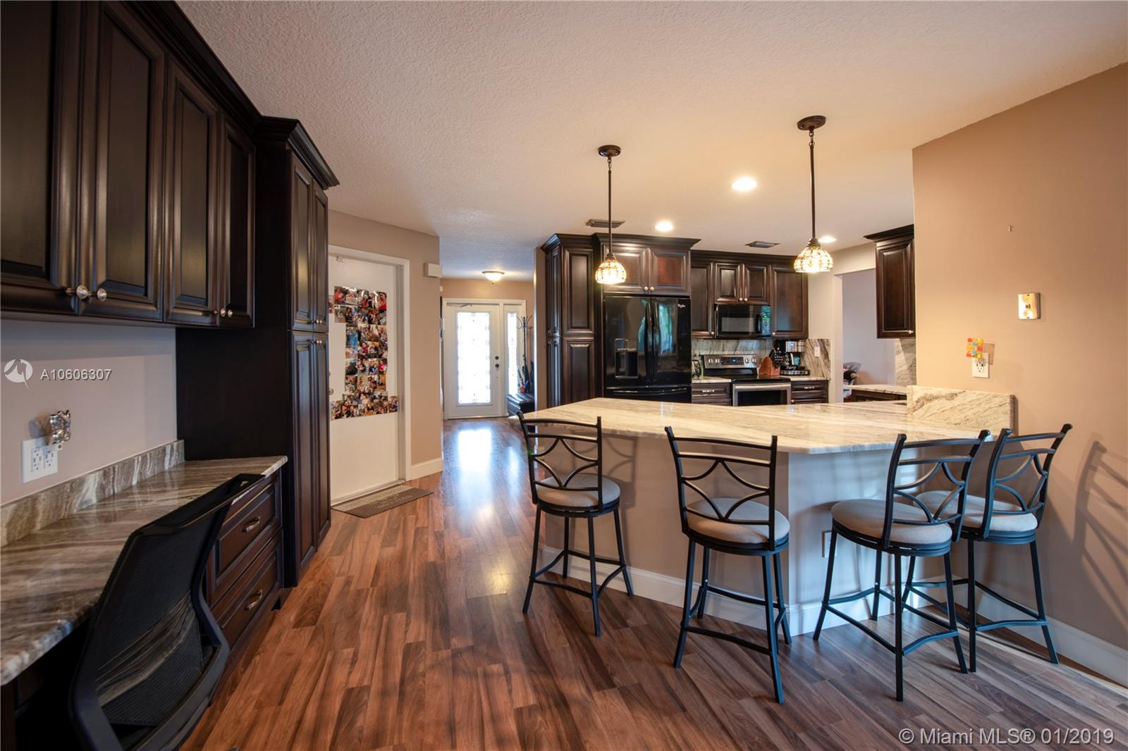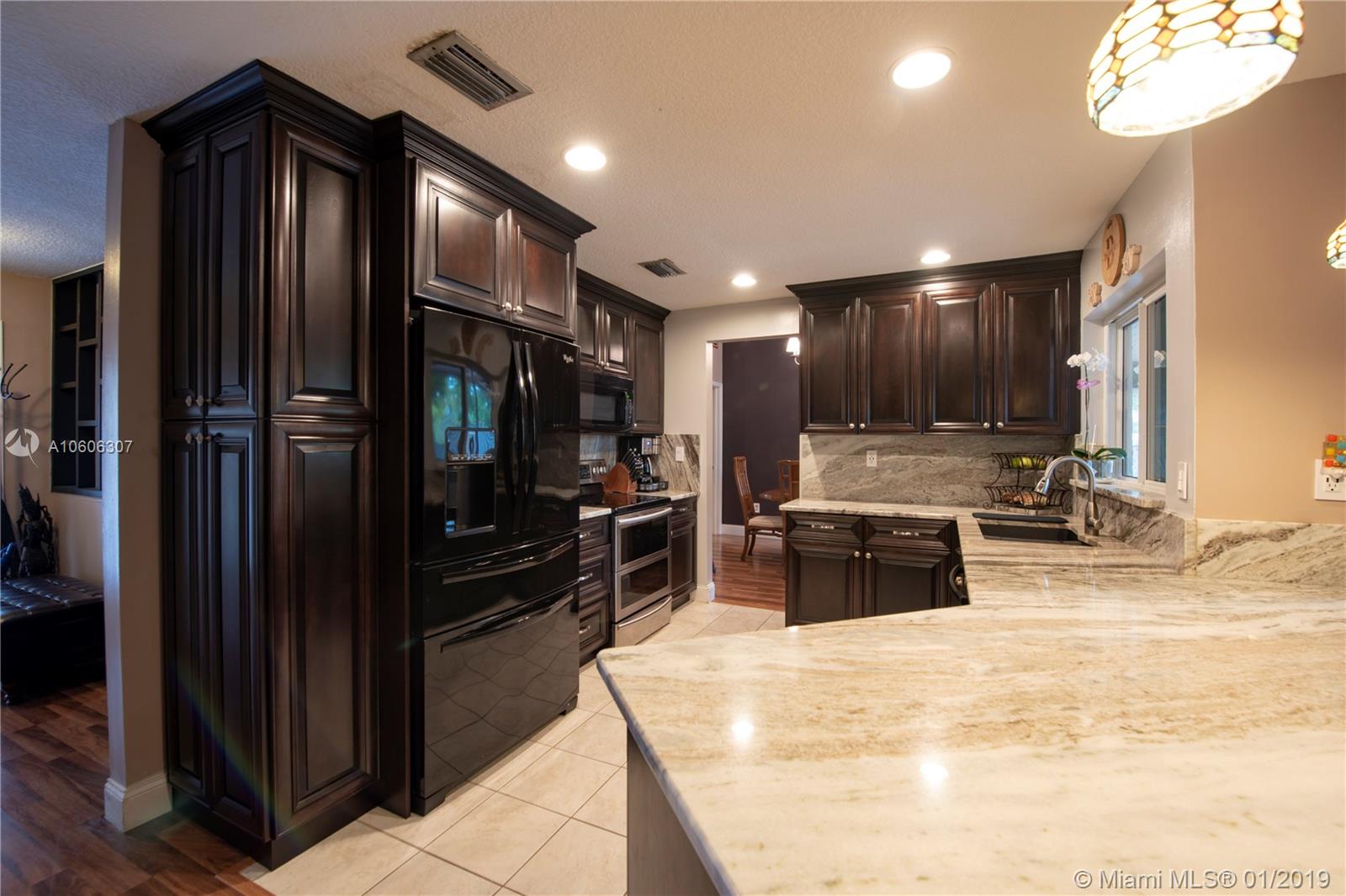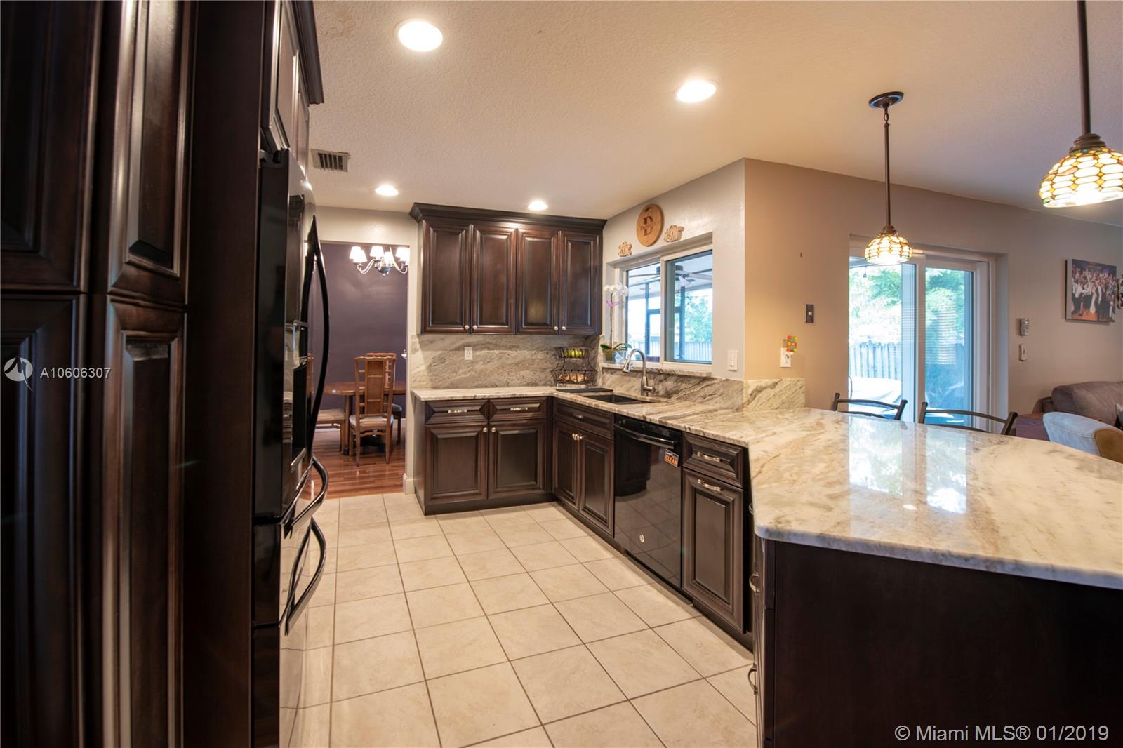 3/2 with a 2 car garage on a corner lot in desirable Flaming Gardens. This updated Flamingo model with Split bedroom floor plan and “Complete” impact windows, doors and garage door is move-in ready. New custom kitchen with stunning granite counters, wood cabinetry and pullouts in the pantry. Right off the kitchen is additional built ins with work area. The kitchen overlooks a large family room and has a pass thru window to the patio great for entertaining. Master bedroom has a walk in closet with built- ins. The master bath has dual vanities, an oversize shower complete with a spa shower head. The yard is fully fenced with double gates in the back. There is Circular drive for additional parking. No HOA ! Griffin Elementary School is on the same street within walking distance.