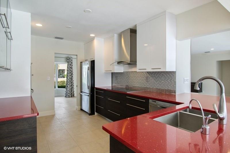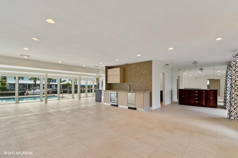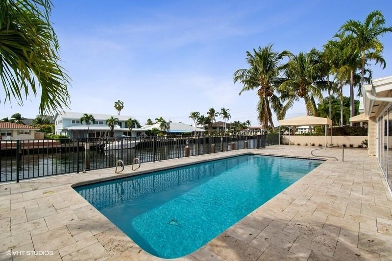 Absolutely gorgeous & tastefully renovated deep-water home situated just three lots to the Intracoastal with preferred south exposure! Some of the many upgrades include Impact glass (partial), European style kitchen with cool quartz counters, new stainless appliances and glass tiled backsplash. Sumptuous master bath w/ separate glass shower & soaking tub. Spacious & open entertaining areas with built-in wet bar w/ wine cooler & icemaker and a wall of Impact glass windows offering awesome waterfront views. Step outside to the sparkling heated pool surrounded by rich marble pavers and views of the Intracoastal.