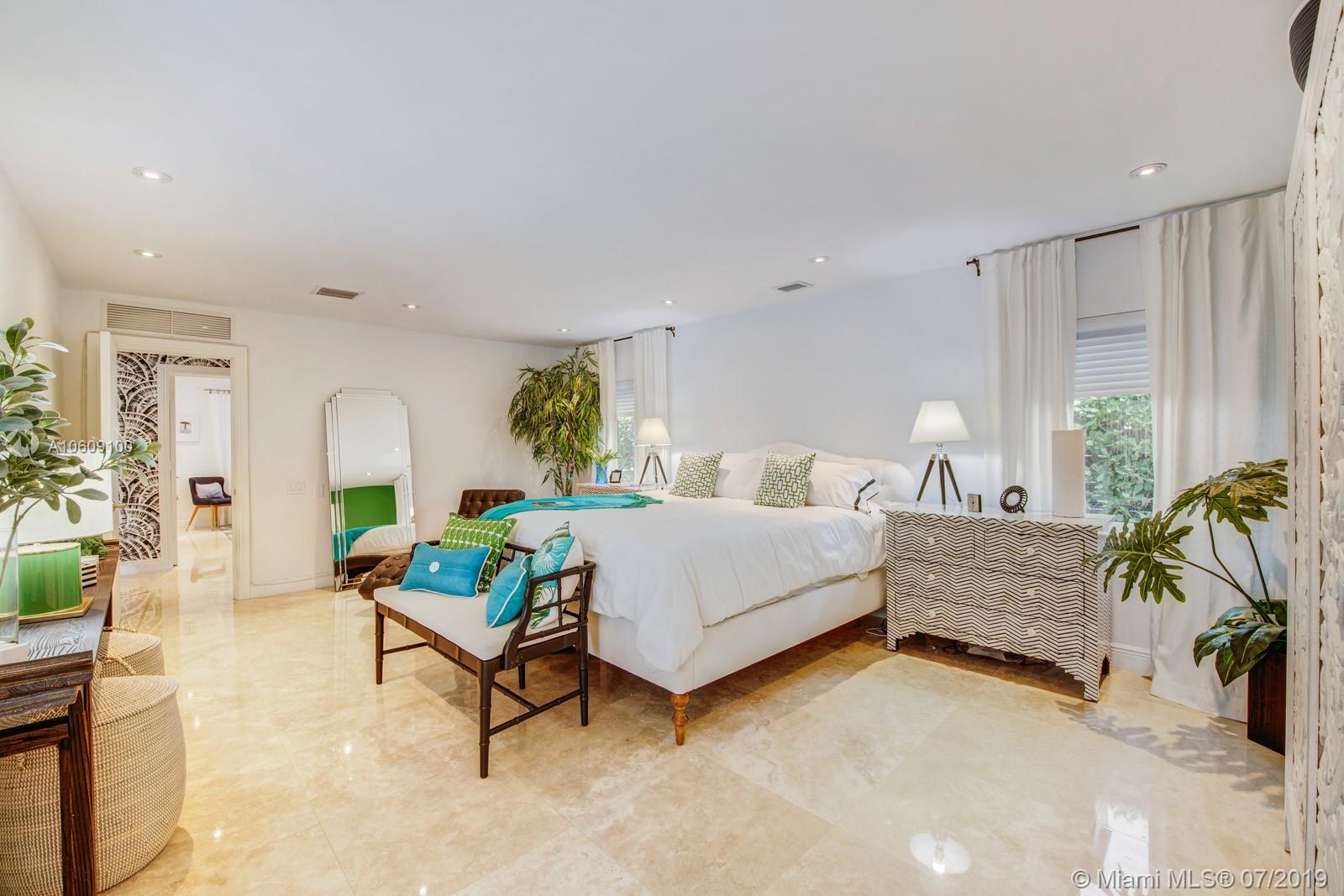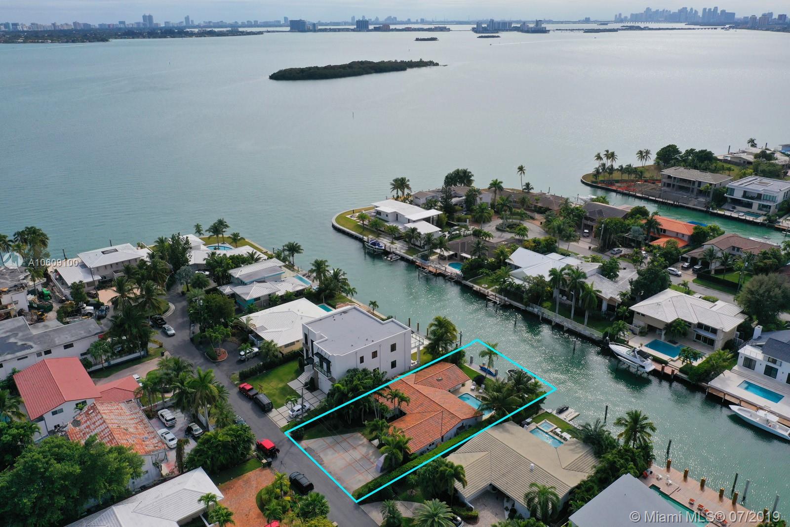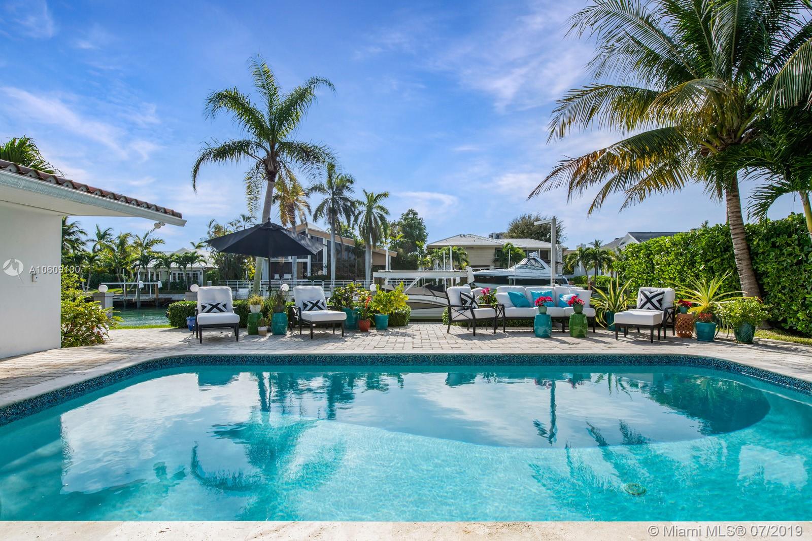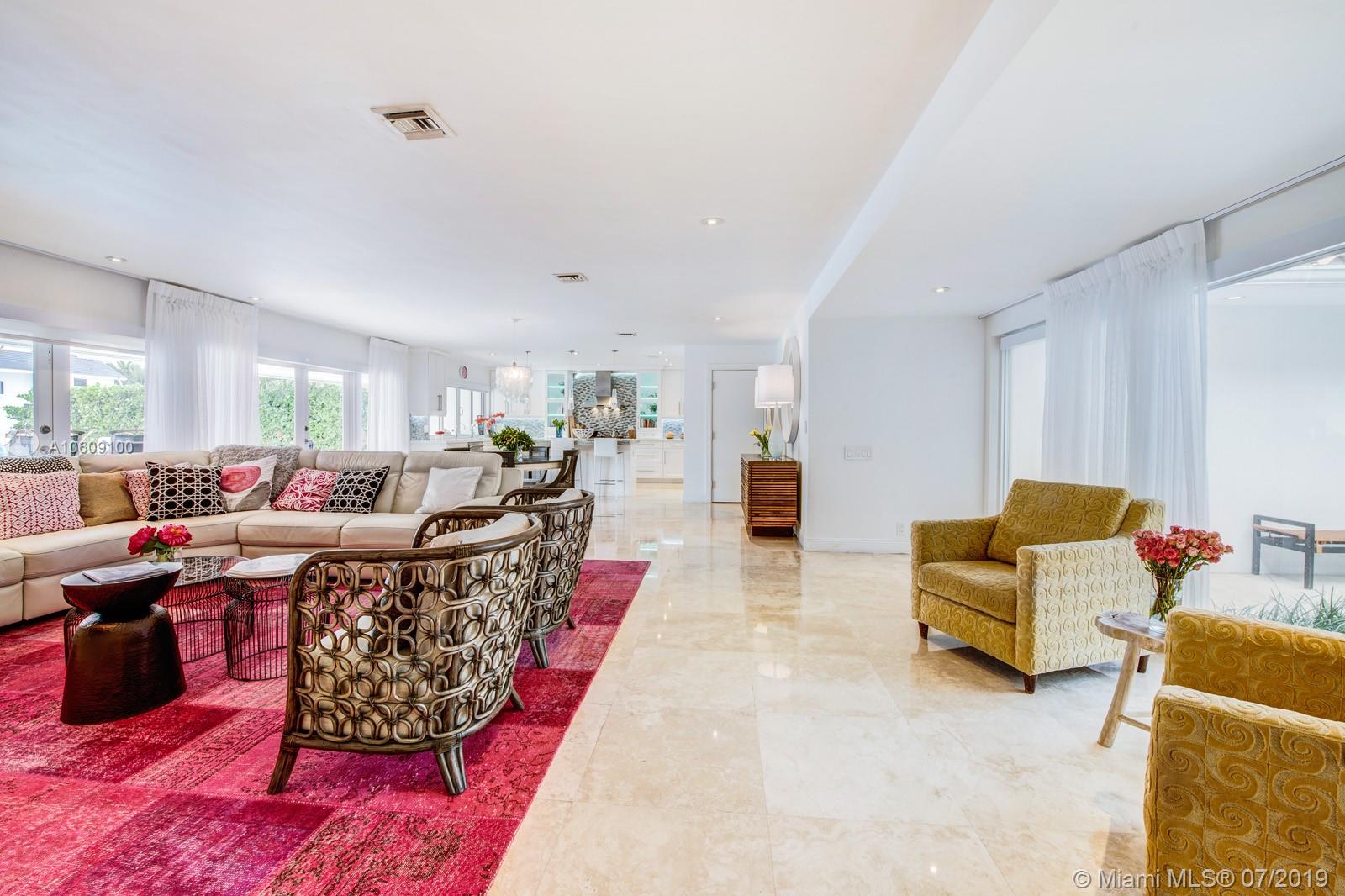 This elegant turn-key home sits four houses from the open Bay, no fixed bridges, ocean acess.75’ dock with h20 & electric. 2018 boatlift. Inside the guarded gate of Sans Souci Estates, this tropical waterfront home, with marble floors throughout, flooded with sunlight, features a large chef’s kitchen with an elegant emerald quartzite island & Thermador stainless steel appliances with natural gas. The open floor plan is exceptional for entertaining. Spacious master bed & luxurious master bath, large soaking tub & walk-in shower with water view. Walk-in closets. Saltwater pool. Built-in outdoor teak bar with fridge. Mosquito repellent & sprinkler system. Impact windows throughout. A short ride to luxury boutiques, restaurants & beaches in Bal Harbour. Make this piece of paradise yours!