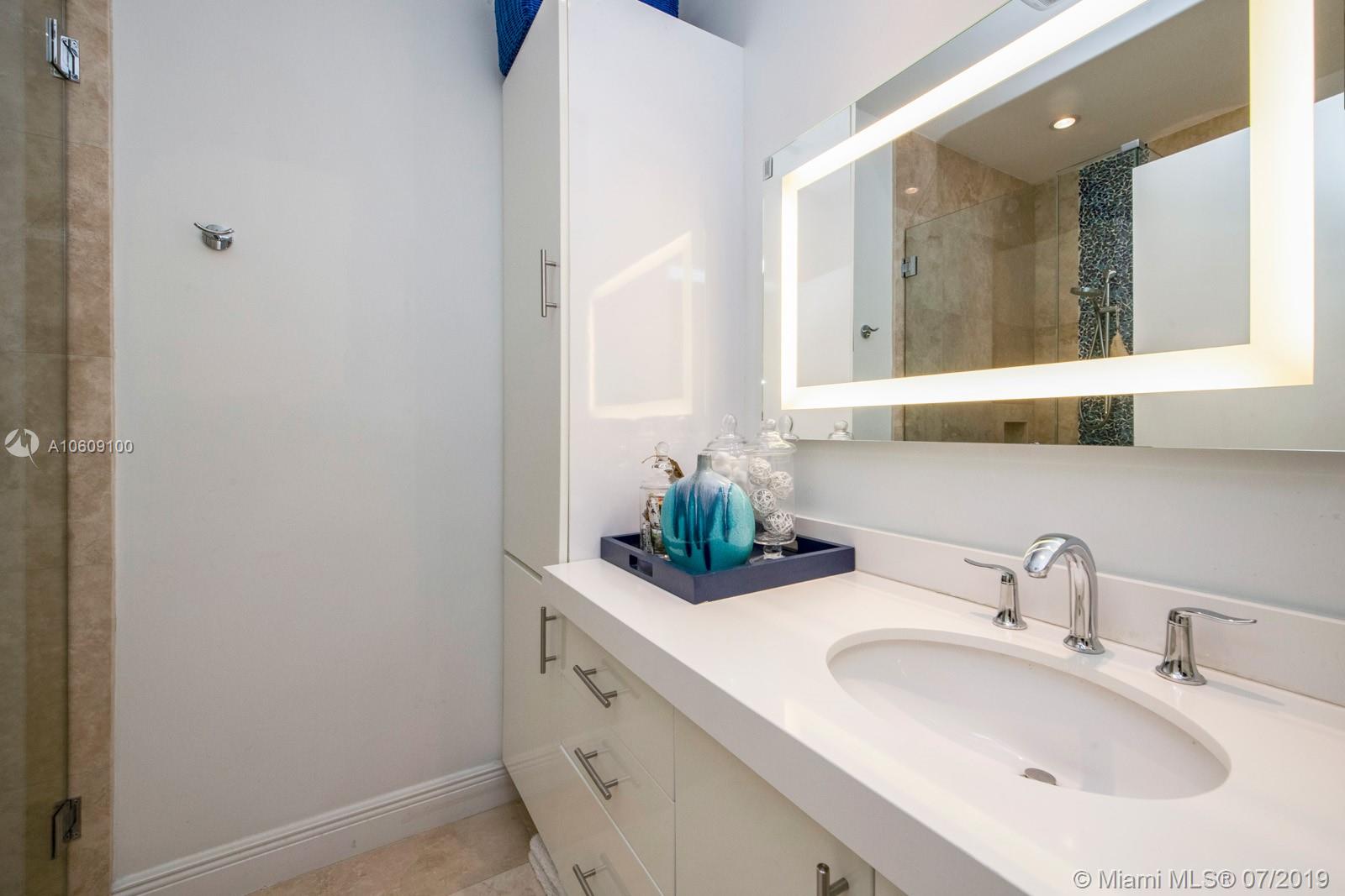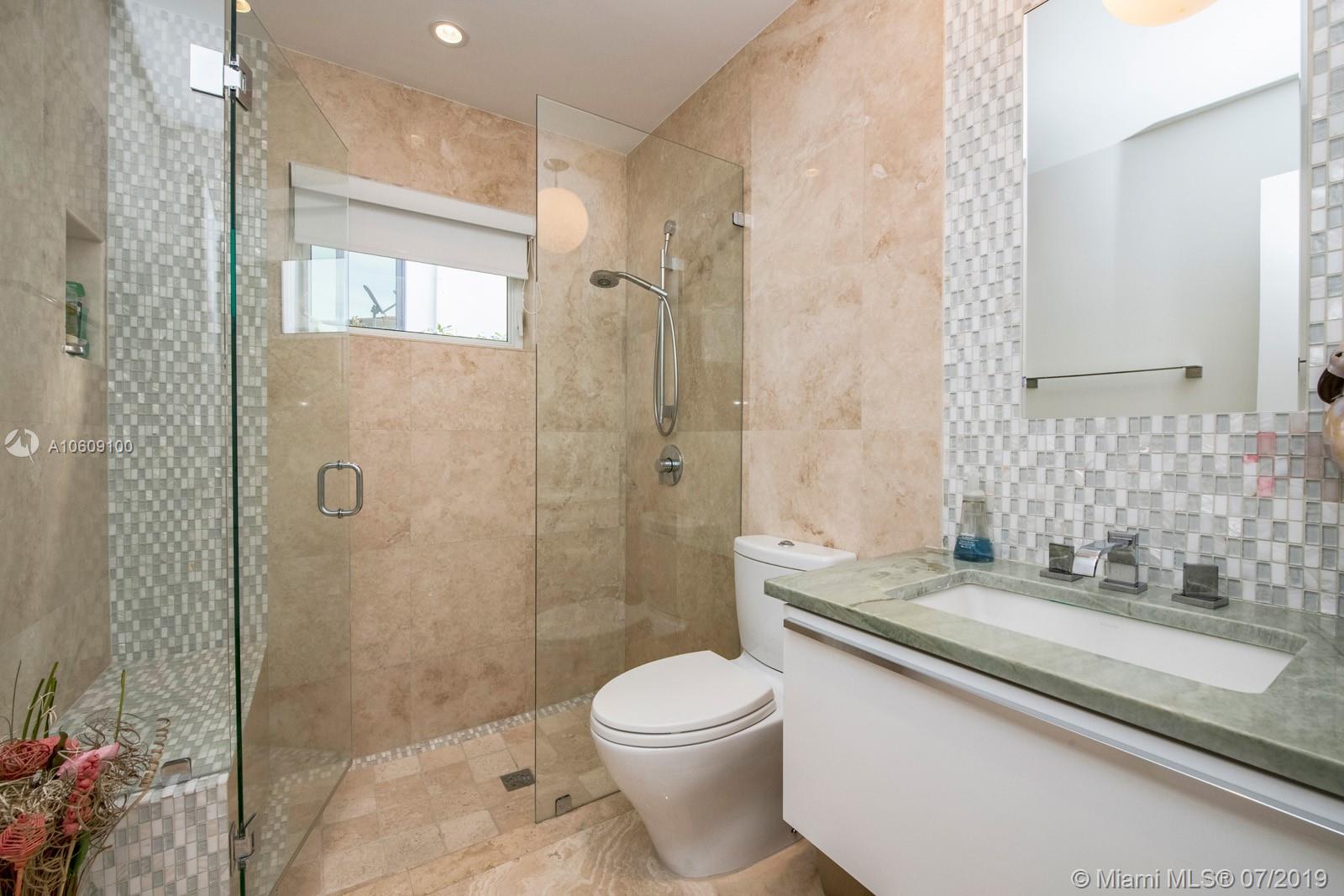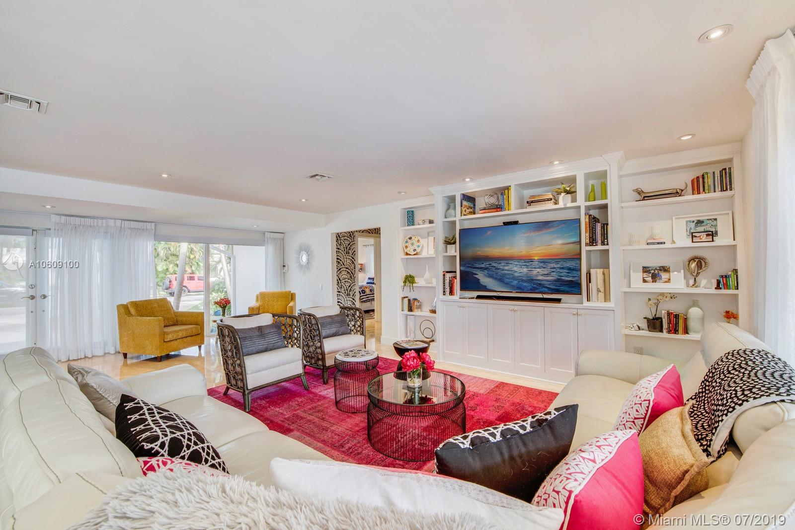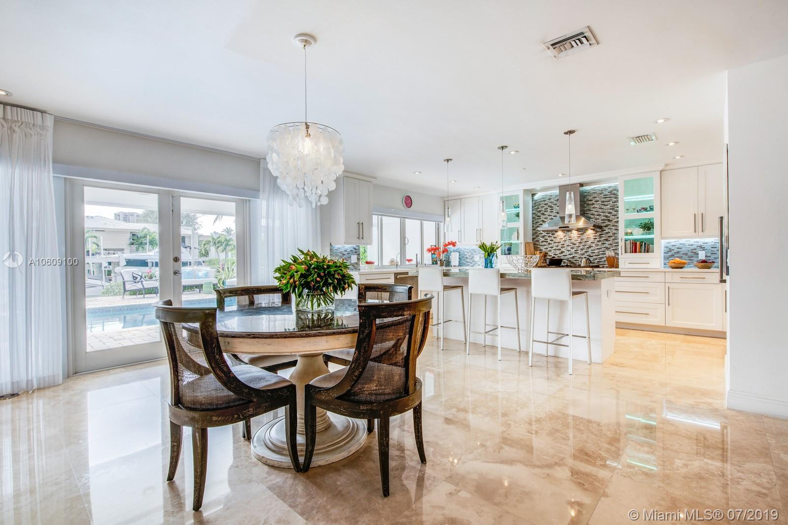 This elegant turn-key home sits four houses from the open Bay, no fixed bridges, ocean acess.75’ dock with h20 & electric. 2018 boatlift. Inside the guarded gate of Sans Souci Estates, this tropical waterfront home, with marble floors throughout, flooded with sunlight, features a large chef’s kitchen with an elegant emerald quartzite island & Thermador stainless steel appliances with natural gas. The open floor plan is exceptional for entertaining. Spacious master bed & luxurious master bath, large soaking tub & walk-in shower with water view. Walk-in closets. Saltwater pool. Built-in outdoor teak bar with fridge. Mosquito repellent & sprinkler system. Impact windows throughout. A short ride to luxury boutiques, restaurants & beaches in Bal Harbour. Make this piece of paradise yours!