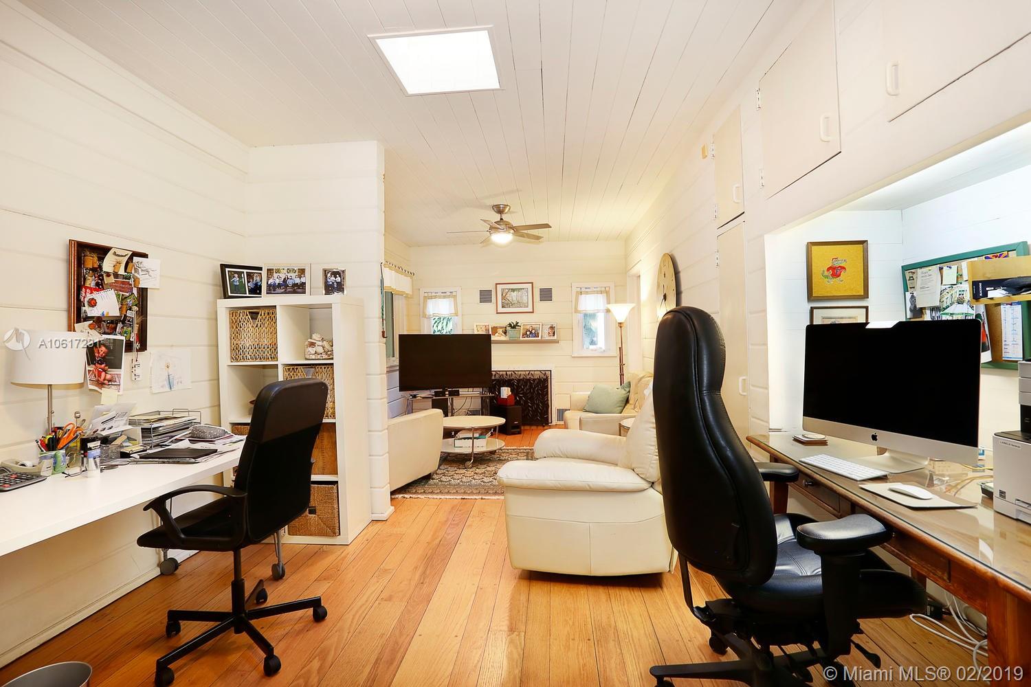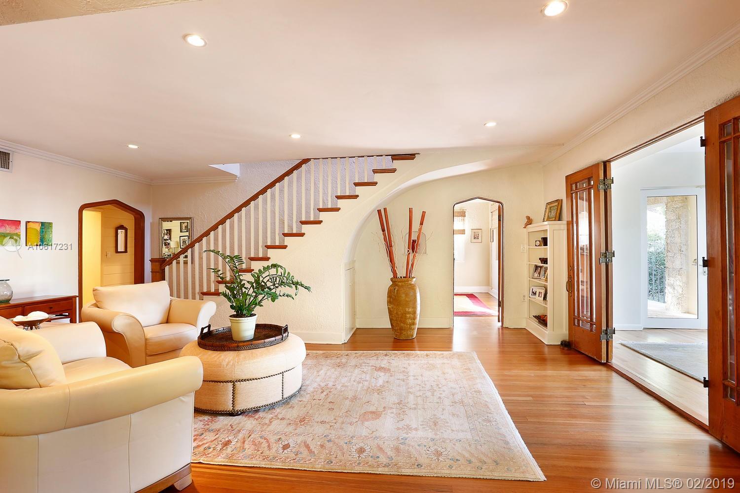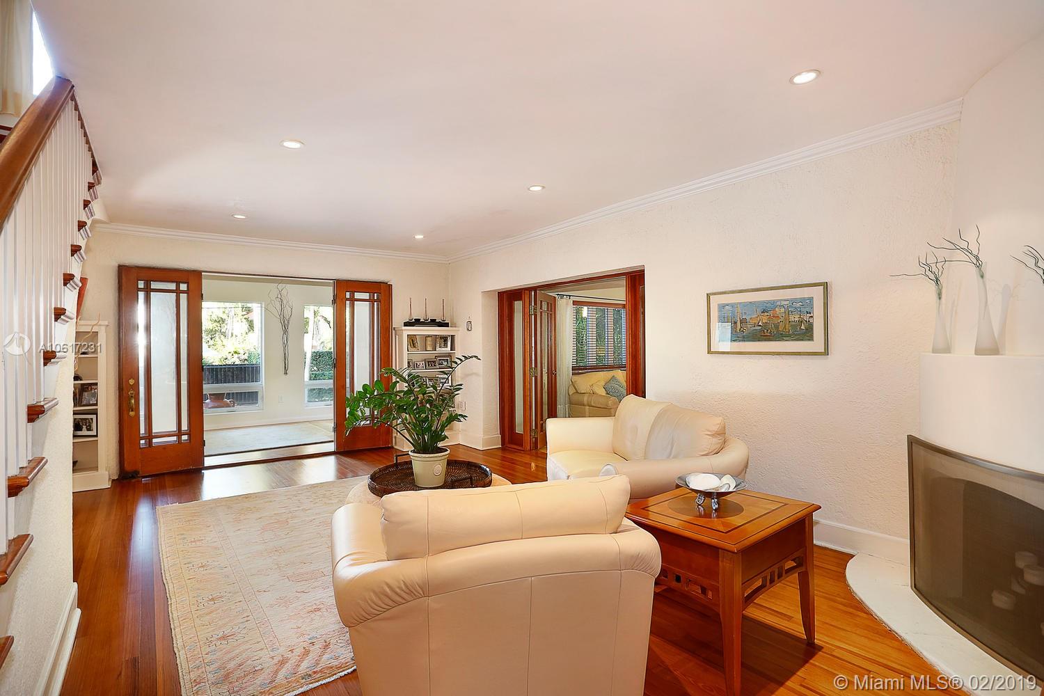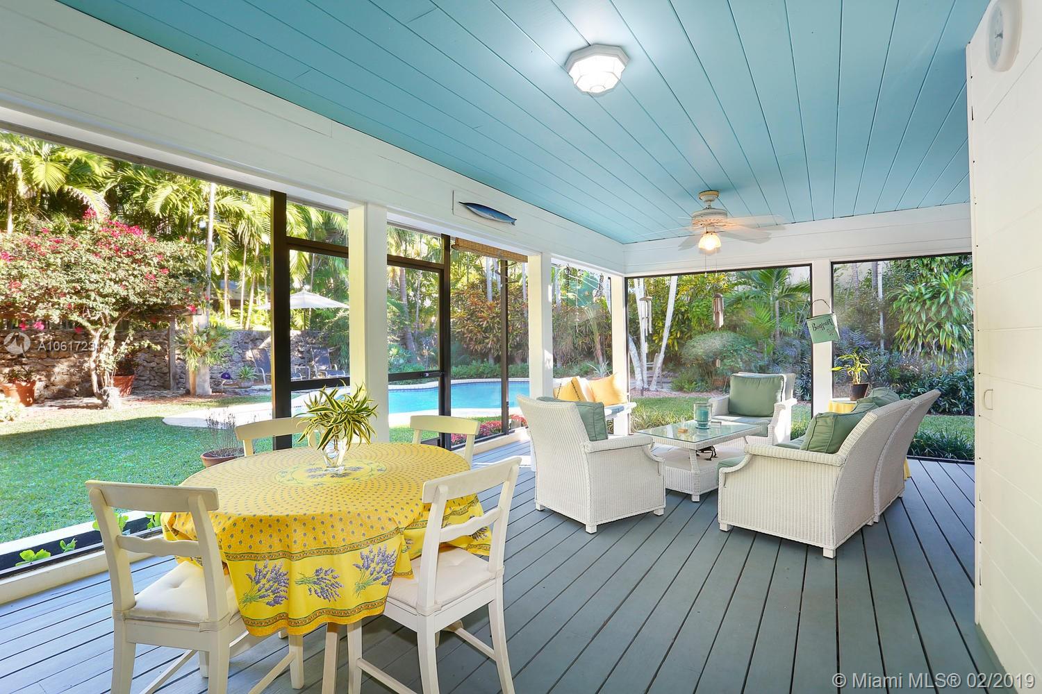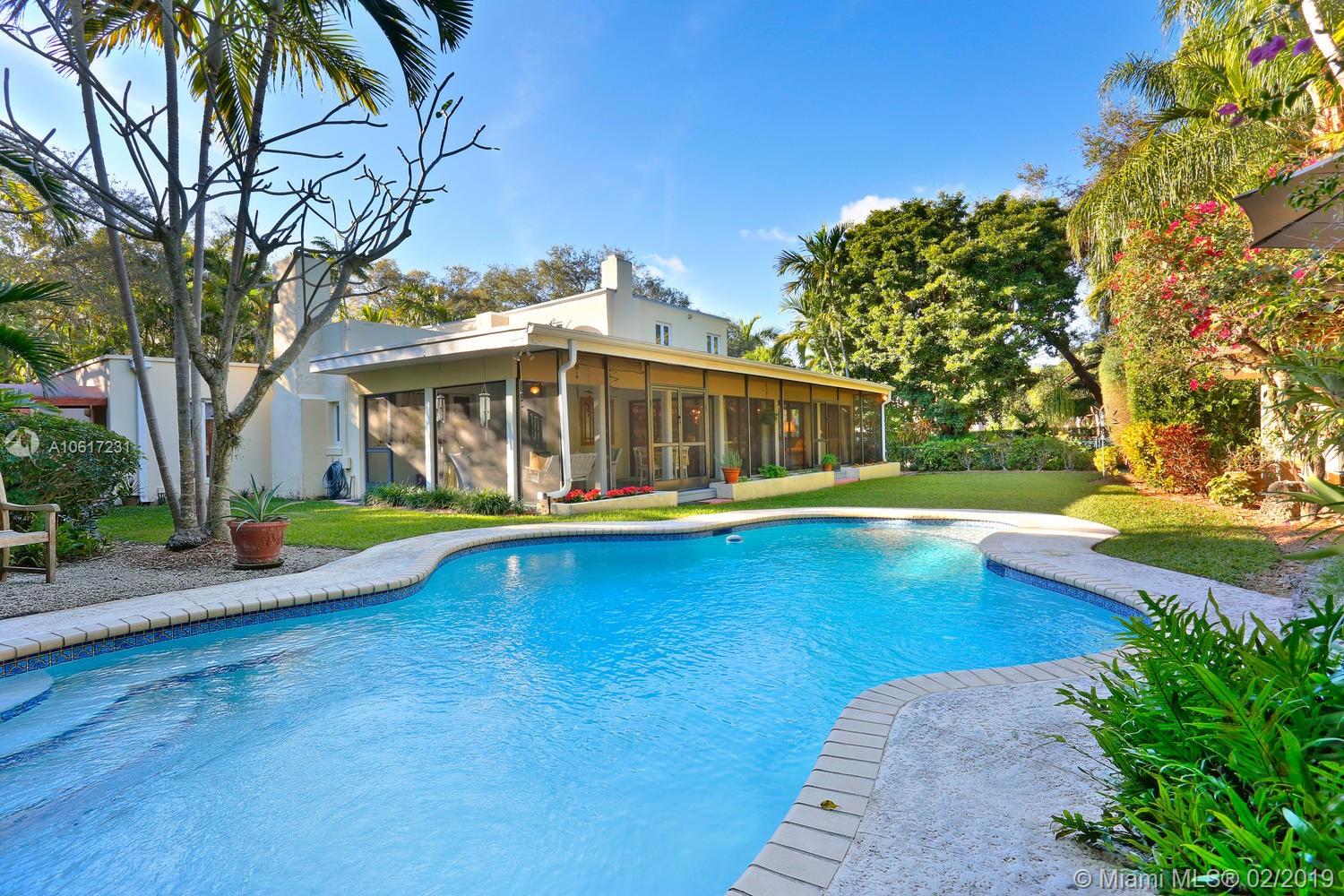 Architecturally unique home with striking coral rock facade, located on a quiet street in South Coconut Grove. The residence is walled, gated and surrounded by 14,000 SF of lush, tropical grounds. Renovation, restoration & expansion in 2005 by acclaimed architect Max Strang. Light-filled, expansive living spaces featuring grand foyer, formal living & dining, breakfast area, family room and den +office. Exquisite interior details include gleaming hardwood & terracotta floors and custom millwork/built-ins throughout. 2nd level master suite features over-sized walk-in closet & separate sitting room/office with fireplace. Enjoy year-round outdoor living & entertaining on the oversized “Old Florida” style screened porch that overlooks the ultra-private, magical garden and serene pool.