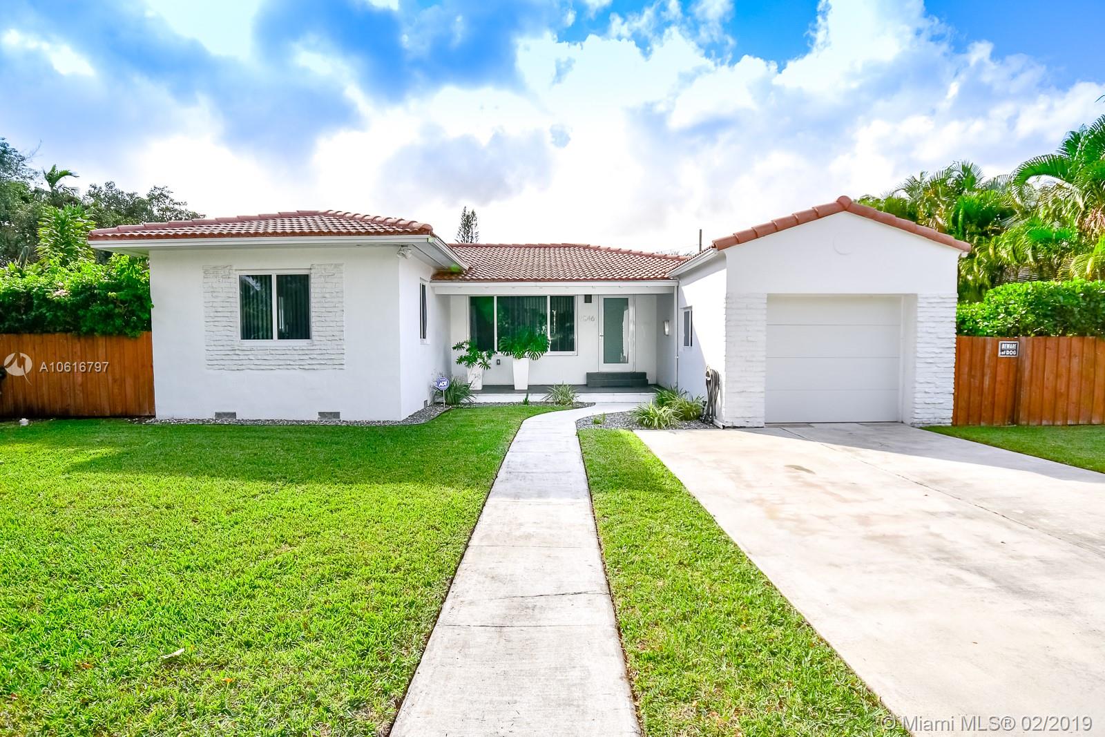Meticulously remodeled with no expense spared! This delightful Mid Century 2 beds & 2 baths features a gorgeous kitchen with SS appliances and quartz counter tops that opens up to a spacious living room and backyard, new porcelain tile throughout, new bathrooms, spacious master suite with custom walk in closet, hurricane impact windows & doors and much more.Located on a quiet block in Miami Shores, the resort style backyard has been tastefully landscaped, has a salt water pool and a large patio which is perfect for an afternoon barbecue or to host a family gathering. Additional features include new plumbing, updated electric and a converted garage which is ideal for a home office or additional bedroom. Within walk-in distance to local shops, restaurants, the theater and much more.Turn Key!
