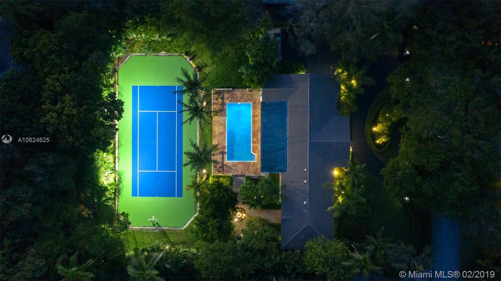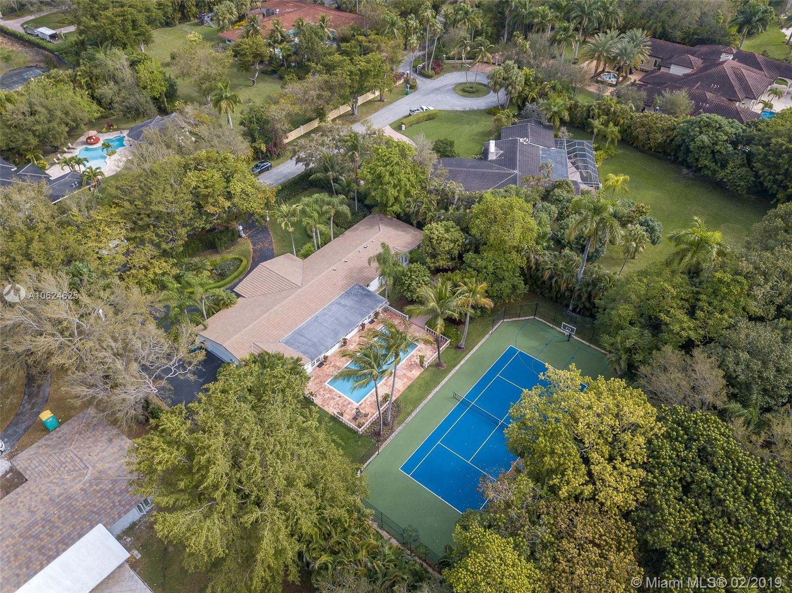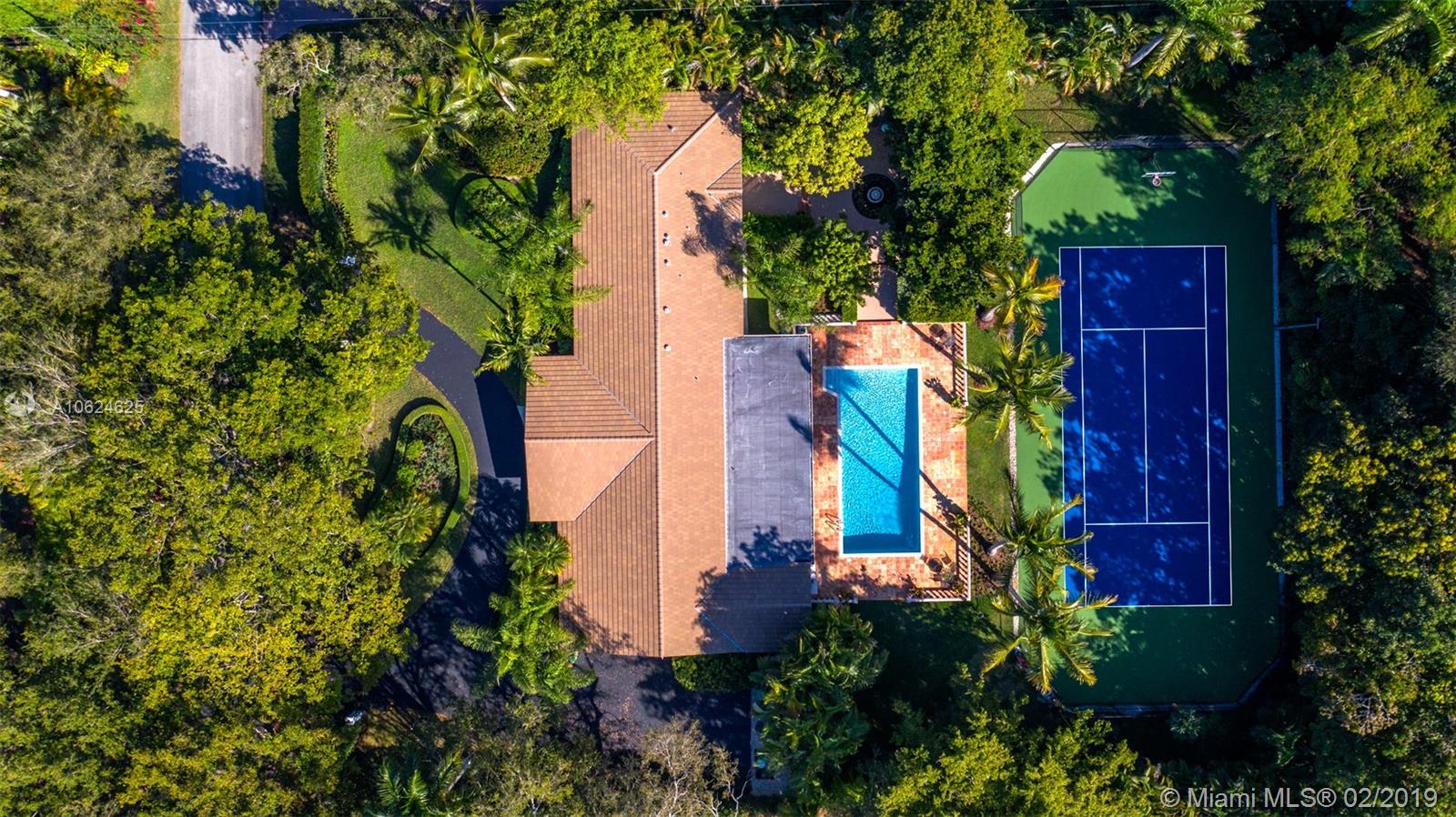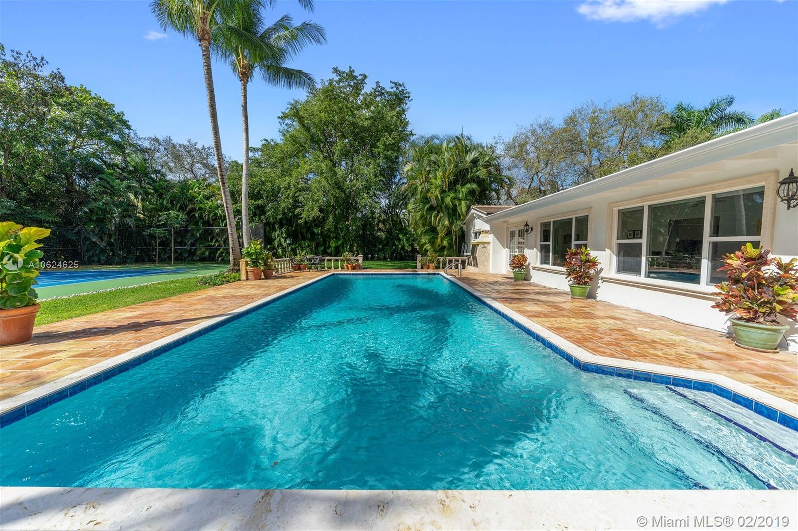 Ideal gated acre family home beautifully updated with style and comfortable everyday living in prime N. Pinecrest. Lovely tree-lined and cul-de-sac street, with tropical gardens, convenience and luxury of local parks, prime schools, superb shopping and dining. 6 BD, 5BA, bright open rooms, marble floors, quartz & SS kitchen w/passthrough pool views. Formal living & dining rooms, separate media room, relaxing family room opening to salt water pool, lighted tennis court and built in BBQ for your outdoor entertaining. Master bedroom wing w/private terrace, marble bath, & walk-in closets. 4 additional bedrooms, 3 baths, plus split 1/1 guest rm. Impact windows, shutters for bedroom wing, 2014 roof, 2013 AC, full-house generator.