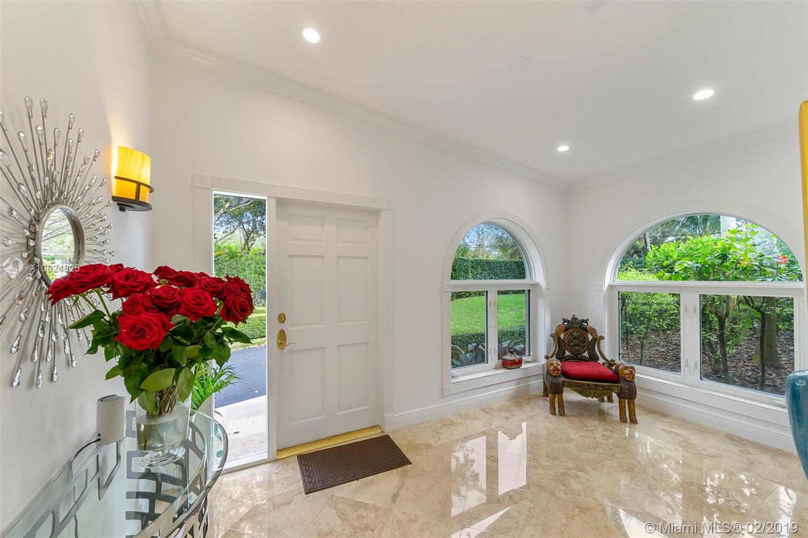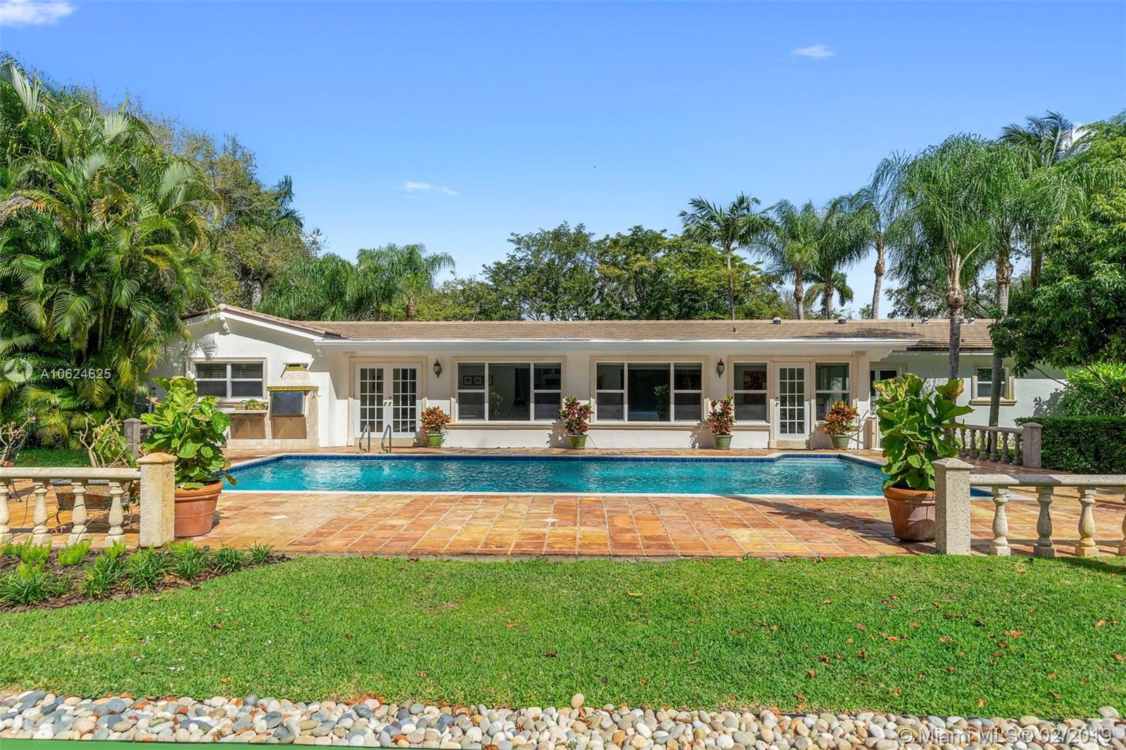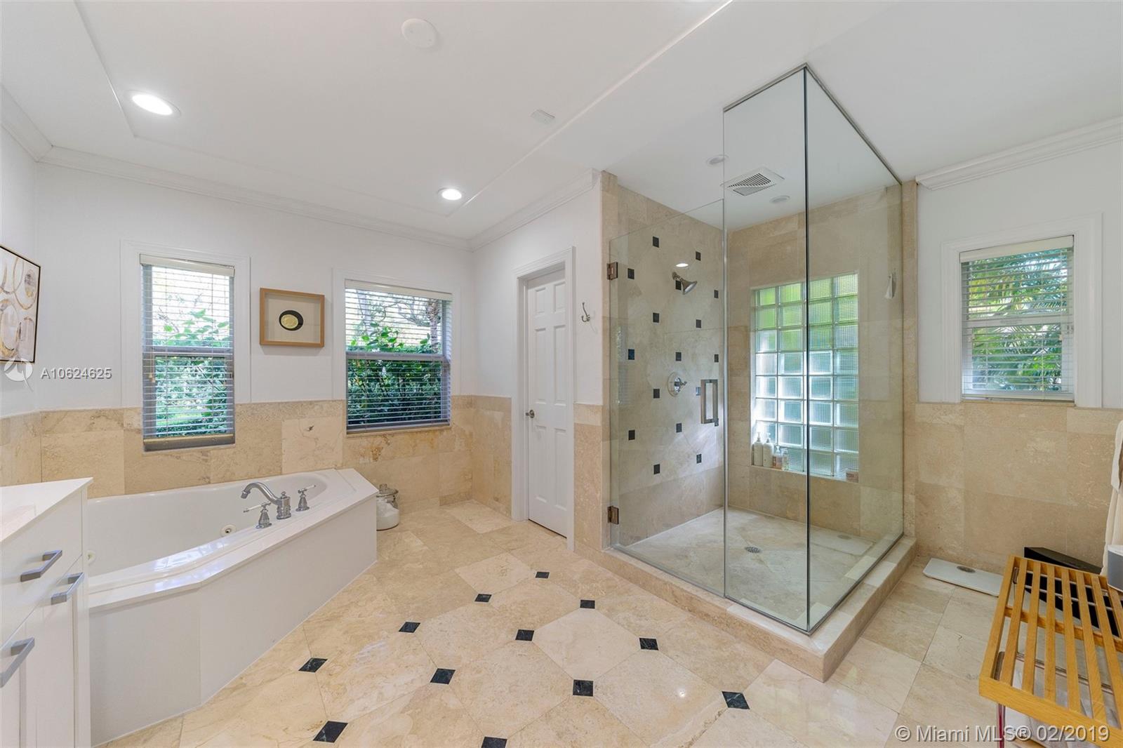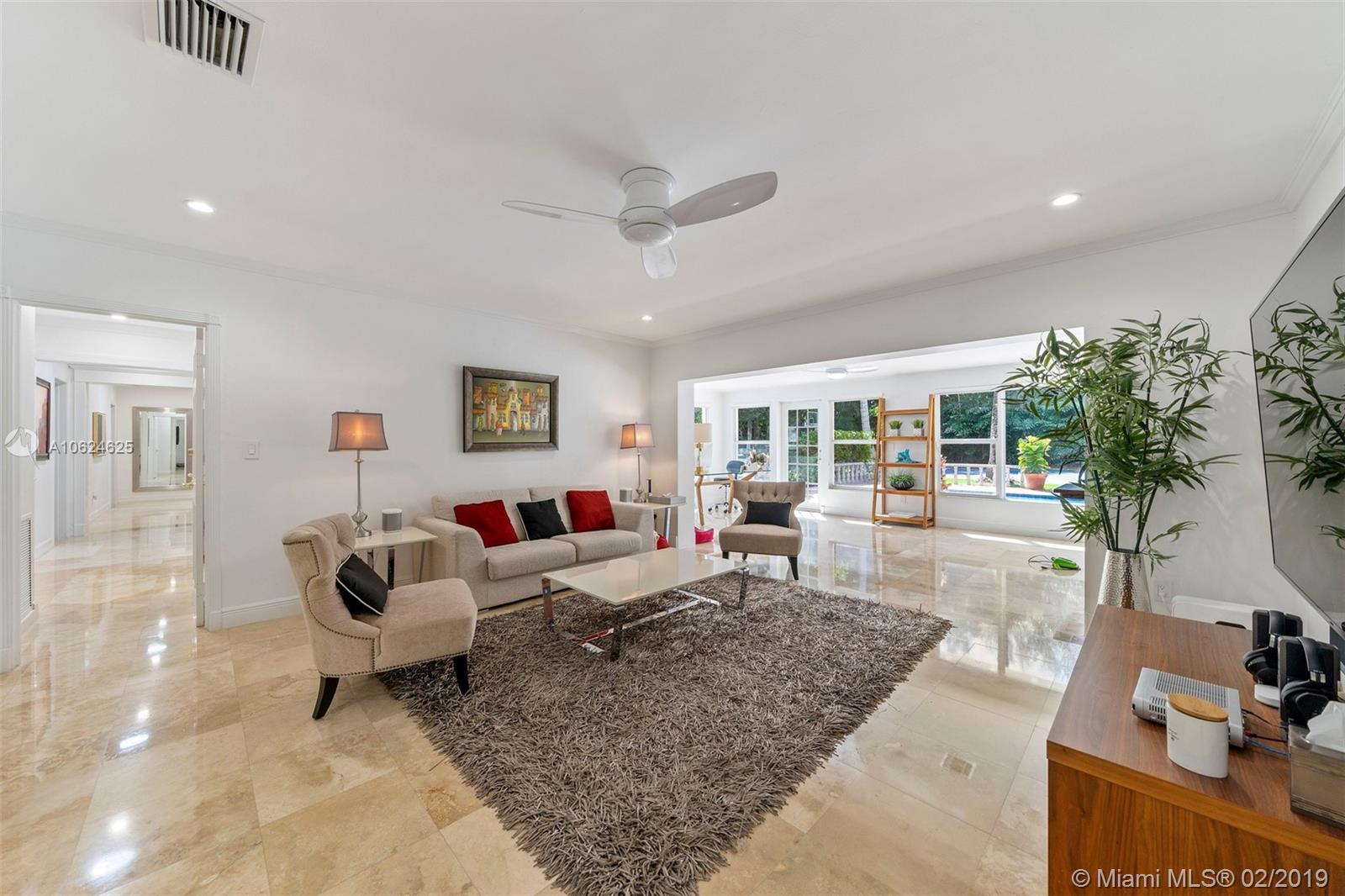 Ideal gated acre family home beautifully updated with style and comfortable everyday living in prime N. Pinecrest. Lovely tree-lined and cul-de-sac street, with tropical gardens, convenience and luxury of local parks, prime schools, superb shopping and dining. 6 BD, 5BA, bright open rooms, marble floors, quartz & SS kitchen w/passthrough pool views. Formal living & dining rooms, separate media room, relaxing family room opening to salt water pool, lighted tennis court and built in BBQ for your outdoor entertaining. Master bedroom wing w/private terrace, marble bath, & walk-in closets. 4 additional bedrooms, 3 baths, plus split 1/1 guest rm. Impact windows, shutters for bedroom wing, 2014 roof, 2013 AC, full-house generator.