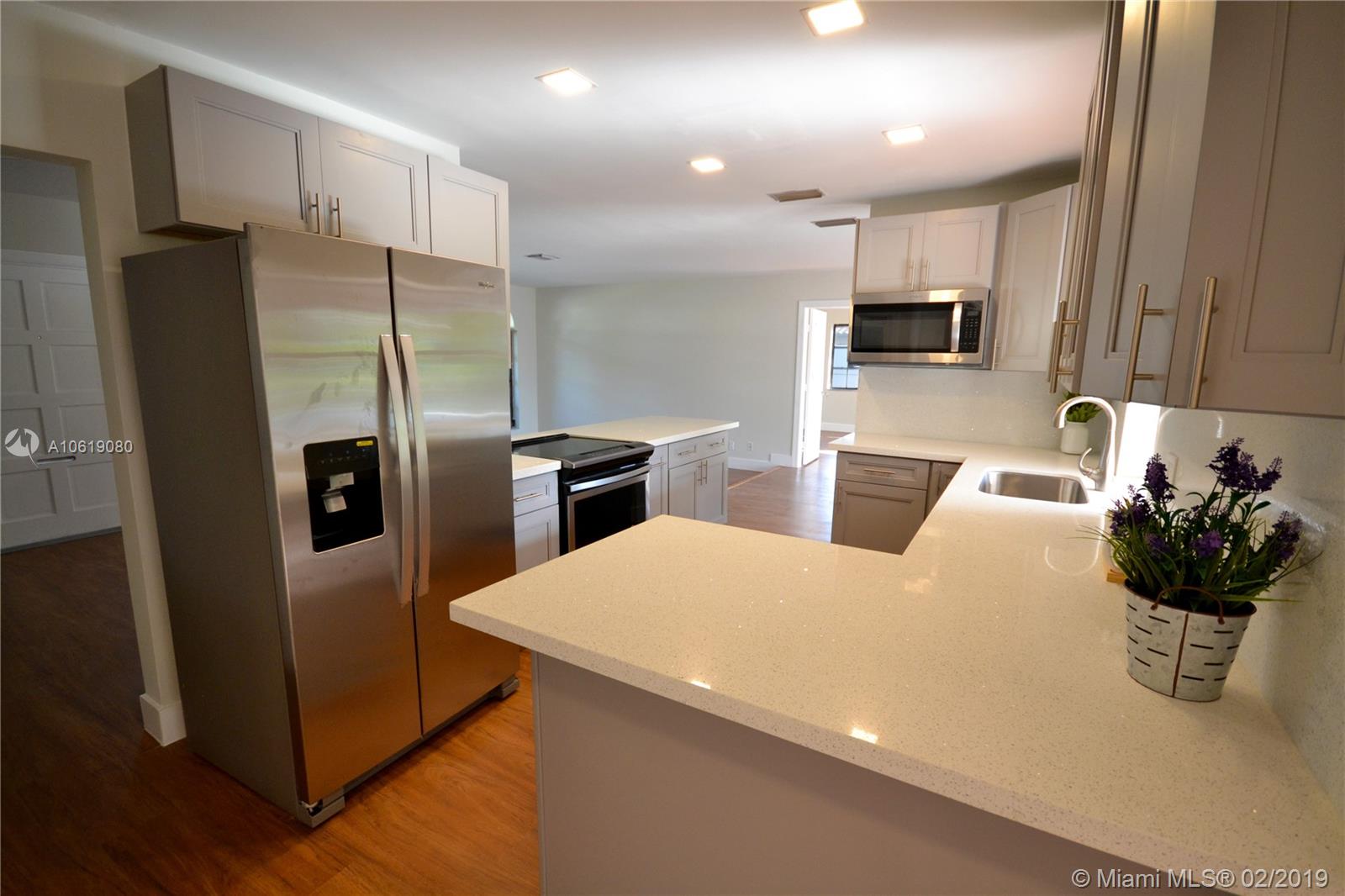 Imagine the comfort of living in a beautifully maintained community without the hassle, payments and fees of an HOA. This alluring house has been completely renovated, boasting a brand new tile roof, quartz countertops, new cabinets and stainless steel appliances in kitchen, marble tile in bathrooms and a beautiful family room with the most gorgeous chimney. From the master bedroom you have a unique view to the pool area, where you can unwind at your pleasure or invite family and friends to enjoy life at its finest. The all-around lawn has a sprinkler system so that you can maintain it green without the work of watering it every day. Garage has more than enough space for 2 cars, but can also be used to store everything you can think of.