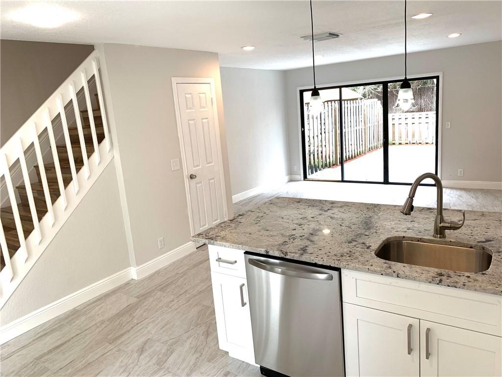 BEAUTIFULLY REMODELED TownHome with dual master suites, extra 1/2 Bath and Storage everywhere!! Open floor plan with contemporary plank flooring throughout. Brand new kitchen with stainless steel appliances, bright white solid wood cabinets, and a luxurious granite counter-top with stainless steel under-mount sink. Up the beautiful wood stairs are 2 master bedrooms; one with 2 closets and the other with an extra large closet; new bathroom vanities, new lighting and new fixtures. The living room has a large sliding glass door leading to a clean fenced in outdoor area with newly painted concrete deck and exterior closet. Washer/Dryer inside near bedrooms. Extra closets upstairs & down! $75 monthly maintenance fees include lawn care and up-keep of the common areas & exterior.