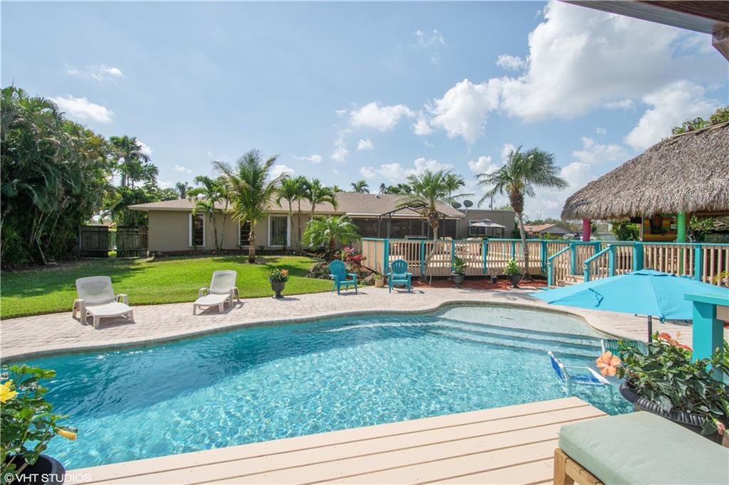 This beautiful home, located in Plantation Acres, features 4 bedrooms and 3 baths + office/den. New floors throughout house, with fully updated master bath/walk-in closet. Completely renovated kitchen with all Stainless Steel appliances. New roof, A/C, and landscape. Screened in porch, freshly painted tiki bar and deck leading down to pool and cabana. Large circular driveway with a second driveway leading to a two car garage. Second garage is currently converted to workshop. Family park located walking distance as well as great schools. Perfect house for family and entertainment.
