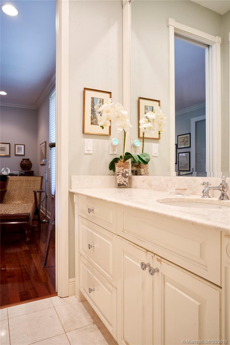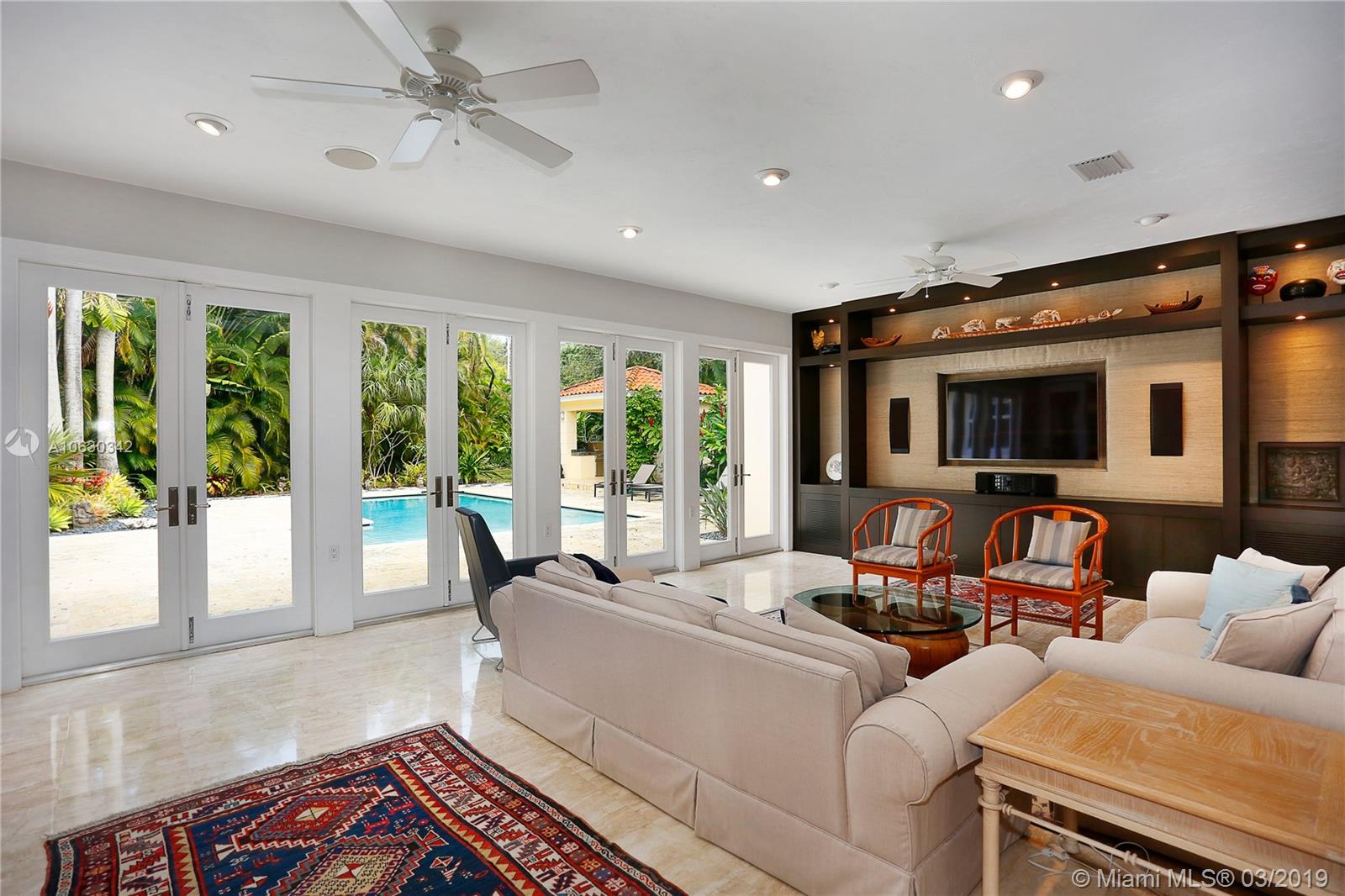 Absolutely beautiful home on private tree lined street in South Gables. This 5 bedroom, 6 bathroom home has been exquisitely updated including a newly enclosed family room, new gourmet kitchen, new master bathroom, full house generator, and impact glass windows and doors. Magnificent oaks and lush landscaping welcome you into this gated property and fabulous one story house with center great room with vaulted ceilings. Generous rooms and split plan make this home so wonderfully livable! The backyard features a newly resurfaced pool, covered patio and outdoor summer kitchen with cabana bath, all on the most private 27,000+ square foot lot. 2 car garage, laundry room, gym, and Pinecrest Elementary!