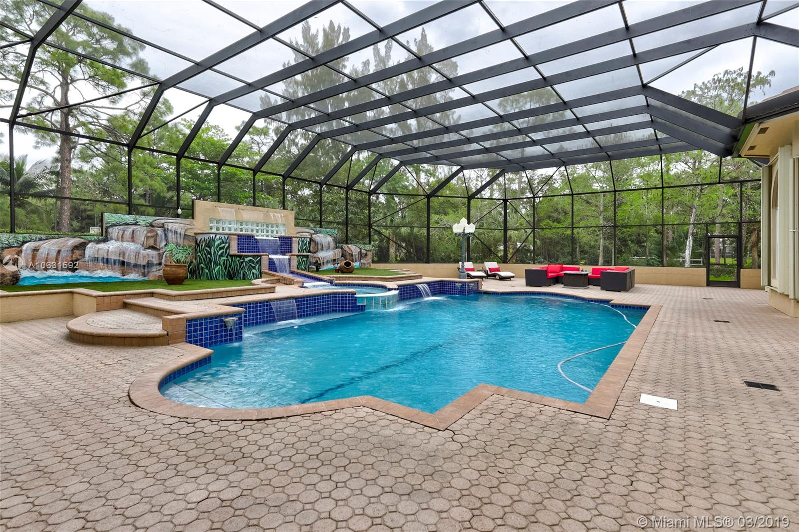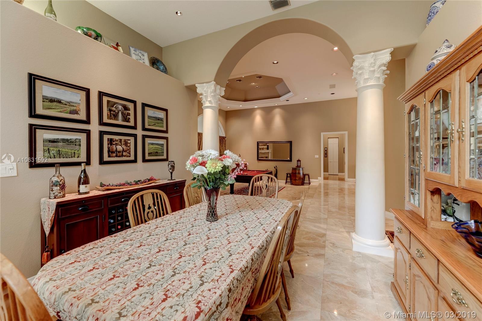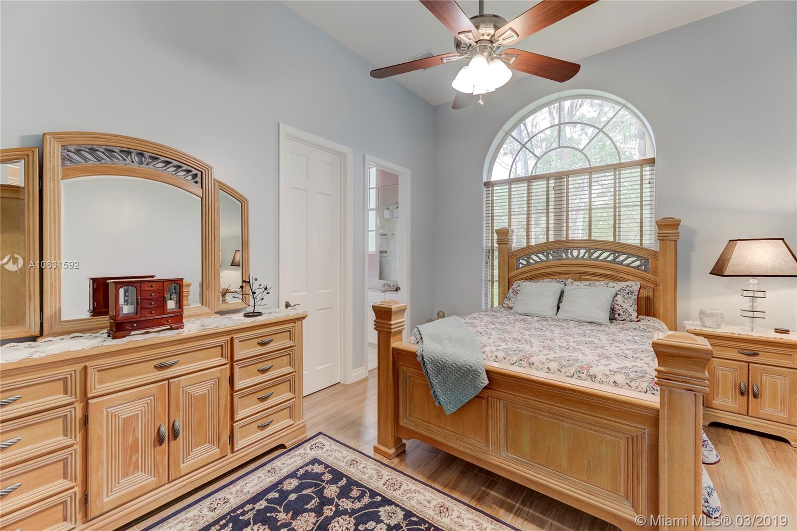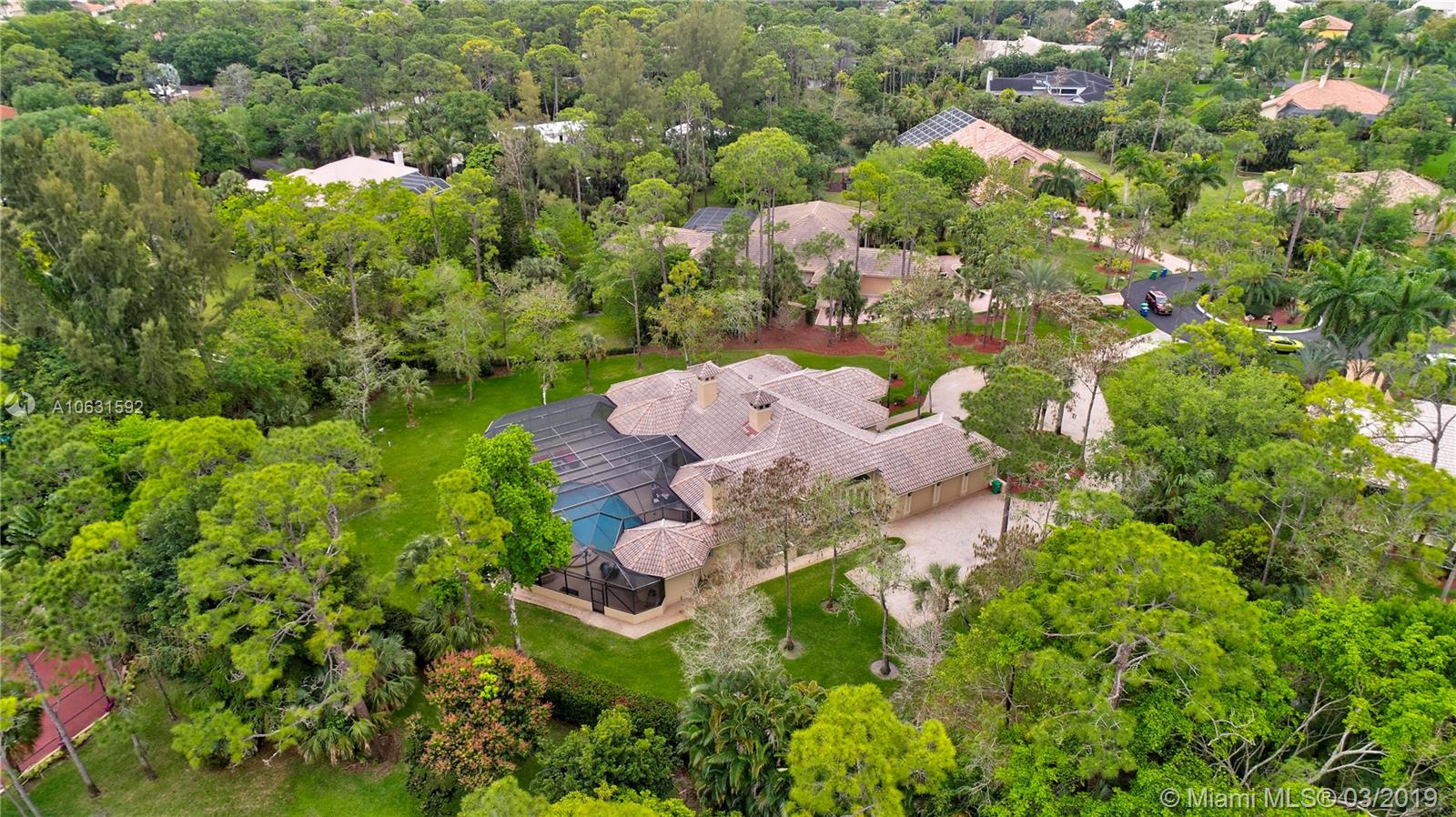 Impeccable 4,800 SQ FT home built in 1994 on 1.25 acre cul-de-sac lot in prestigious Whispering Woods. This is the only community in Coral Springs with 1+ acre lots that is 24-hour manned and gated. Stunning grand entrance invites you to this 4 bedroom/5 bath (3 full & 2 half) with marble tile floors. Home also has a den and a gym. Master suite has two walk in cedar closets with cabinetry. Dream kitchen has been totally remodeled with top of the line Thermador appliances, Silestone Quartz countertops and an oversized island. Kitchen has a built-in wine refrigerator and a built-in microwave drawer. There are three working gas fireplaces and two attics with floors for storage. Laundry room has Bosch large capacity washer and dryer and plenty of cabinets.