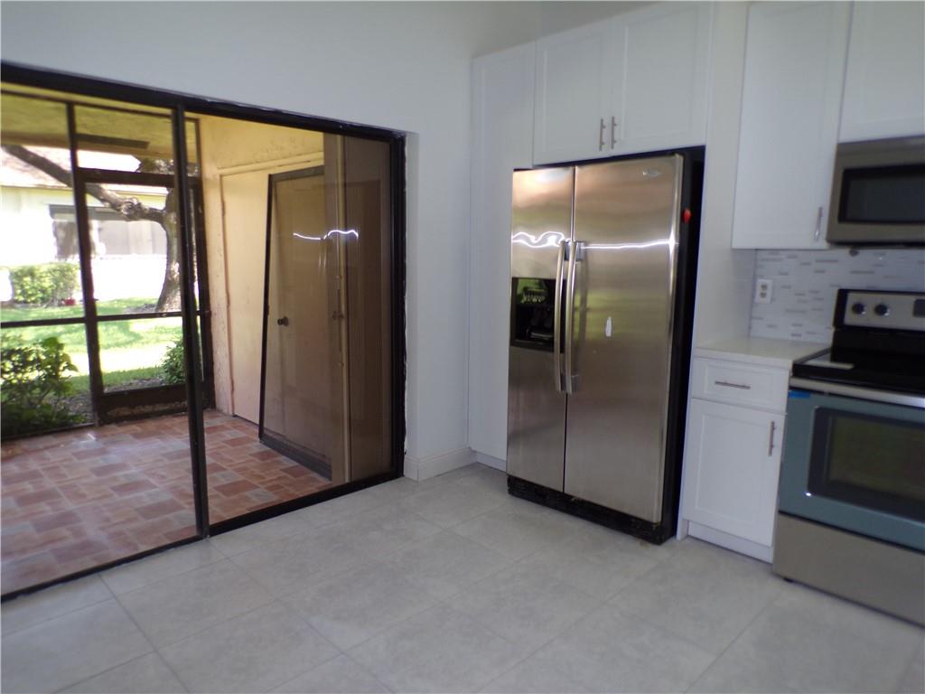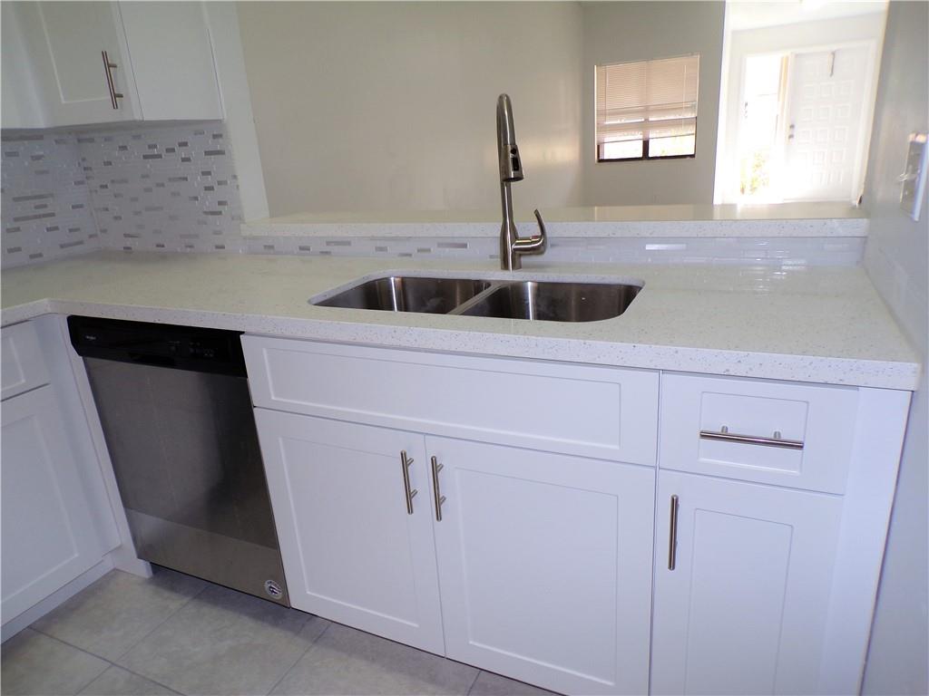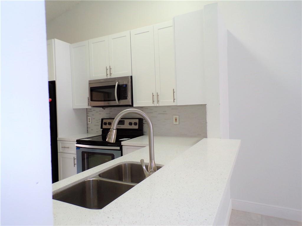 GORGEOUS INTERIOR, NEWLY RENOVATED INTERIOR WITH BRAND NEW TILE FLOORING IN LIVING ROOM, NEW WOOD LAMINATE FLOORS IN BEDROOMS, BRAND NEW KITCHEN WITH QUARTZ COUNTERS, UPGRADED WHITE CABINETS WITH BRAND NEW STAINLESS STEEL APPLIANCES. BATHROOMS ALSO REMODELED TO INCLUDE NEW TILE, BRAND NEW VANITIES WITH DESIGNER SINKS, LARGE WALK IN CLOSET IN MASTER. ACCORDION HURRICANE SHUTTERS, SCREEN PATIO OVERLOOKS OPEN GREEN AREA..GREAT COMMUNITY WITH LOW HOA DUES OF $190 PER MONTH