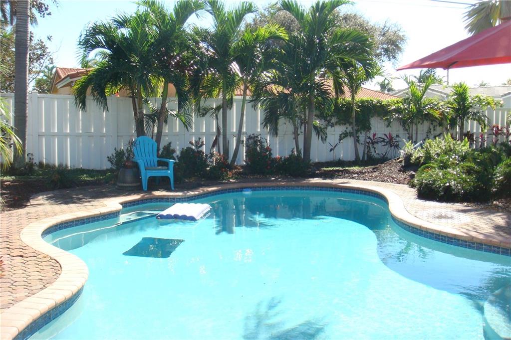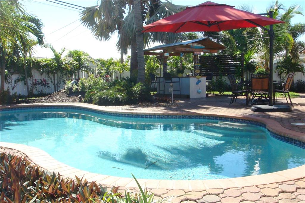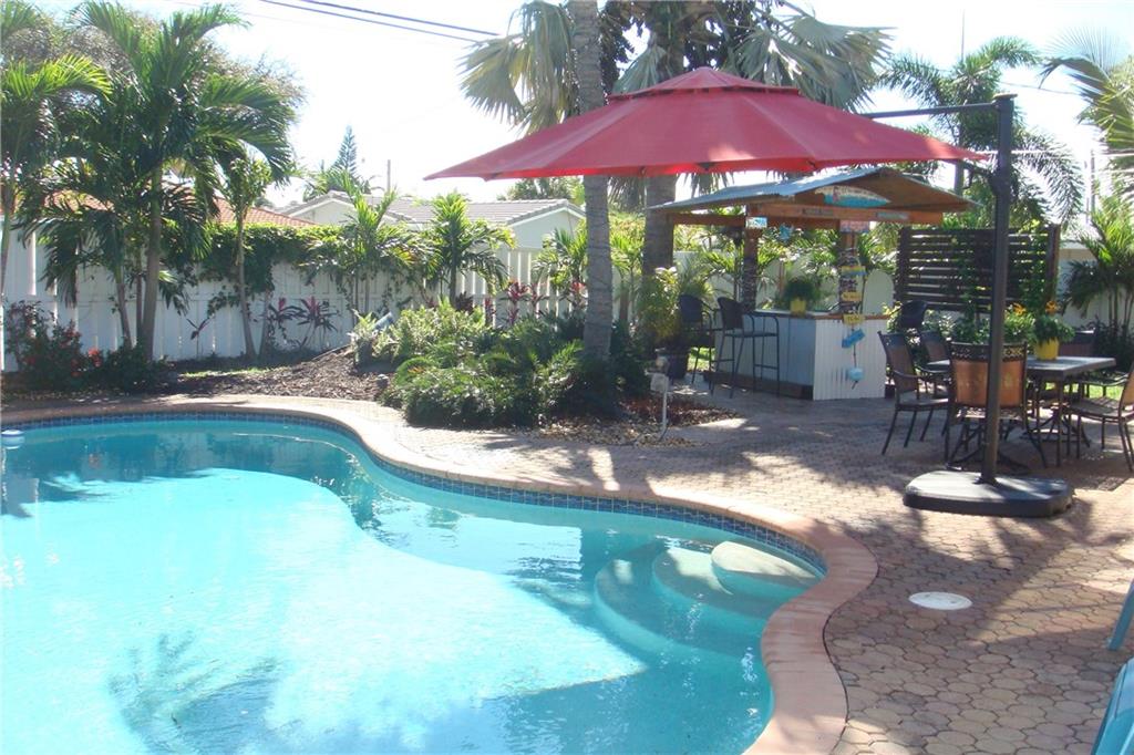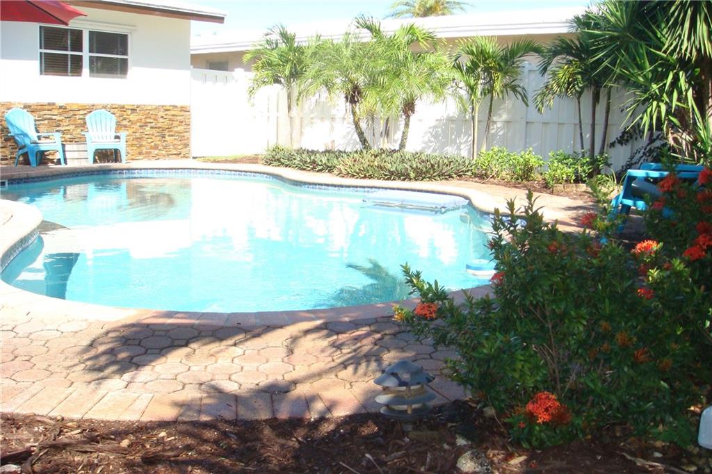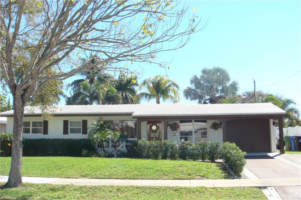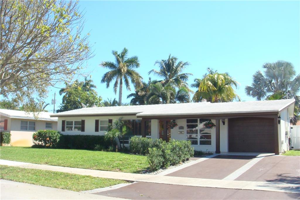 Excellent location & curb appeal on one of the prettiest streets in Imperial Point with sidewalks & mature trees. The absolutely gorgeous backyard with preferred southern exposure feels like a resort with sparkling pool, tiki hut, bar, waterfall, tropical landscaping & privacy fence all around. 3 bed 2 bath home with 1 car garage & separate laundry room, with plenty of room to expand if needed in the future. Updated open kitchen to dining area & french doors to garden. Tile throughout. Master bedroom w/ensuite bathroom. 3rd bed currently used as an office with ultra cool sliding barn doors. This is a great home with a backyard to fall in love with & enjoy S.Florida living all in a fantastic desirable neighborhood, close to beaches, shops & restaurants. A must see at this new price point.