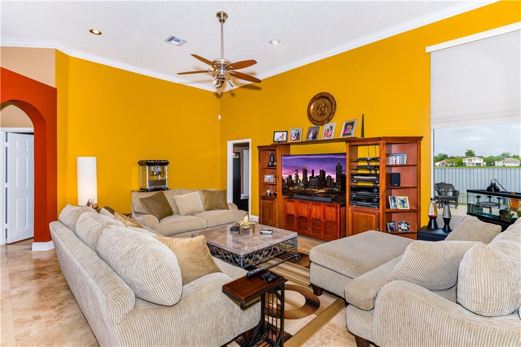 Total Paradise awaits with one of the nicest waterfront lots in Weston with the sunsets that create memories. One story 5/4.5 plus office with 3 car garage with tons of upgrades including travertine throughout, Kitchen updated with all the fine appointments, Master Bath and secondary baths remodeled. Step onto pool deck with huge overhang and plenty of room to entertain. Pool and raised spa offer endless relaxation and entertainment while enjoying the breeze off the water and the palm trees swaying. Fenced lot. Cabana Bath. Secondary bedrooms are large and two of them have insuite baths. Laundry room is even spacious. Immaculate condition. Click on "Virtual Tour" and see the property. Small Gated Community with basketball, volleyball, and playground within quick walking distance.