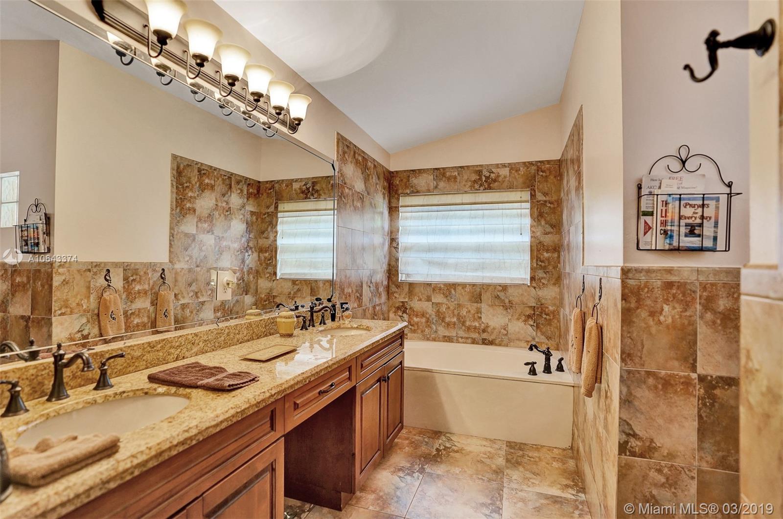 Hard to find, one story home with free-form saltwater pool in the West Davie area. New roof and Accordion Shutters throughout the entire house. High vaulted ceiling, separate living areas. The kitchen and bathrooms have wood cabinets and granite countertops. Oversized master bedroom with en-suite bathroom featuring a roman tub and separate stand-up shower, walk-in closets and dual vanities. The ample second bedroom also boasts a walk-in closet. The sparkling heated pool with an inviting spa. The nice size patio is completely fenced. Recently painted outside. Easy access to shopping centers and highways. Savings with Copperflect insulation and solar panel water heater. Pavers for the back patio and a shed that will remain with the house. Very Low HOA.