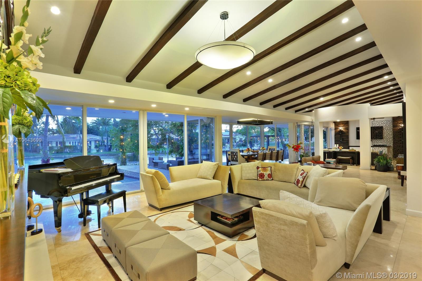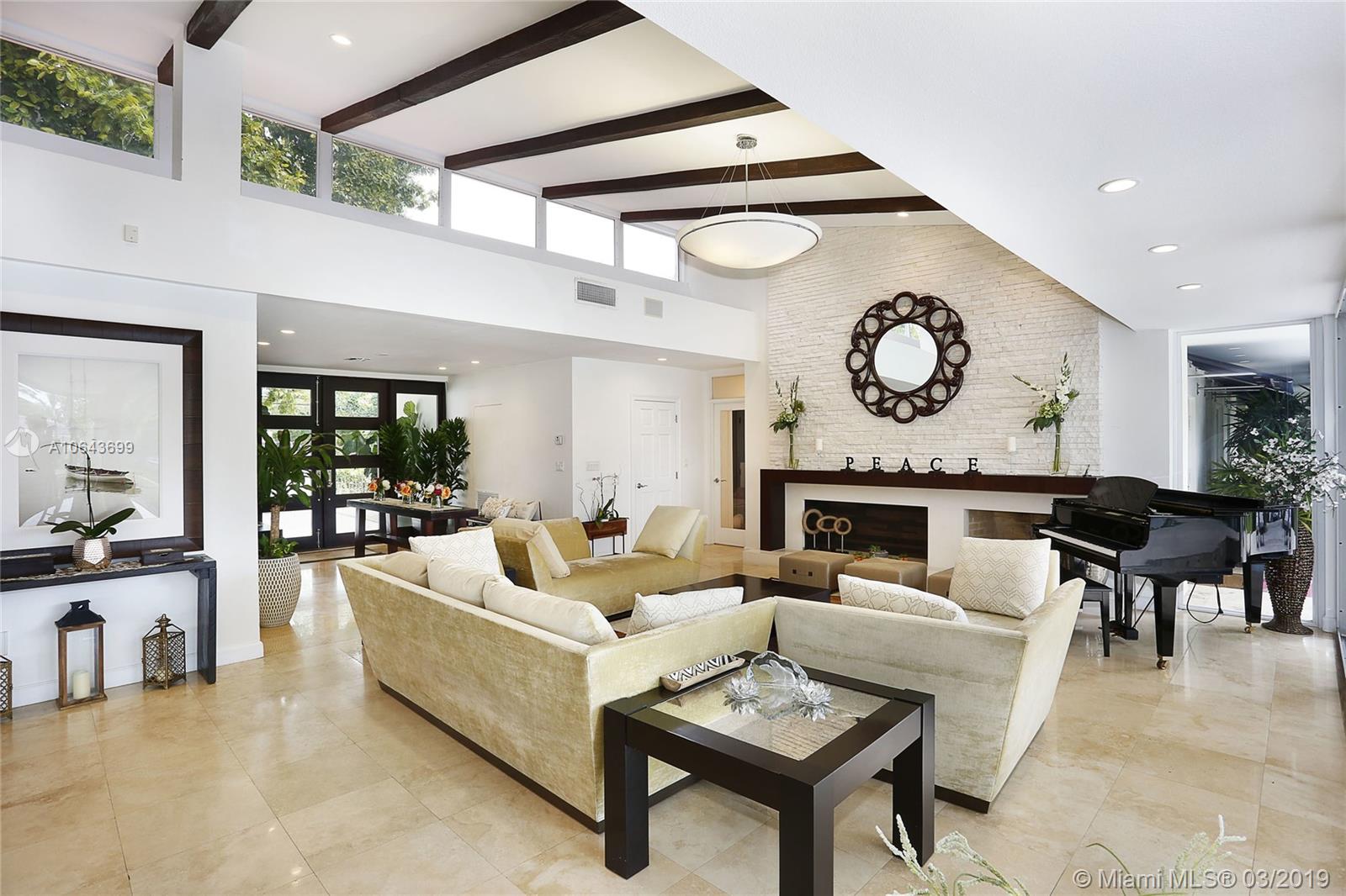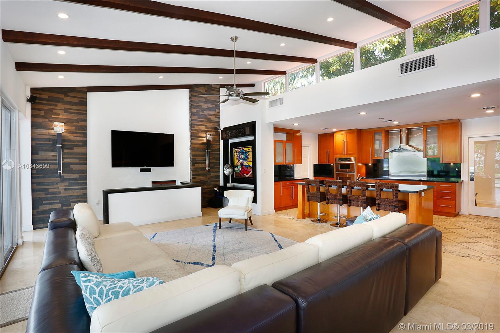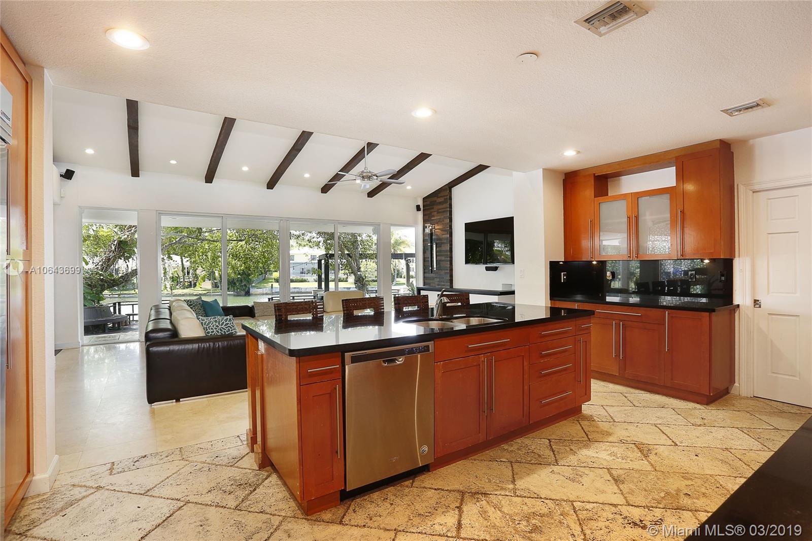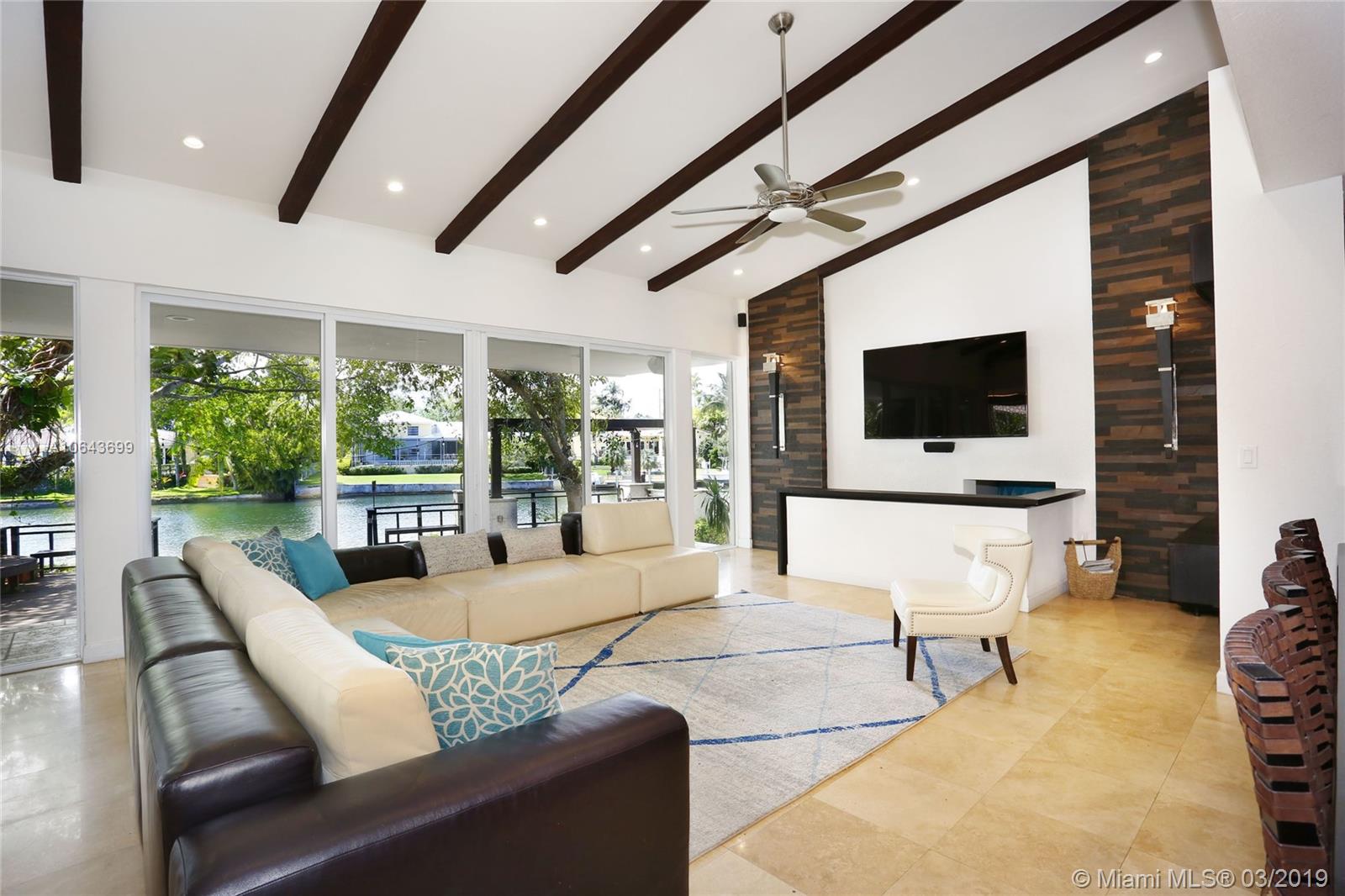 Set perfectly on .75 acre waterfront lot, this spacious home offers a serene setting for ultimate relaxation or large scale entertaining. Immediately upon entering the home you are amazed by the glorious view of the waterway through the floor to ceiling doors. With an open floor plan, featuring great room and volume ceilings, this home has been substantially updated, including impact windows and doors. The master suite and 3 family bedrooms with en-suite baths are located to one side. On the opposite side are 2 additional bedrooms with en-suite baths for grown children, in-laws or live-in help. The spectacular pool deck with built-in seating is perfect for entertaining or dining al fresco. Private beach setting overlooking the waterway is perfect for sunbathing and relaxing by the water.