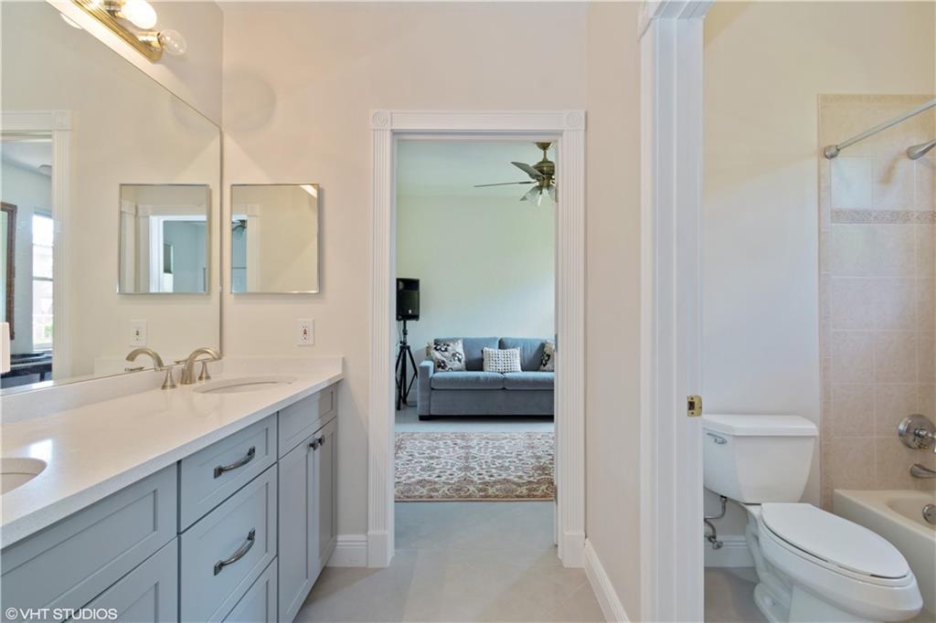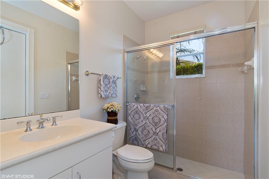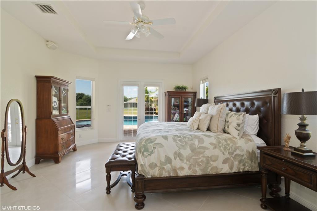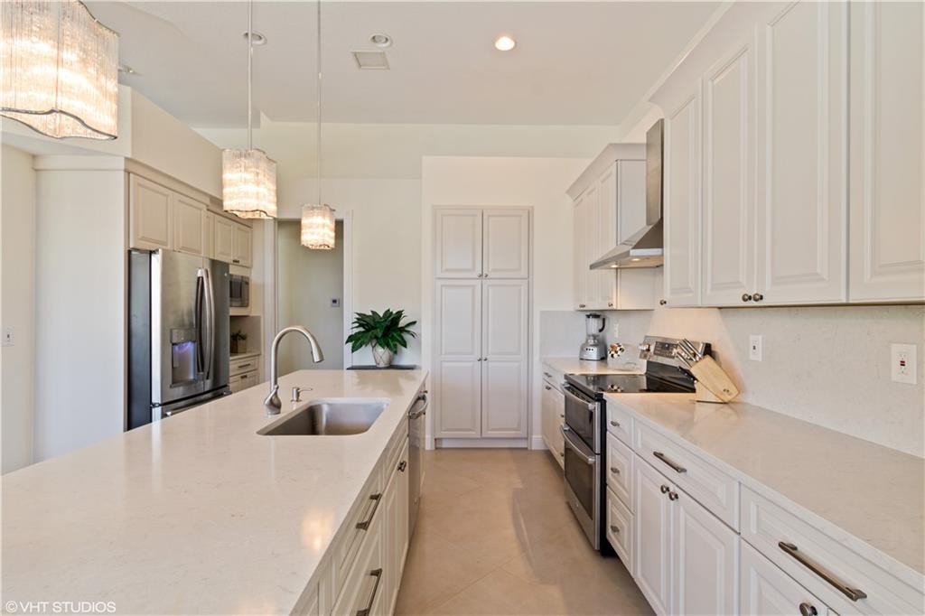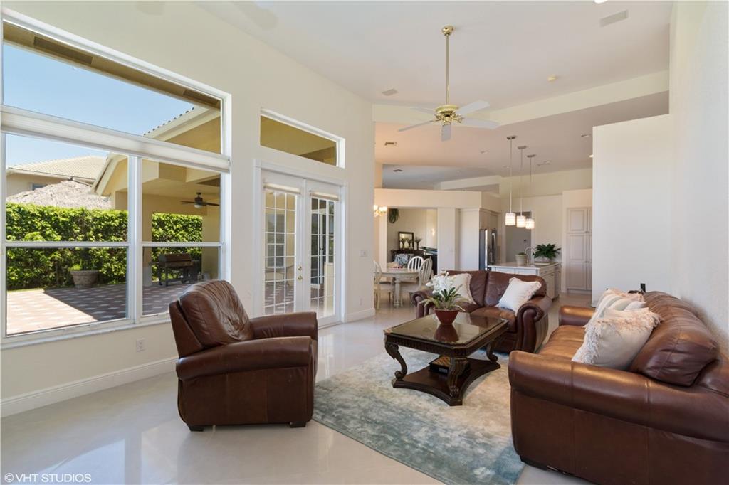Open the doors to this beautiful home and the view of the pool and the golf course through the sliding doors will transport you to paradise! Better than a model! 32" tile on the diagonal throughout. The truly gourmet kitchen is a chef's delight complete with a stainless steel appliance package and a contemporary design/colors including a long center island. A large family room adjoining the kitchen. Formal living room and charming dining room. Triple split bedroom plan. Spacious master with a luxurious master bath with dual sinks and a large tub and separate shower. Jack and Jill bathroom for bedrooms 2 & 3. Separate suite off of the family room with full hallway bathroom. Interior laundry room. Three car garage. Sparkling pool and covered patio with lovely golf course views. Guard gated!