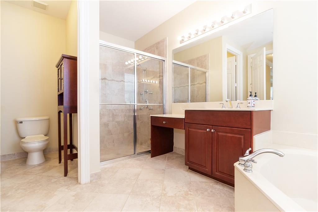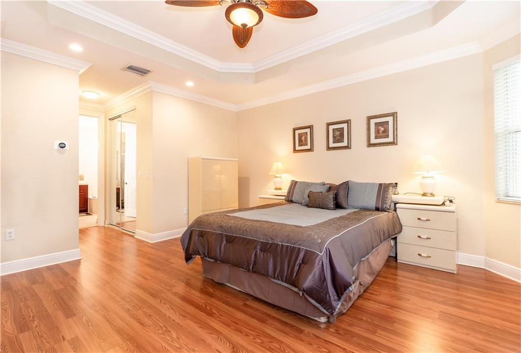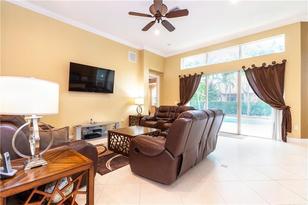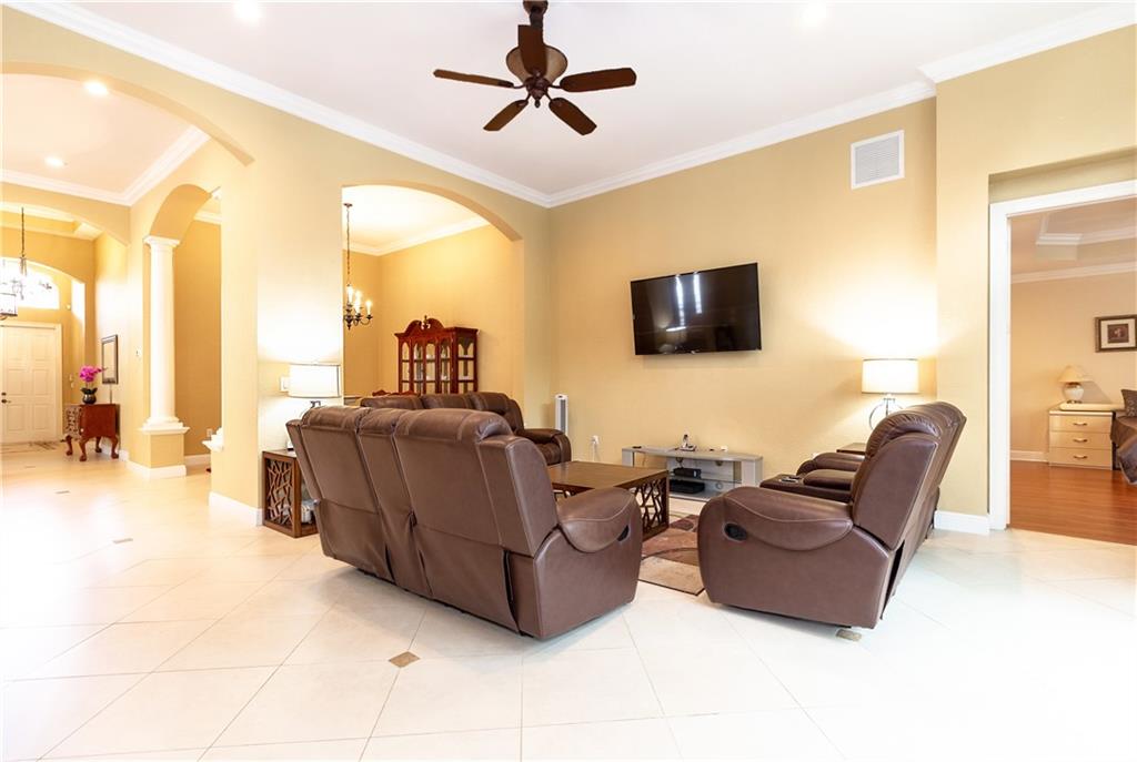 Gorgeous upgraded one story pool home. Large gourmet kitchen with real wood cabinets, granite countertops, double oven, wine cooler, breakfast area and snack bar. Volume ceiling, crown molding, tile flooring in main living areas, wood flooring in bedrooms. Master bedroom has two large walk-in closets w/closet organizers. Large master bath with two vanities, large shower and separate bathtub. Peaceful backyard with free form pool & sitting area. Newer A/C units w/nest thermostats & hot water heater, generator transfer switch recently installed. Accordion shutters, 3 car garage with garage organizer & shelving. Home is completely move in ready!