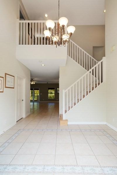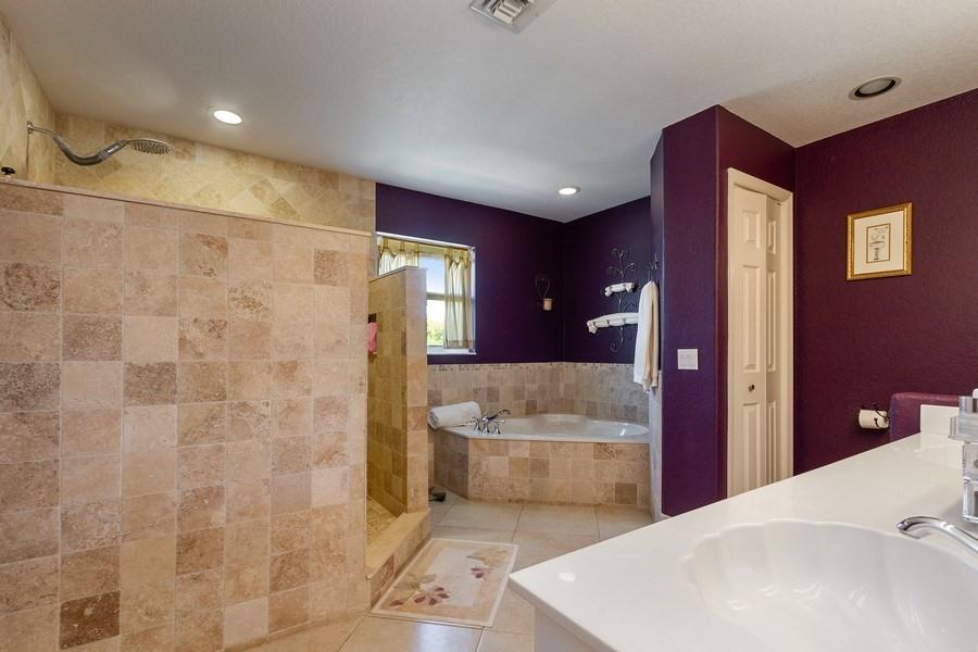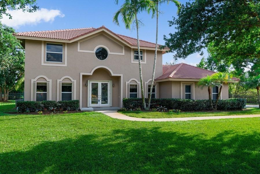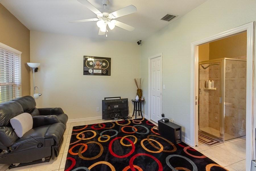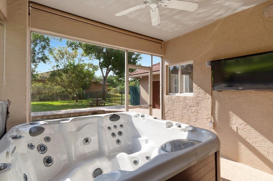 Beautiful home ready for large family on builders acre, with invisible doggie fence, on a cul de sac street with lovely homes. Huge great room with French doors, lots of windows, electronic doggie door, surround sound. crown molding. Big kitchen overlooking great room, with stainless steel appliances and granite counters. Big laundry room. Two bedrooms down stairs one with on suite bathroom, the other can be bedroom or formal dining room. Hot tub in good working condition on patio with TV. 2 car side entry garage with large storage area, big driveway for many cars. Master bedroom upstairs with sitting area. Master bath remodeled with huge walk in shower. 2 additional bedrooms upstairs with their own on suite bathrooms. Impact windows upstairs and accordion shutters downstairs.