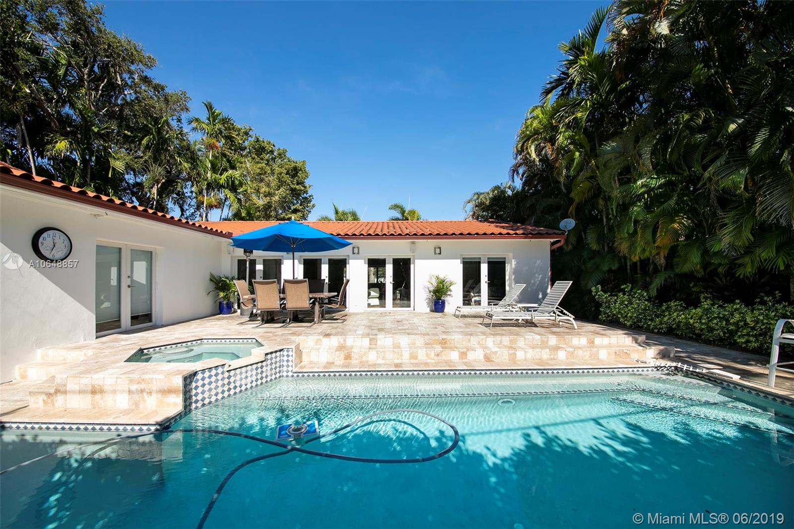Miami Shores at its best! Fully updated 3/2 on a quiet street close to Biscayne Bay. Open living floor plan is perfect for indoor / outdoor entertaining. Split bedrooms afford privacy with upgraded interior doors for sound protection. Kitchen has great counter space, stainless steel appliances and a breakfast bar. Recessed lighting, impact windows and doors, 2 car garage, closet built-ins and more! Master Bedroom, 2nd bedroom and living area all open on to patio and tropically landscaped yard, custom designed 50' pool and jacuzzi. Move in ready!