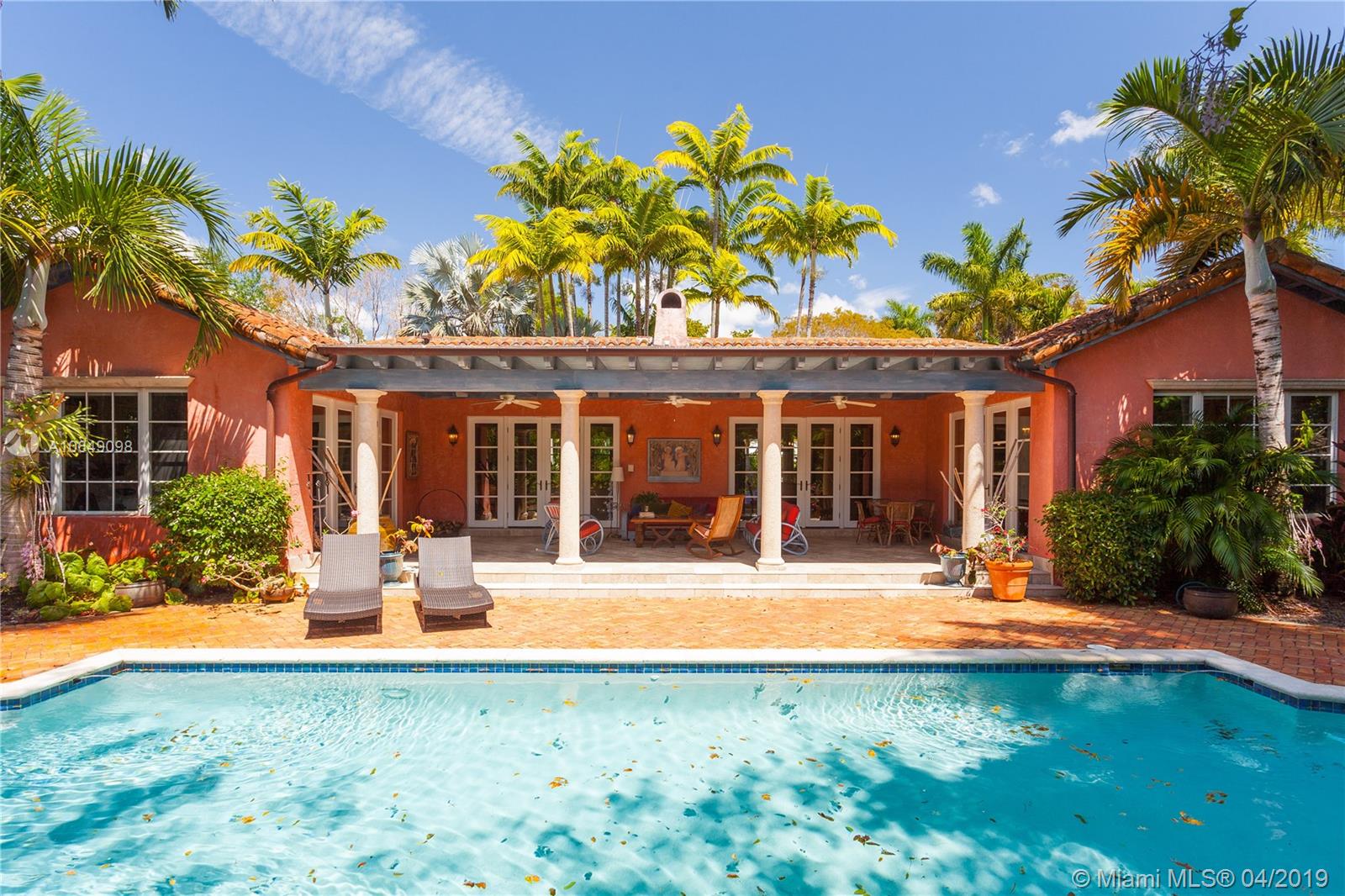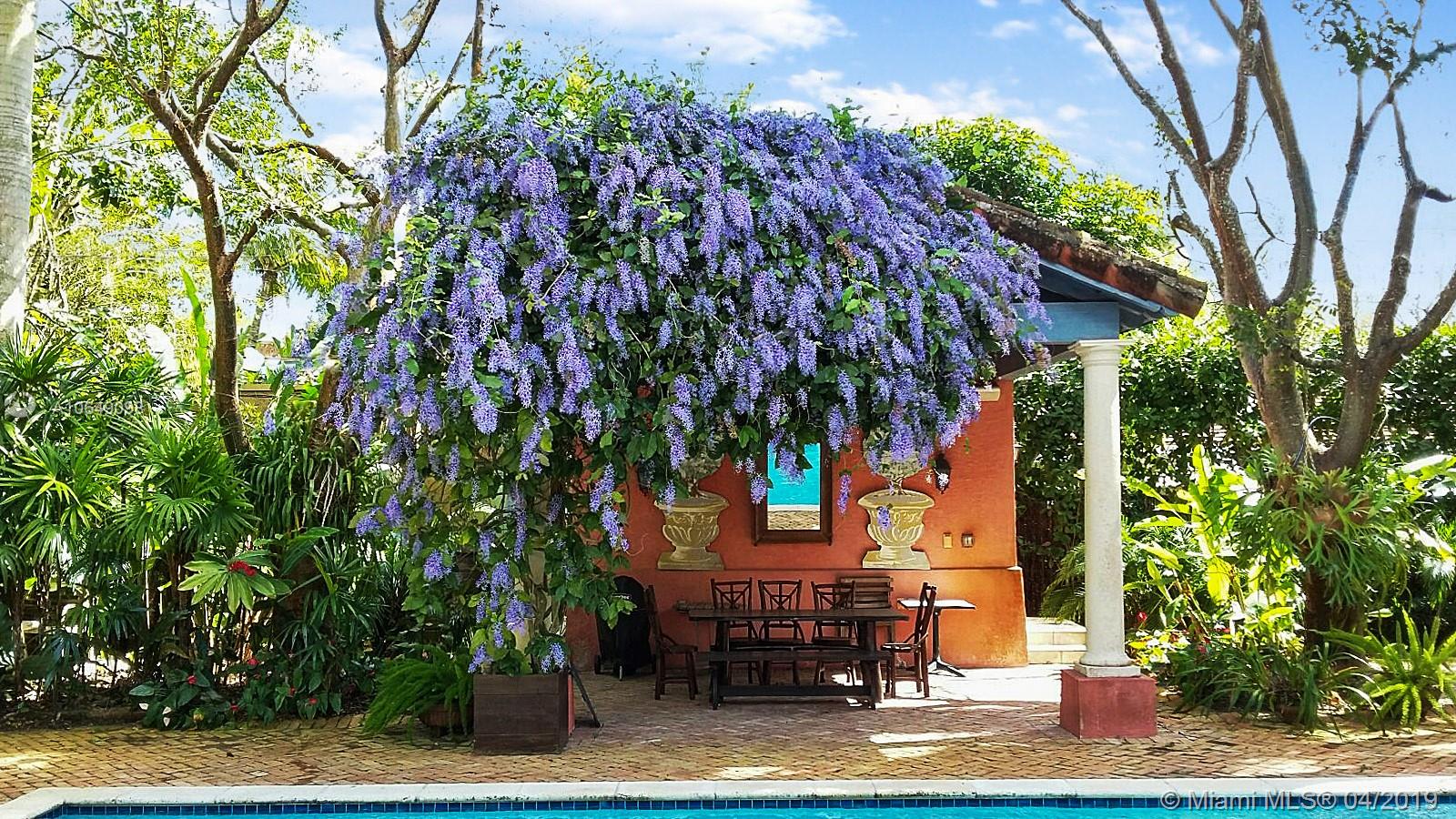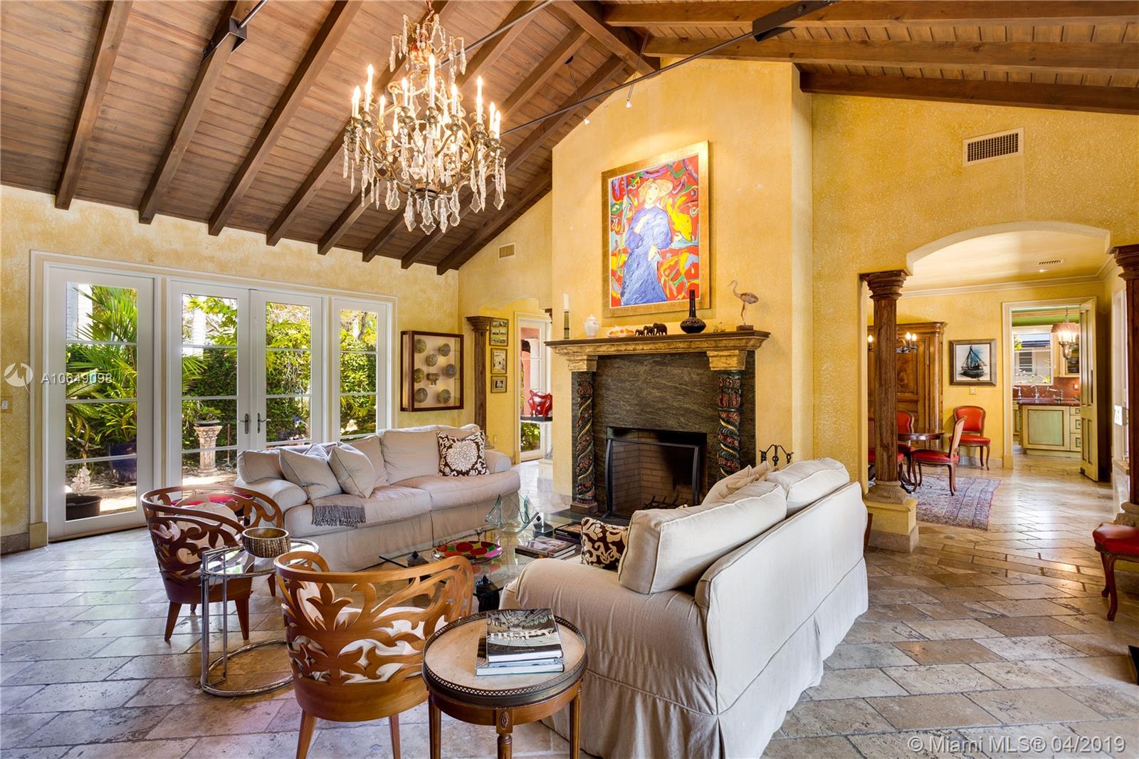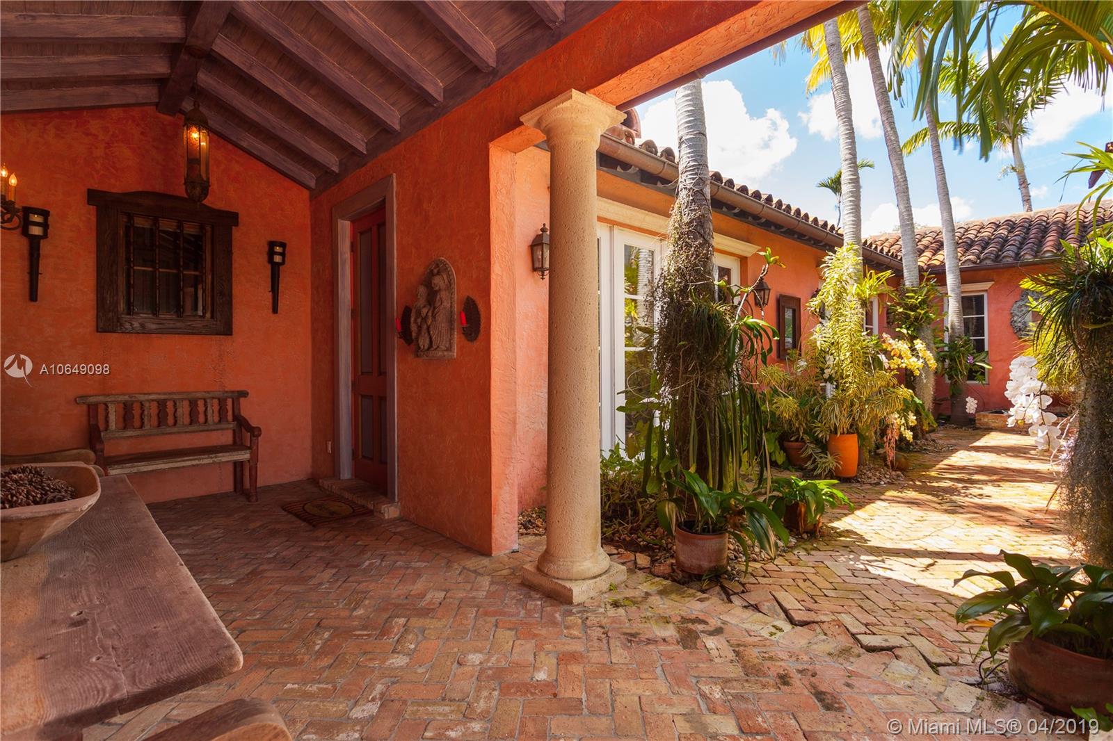 Built in 2000 this remarkable 4031 actual square foot 3 bedroom 3.5 bath replica of a Spanish Colonial Hacienda was designed by renown architect, Luis Jauregui with landscaping by Lester Pancoast. Built in a classic H shape to maximize openness to nature, breezes and natural light. The loggia entry leads past a serene courtyard of rare palms & orchids to the main entrance gallery. The main salon has a 14' tall open timbered ceiling and a wood-burning fireplace. Floors throughout the home are tumbled Travertine marble. Impact doors & windows throughout. Formal dining room, chef's style kitchen open to a family room. In the bedroom wing there is a master suite + two other bedrooms. Cabana house with bath. 40' pool. 100'X150' lot. Sublime Old World architecture with every modern convenience.