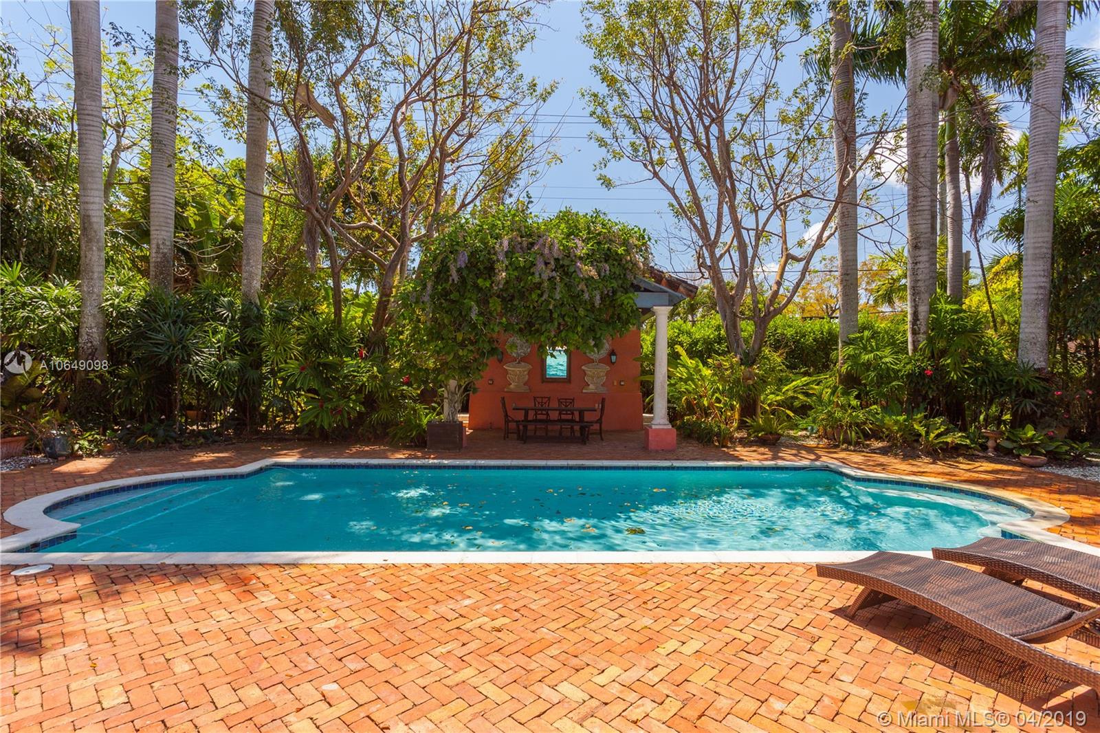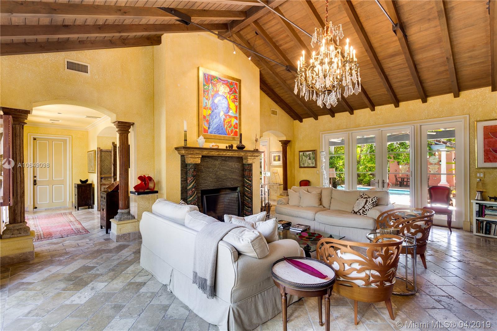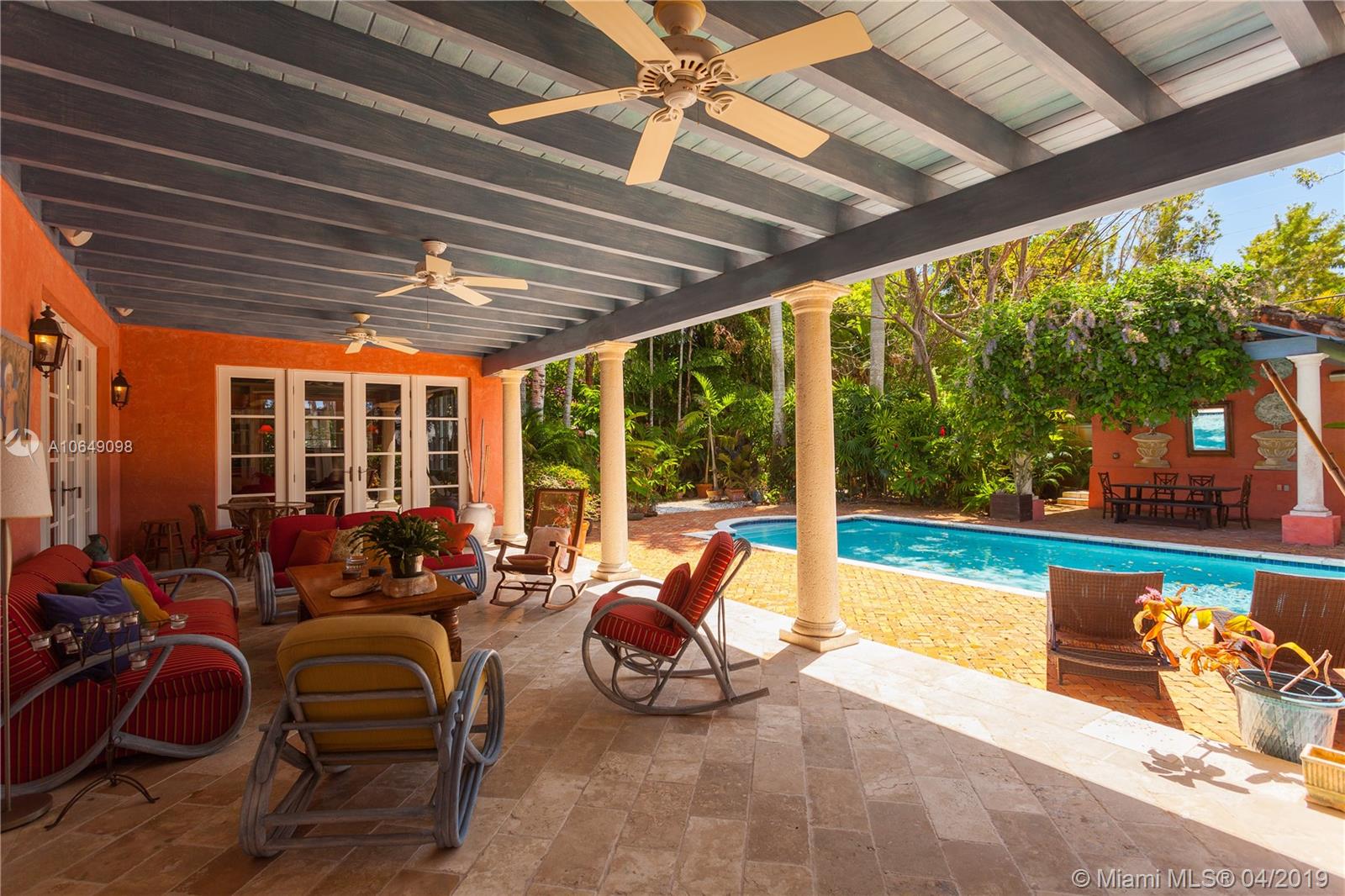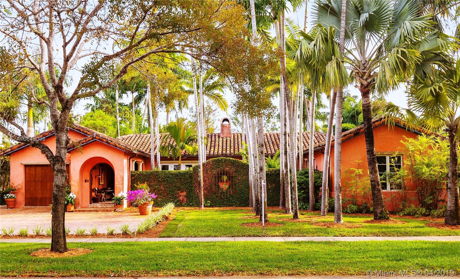 Built in 2000 this remarkable 4031 actual square foot 3 bedroom 3.5 bath replica of a Spanish Colonial Hacienda was designed by renown architect, Luis Jauregui with landscaping by Lester Pancoast. Built in a classic H shape to maximize openness to nature, breezes and natural light. The loggia entry leads past a serene courtyard of rare palms & orchids to the main entrance gallery. The main salon has a 14' tall open timbered ceiling and a wood-burning fireplace. Floors throughout the home are tumbled Travertine marble. Impact doors & windows throughout. Formal dining room, chef's style kitchen open to a family room. In the bedroom wing there is a master suite + two other bedrooms. Cabana house with bath. 40' pool. 100'X150' lot. Sublime Old World architecture with every modern convenience.