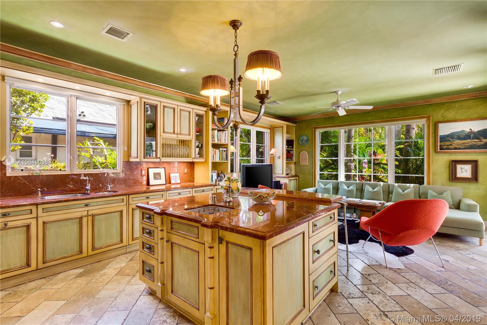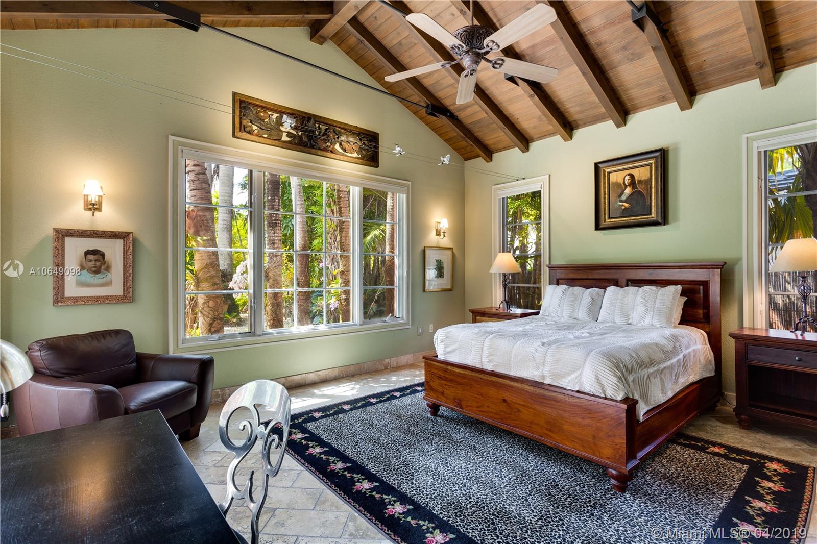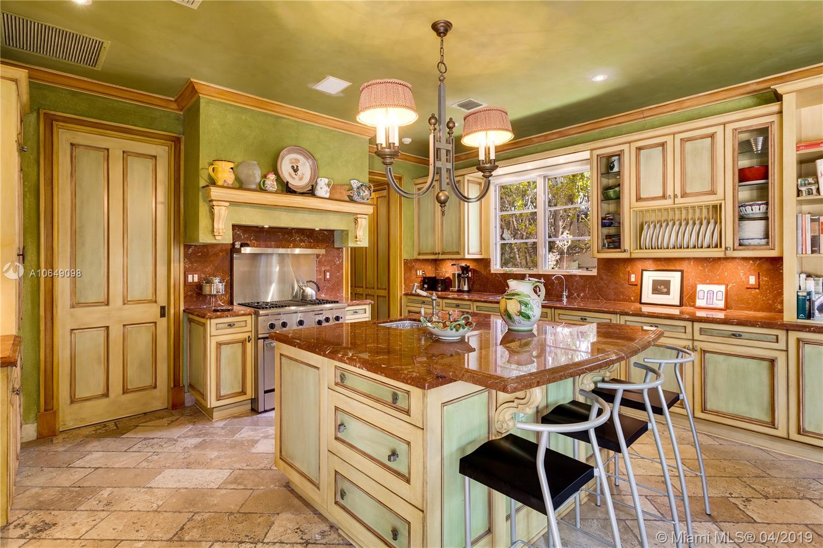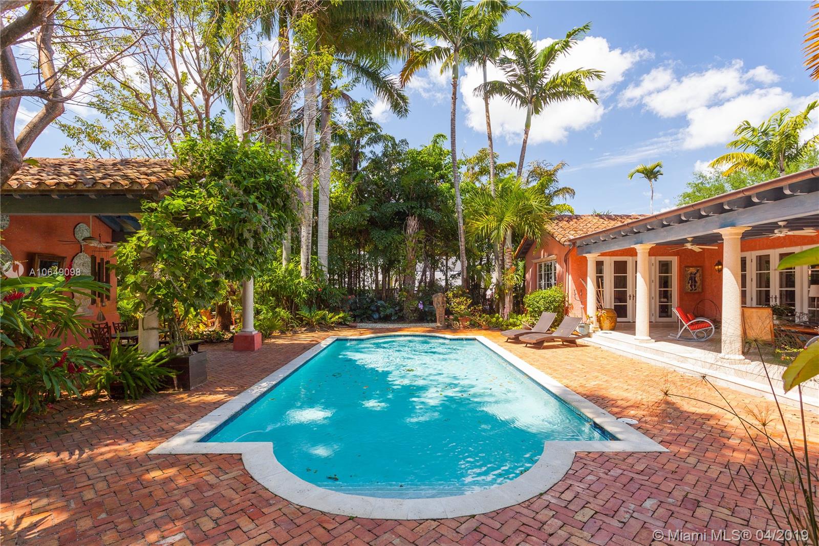 Built in 2000 this remarkable 4031 actual square foot 3 bedroom 3.5 bath replica of a Spanish Colonial Hacienda was designed by renown architect, Luis Jauregui with landscaping by Lester Pancoast. Built in a classic H shape to maximize openness to nature, breezes and natural light. The loggia entry leads past a serene courtyard of rare palms & orchids to the main entrance gallery. The main salon has a 14' tall open timbered ceiling and a wood-burning fireplace. Floors throughout the home are tumbled Travertine marble. Impact doors & windows throughout. Formal dining room, chef's style kitchen open to a family room. In the bedroom wing there is a master suite + two other bedrooms. Cabana house with bath. 40' pool. 100'X150' lot. Sublime Old World architecture with every modern convenience.