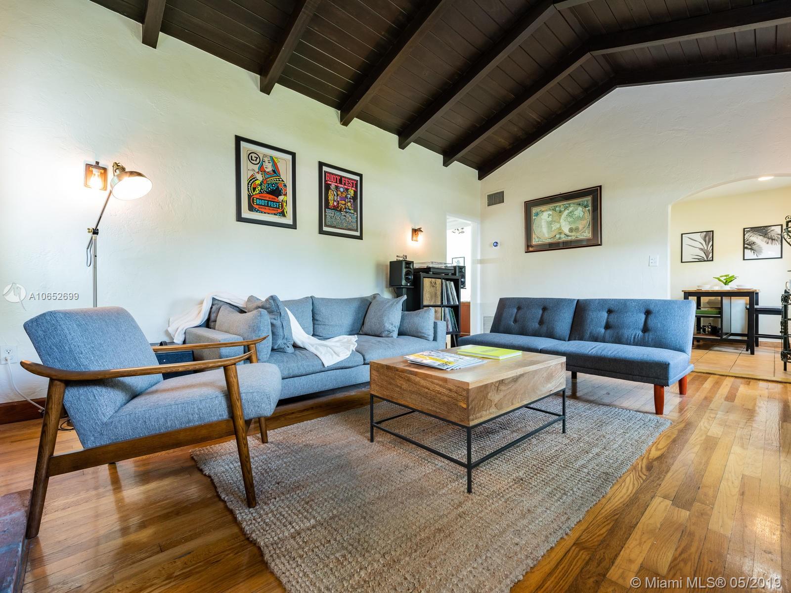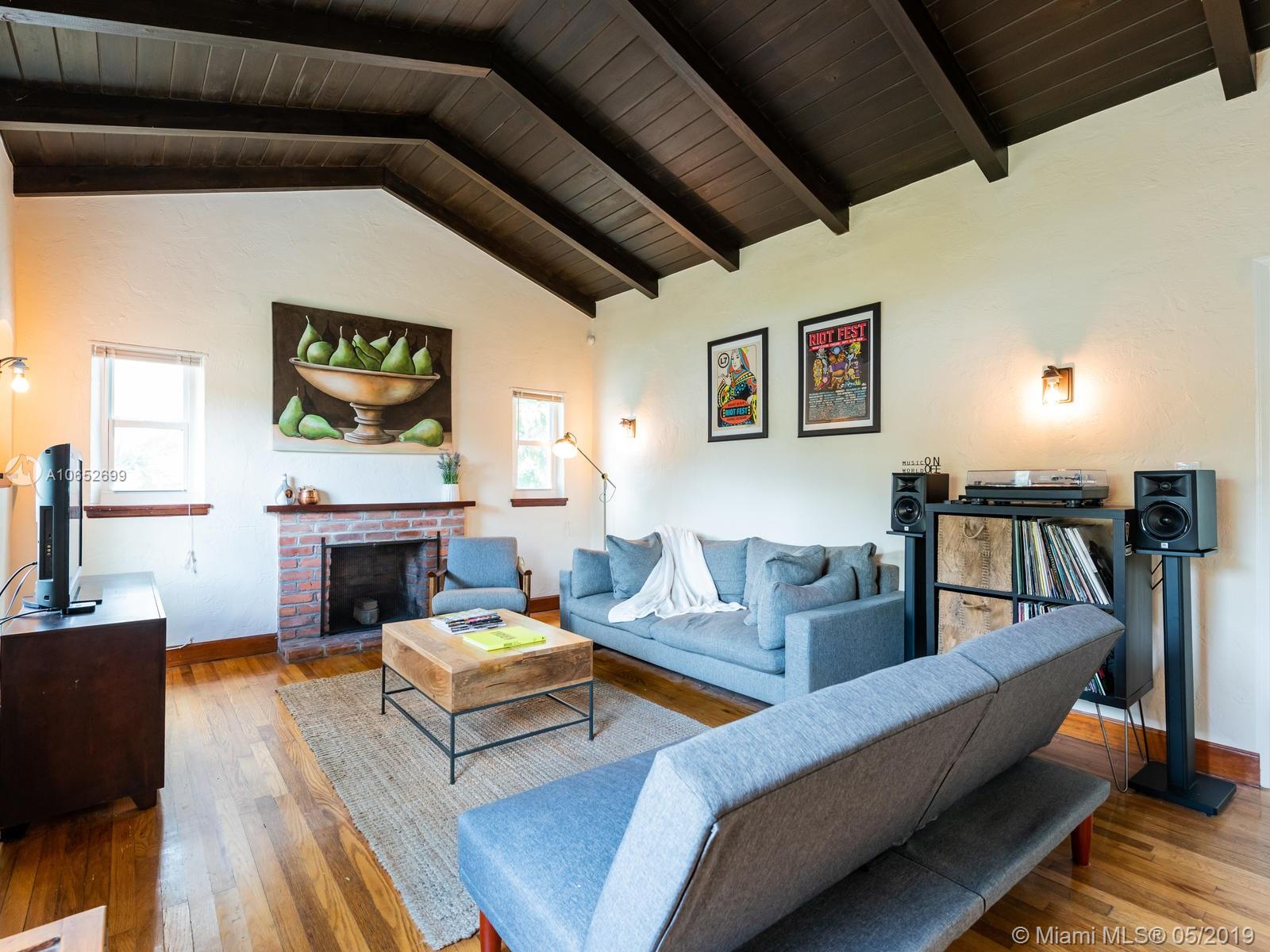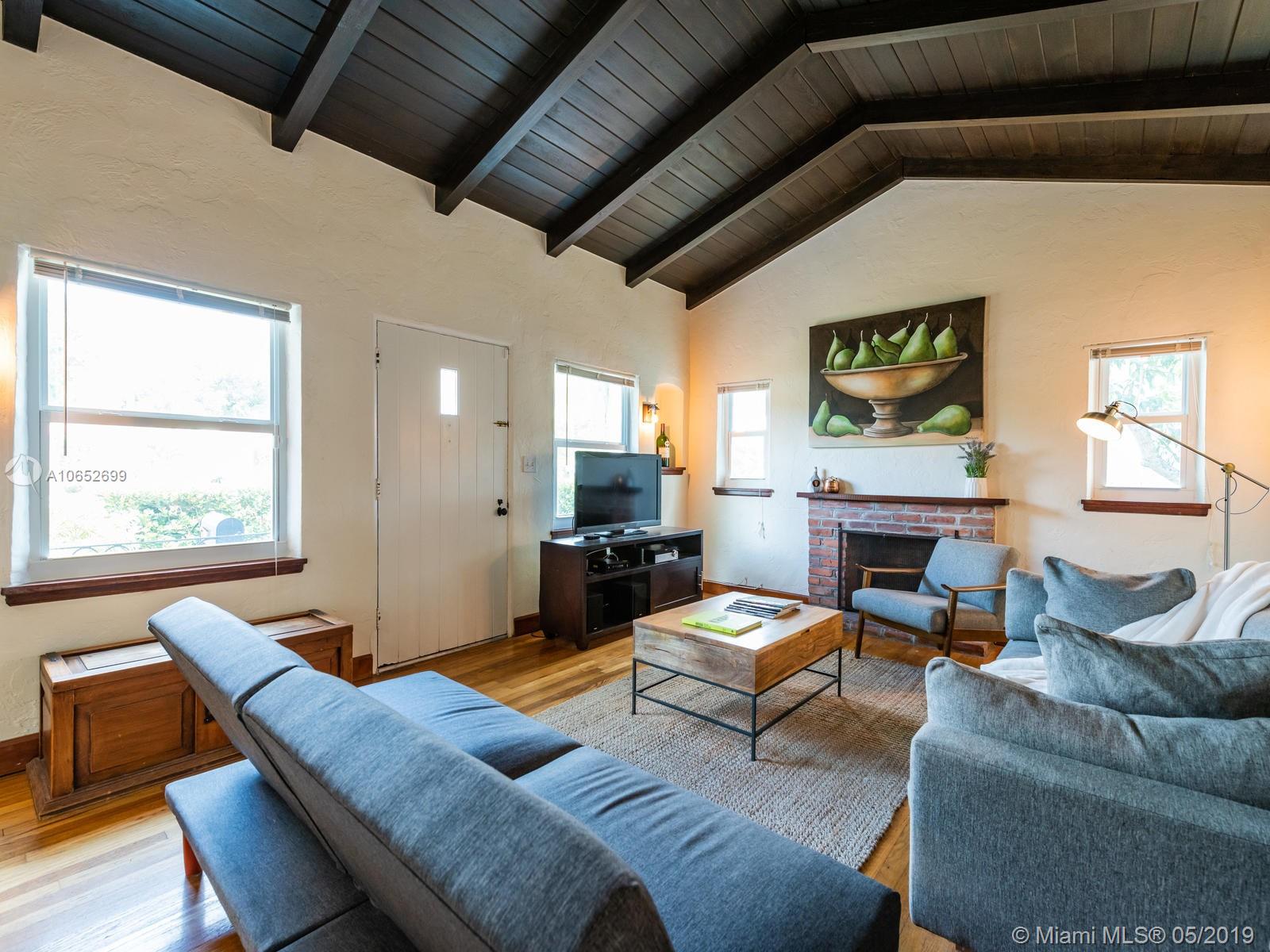 BLUE SHORES NIRVANA - It’s all blue skies and breezy vibes at this adorable 2/1 Shores bungalow with its massive backyard perfect for relaxing afternoons and evening entertaining. Step into the impressive great room with vaulted wood beam ceilings and you’ll find a home that’s been lovingly cared for with rare and charming period details throughout. Just two blocks from Downtown Miami Shores, this home features new hurricane impact windows, newer A/C, original hardwood floors, original working fireplace, updated electric, and a detached one-car garage. This is your chance to have your own little slice of heaven in the Shores at an amazing price!
