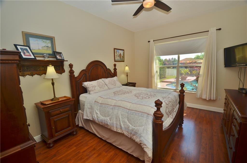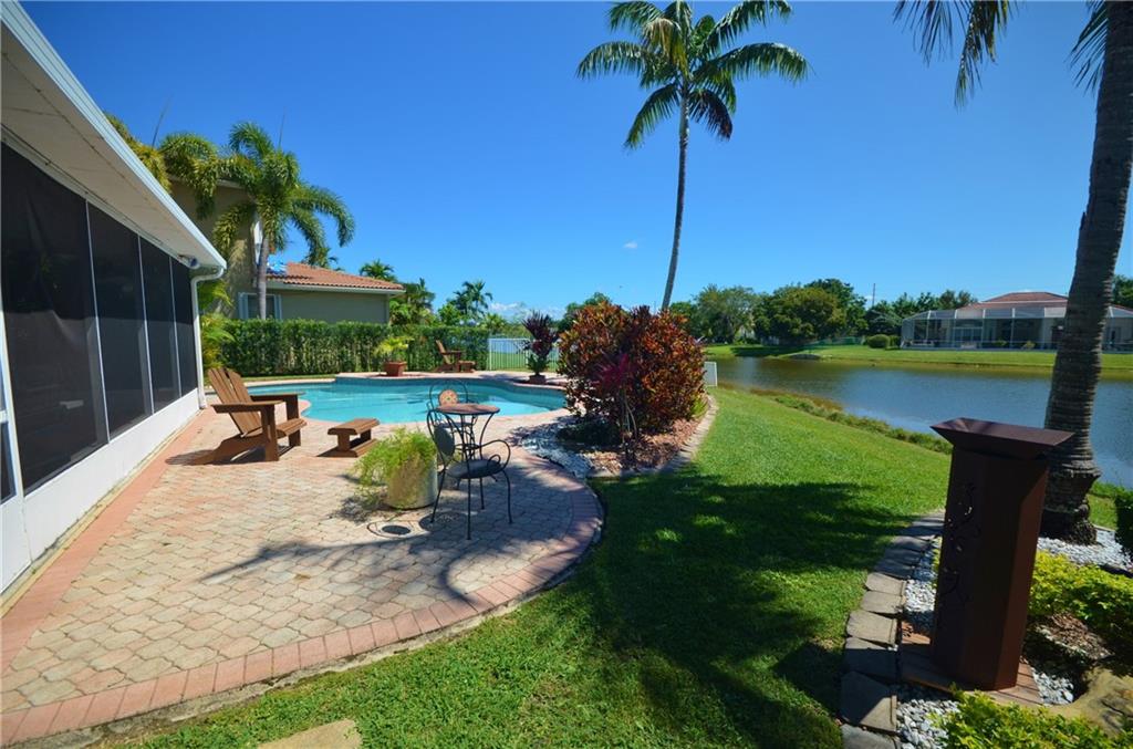 Wow!! Buyers will be happy coming home to this impeccable 1 story home on the cul-de-sac. Inviting Pool and Lake views!! From the foyer, and Living areas, you will enjoy the glowing tile flooring along with Laminate wood-like flooring in 2 of the bedrooms. This True 4 Bedroom model offers a split bedroom plan, with spacious closets; some with built-ins. The Stunning Kitchen, will leave nothing to be desired, with the wood cabinetry, Granite, Stainless appliance package, and a sunny breakfast nook. Master Bath and 2nd Bath have also been renovated with lovely cabinetry and counters. The full sized screened/roofed patio is tiled & ready for your family and friends to enjoy, 24 hour guard gated community....Tot Lot...Great School District and Low HOA fees for the area!