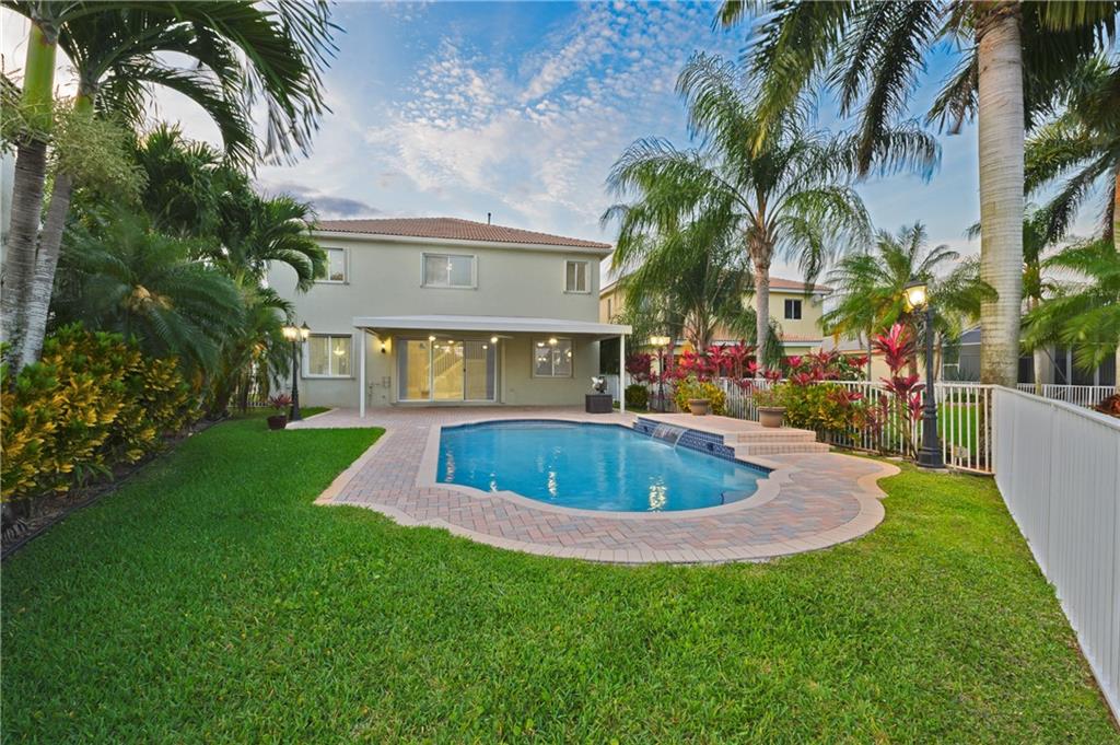 You'll love this gorgeous lake view 2-story home located in the highly desirable community of Laguna Isles. This immaculate house has everything you could wish for! 5/4 plus den. Every detail was carefully selected using the highest quality materials! Top-of-the-line chef's kitchen, NATURAL GAS STOVE - one piece natural Quartzite island, two new A/C units, Spainish ceramic flooring (32x32), luxurious freestanding tub in master bath. It's what you are looking for! Home is perfect for family fun and entertaining in style. Features a magnificent patio, salt water swimming pool with cascade, spacious covered terrace, accordion shutters, driveway that fits 4 cars.Community features a fabulous clubhouse pool and spa, indoor racket ball and exercise room with tennis courts. A+ Schools.